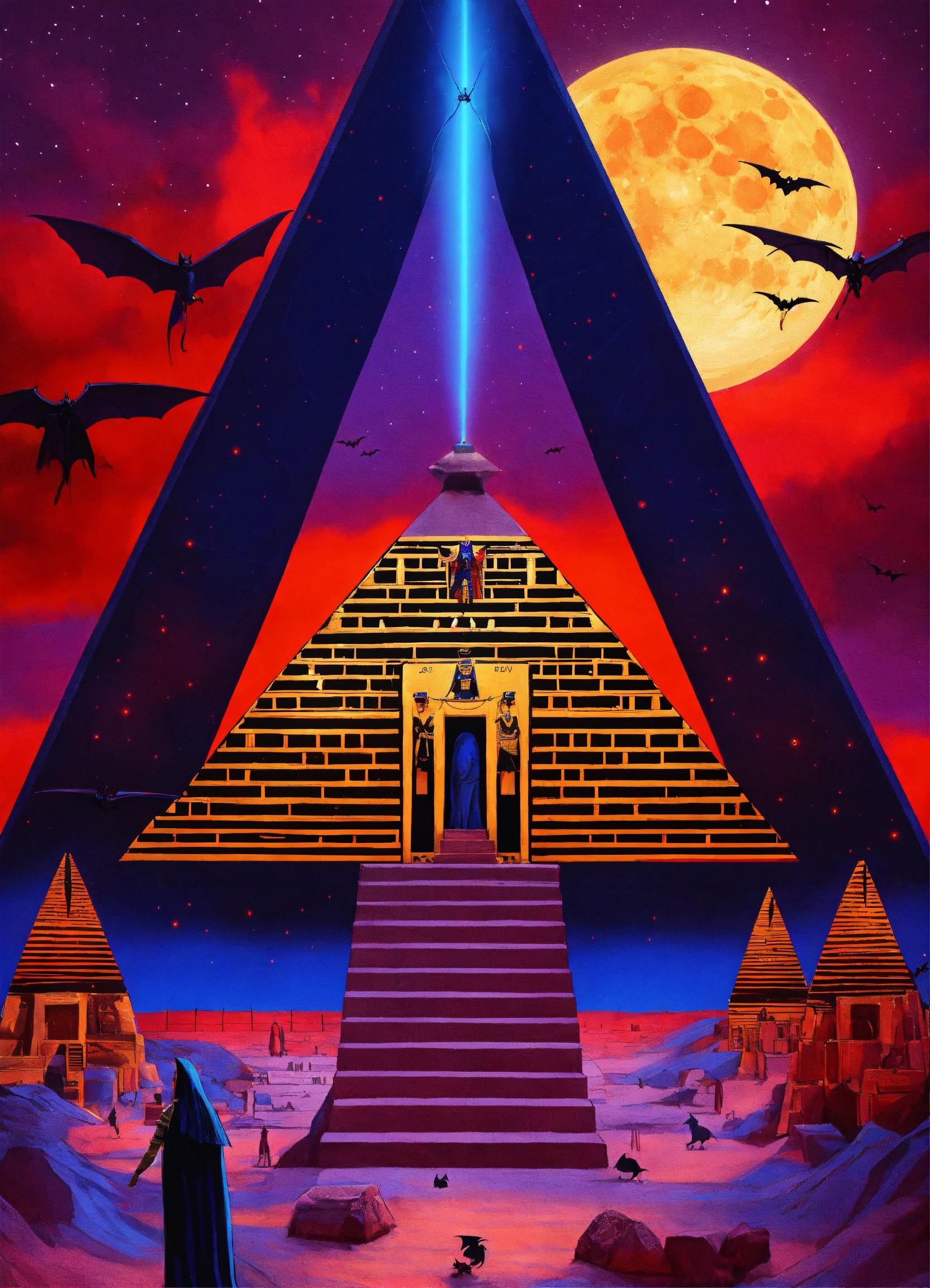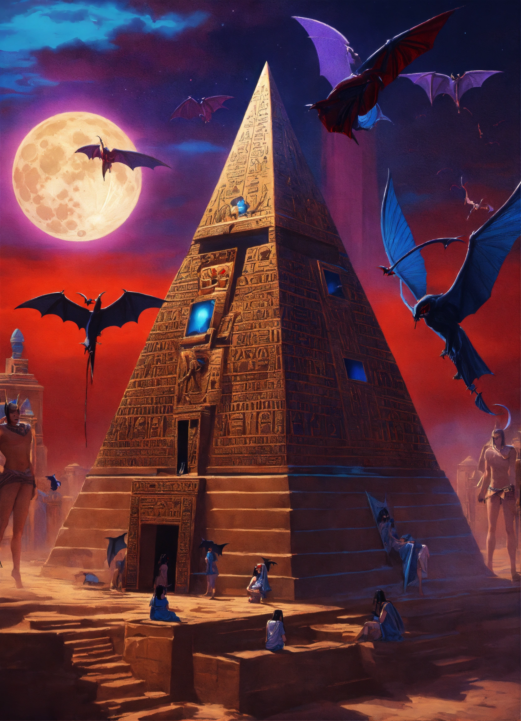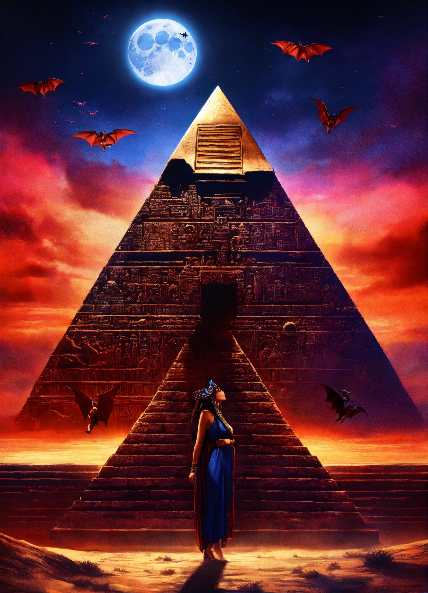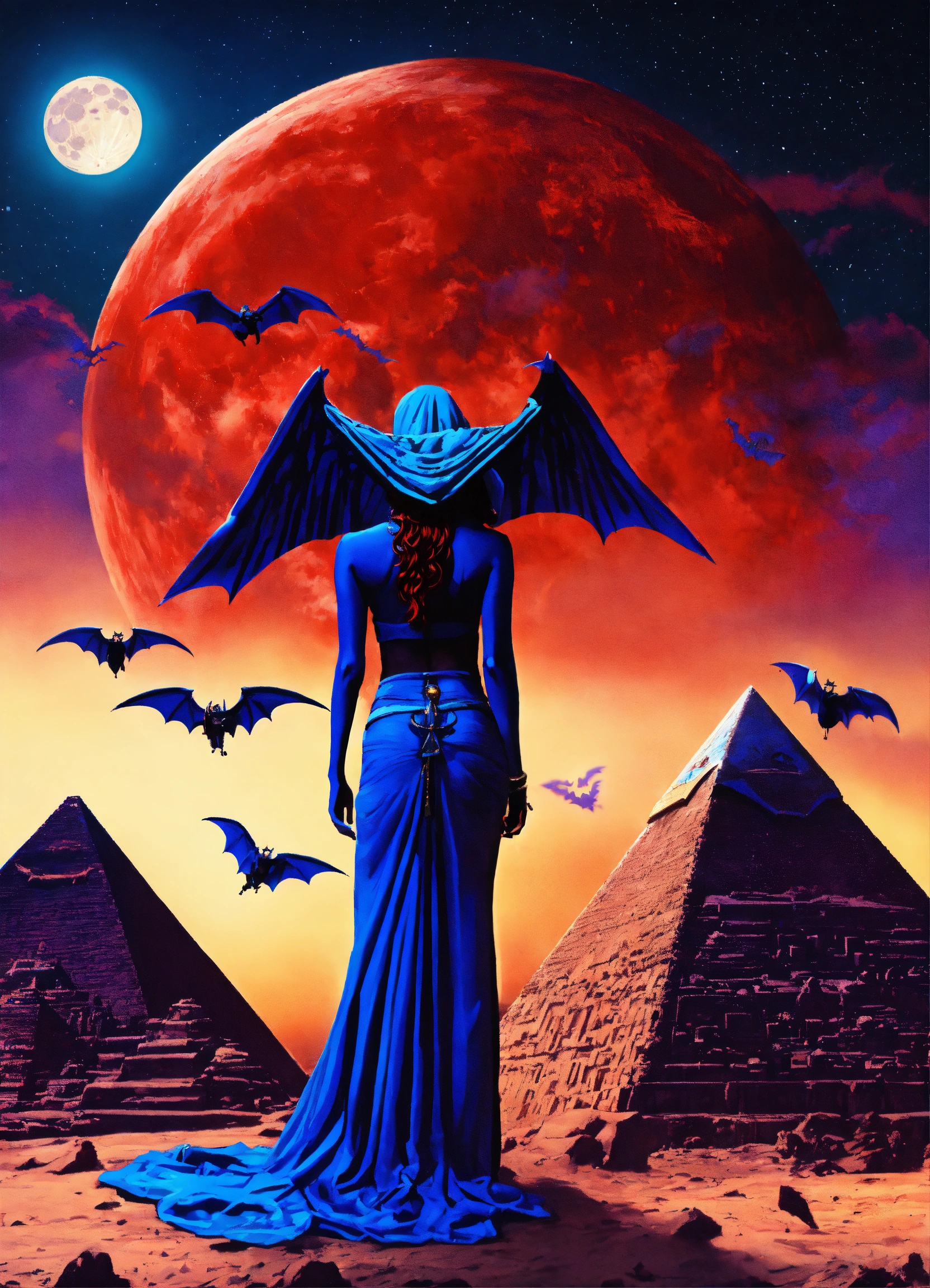 All superrealism style urban egyptian gizeh pyramid vampire style egyptian woman vampire angel of death maat sarcophagus deity astral realm interdimensional flying little bats outdoor big blue moon red purple blue glow despair feeling