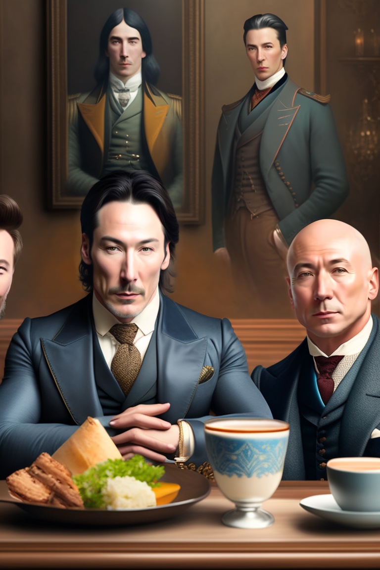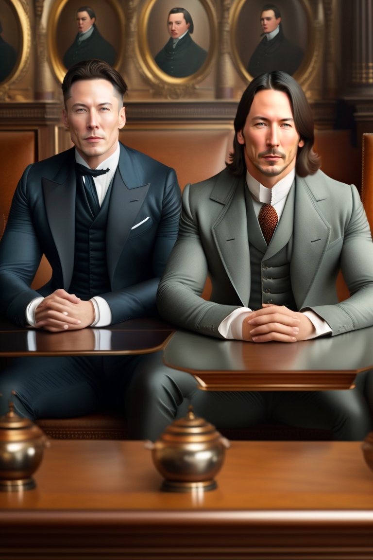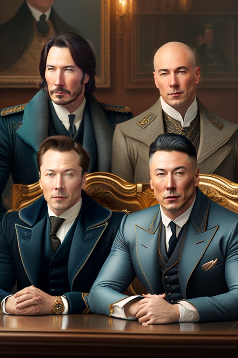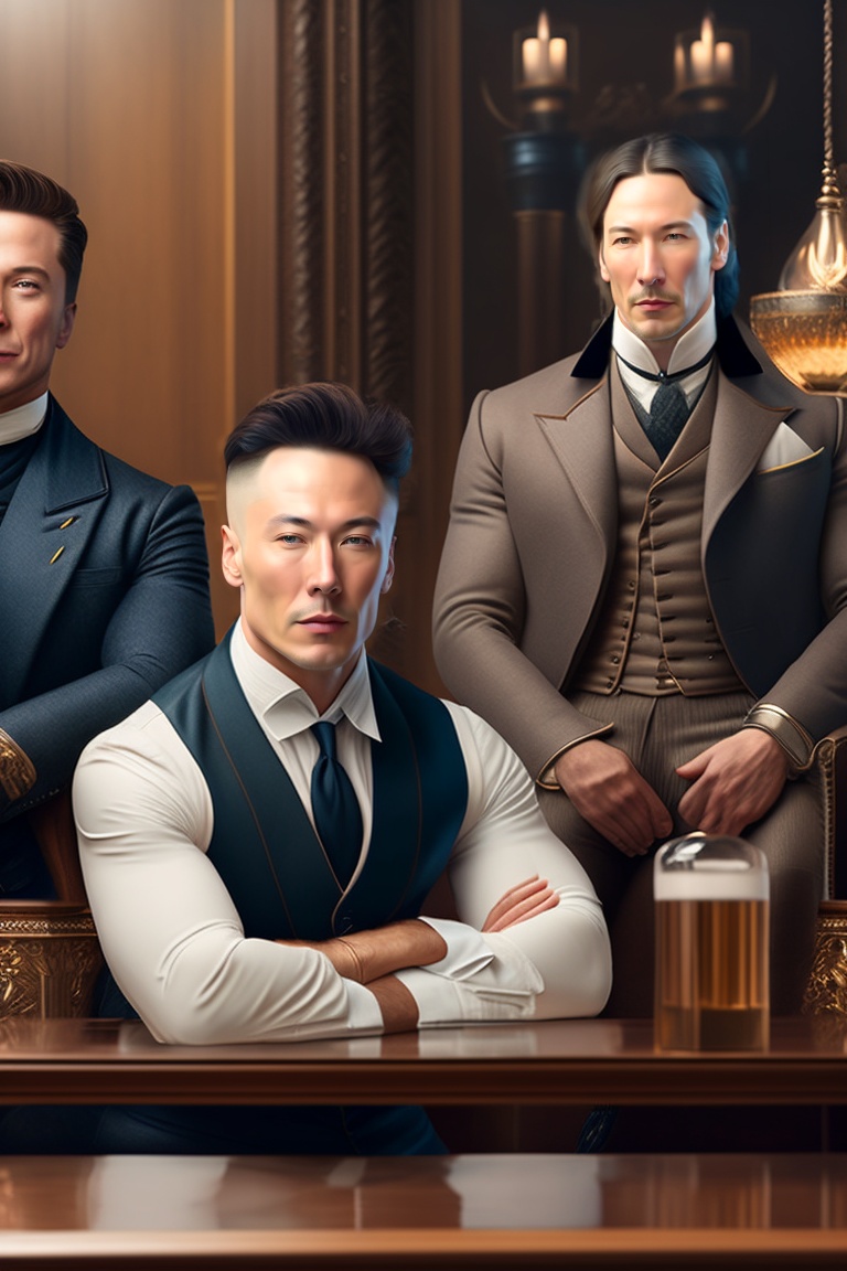 Photo in the style of peaky blinders, elon musk, keanu reeves, and jeff bezos sit across a table. their facial expressions are intense, reflecting a sense of determination and power