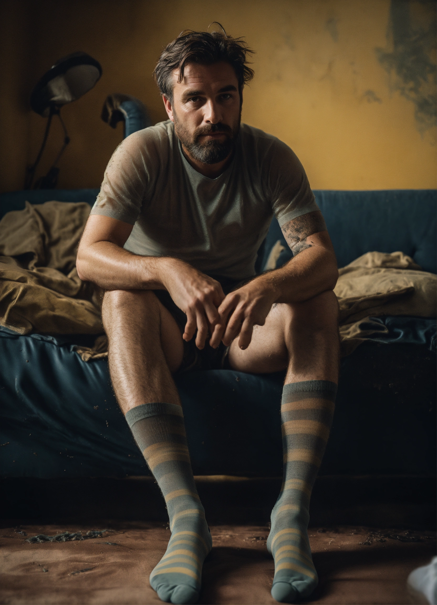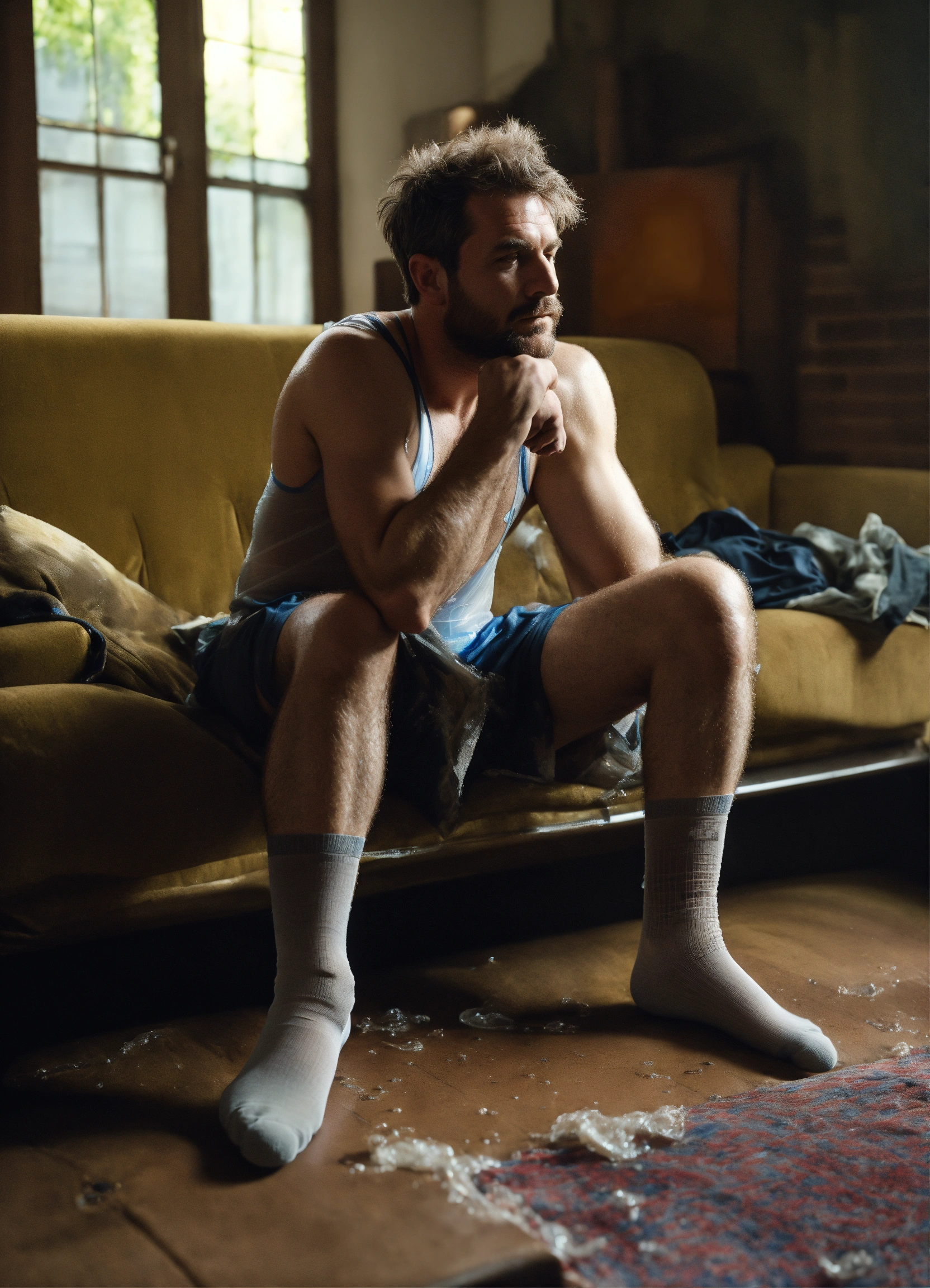 Scruffy british man, wearing transparent dirty underware, and dirty male socks, sitting on a small, old, dirty couch, strong composition, angular viewpoint, 4k, ultra detailed, forties