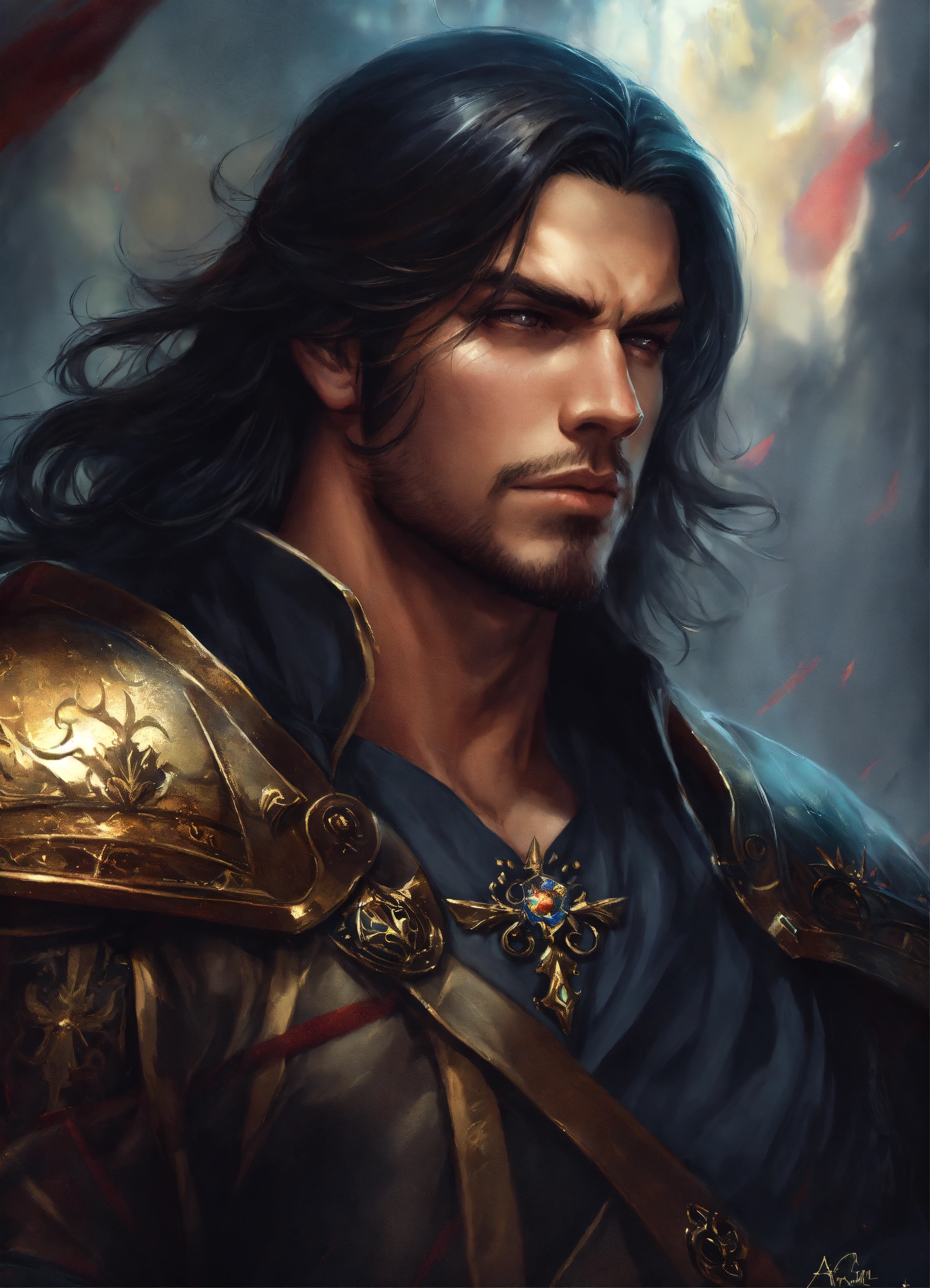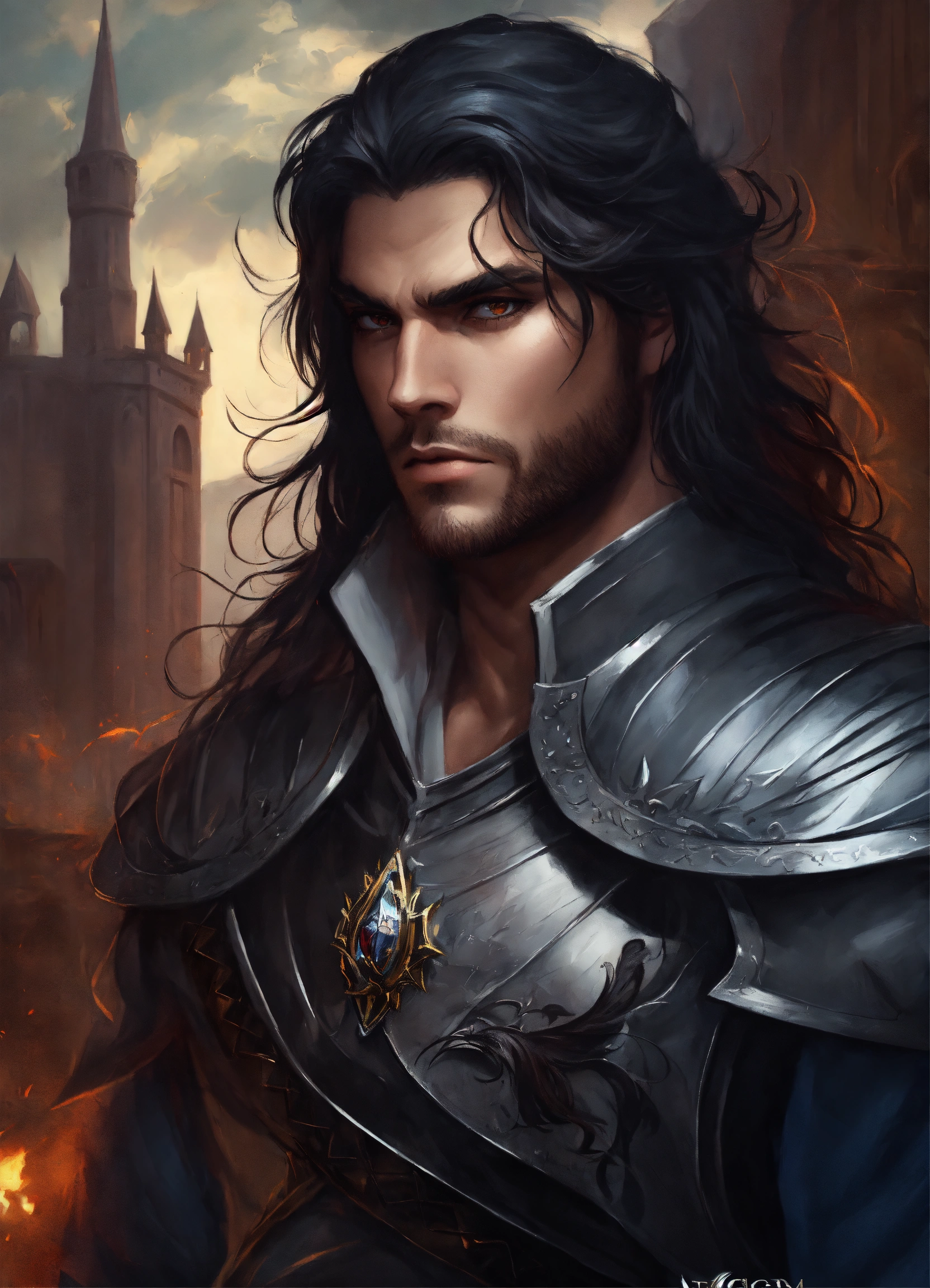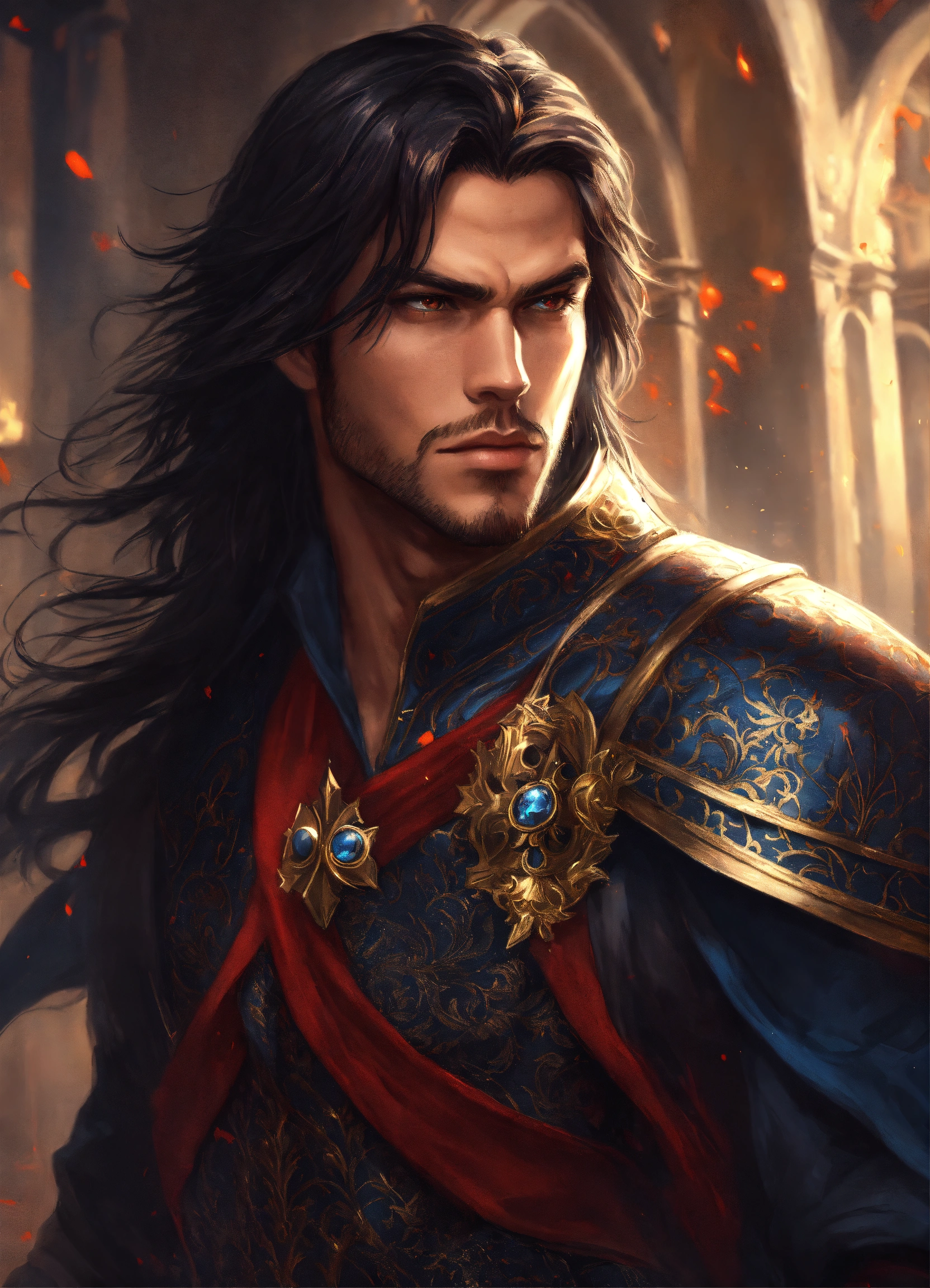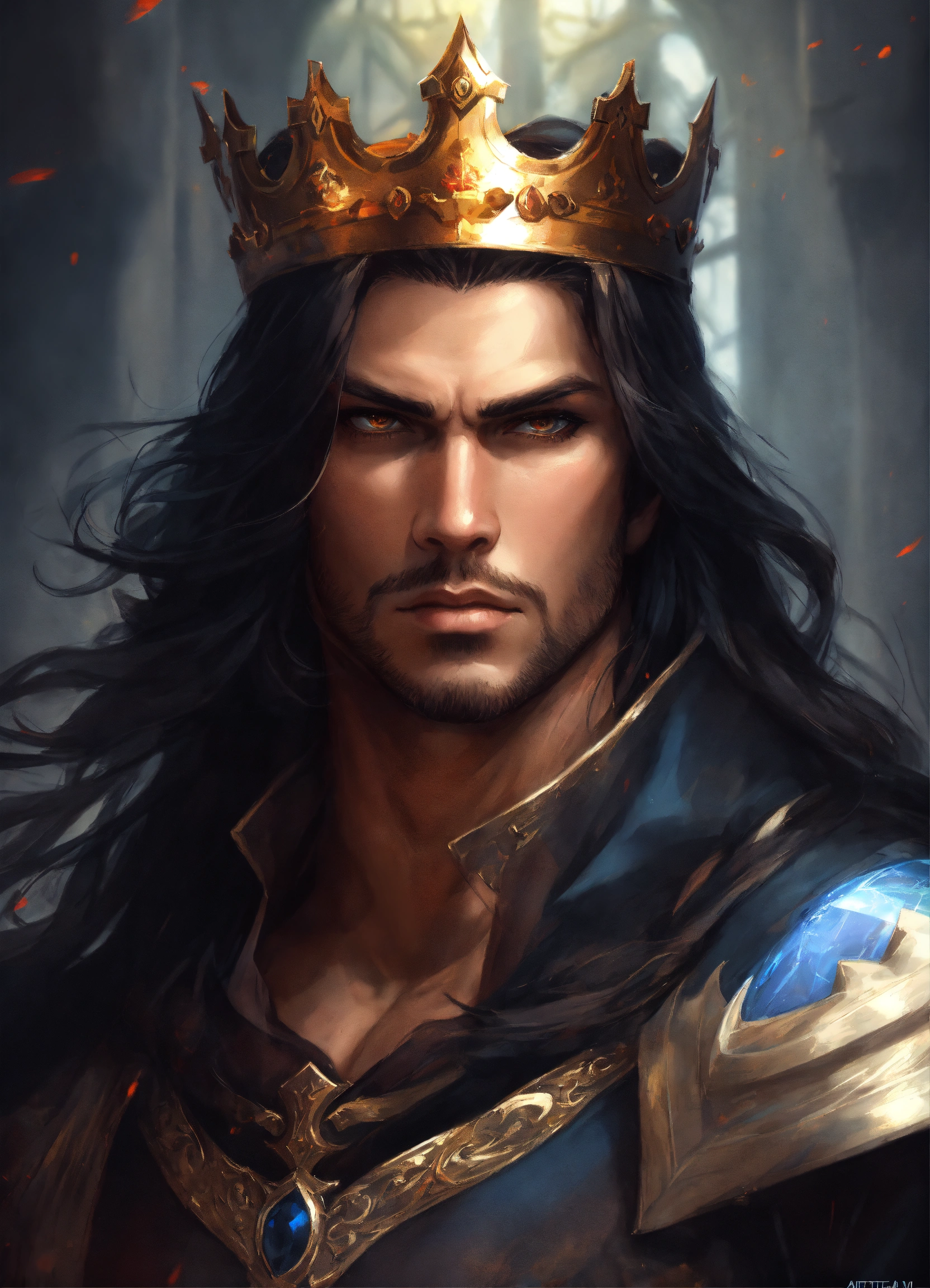 Medieval fantasy, fierce, digital art, art by artgerm, prince, male, rugged, king, evil, handsome man, long hair, crown, black hair, royalty