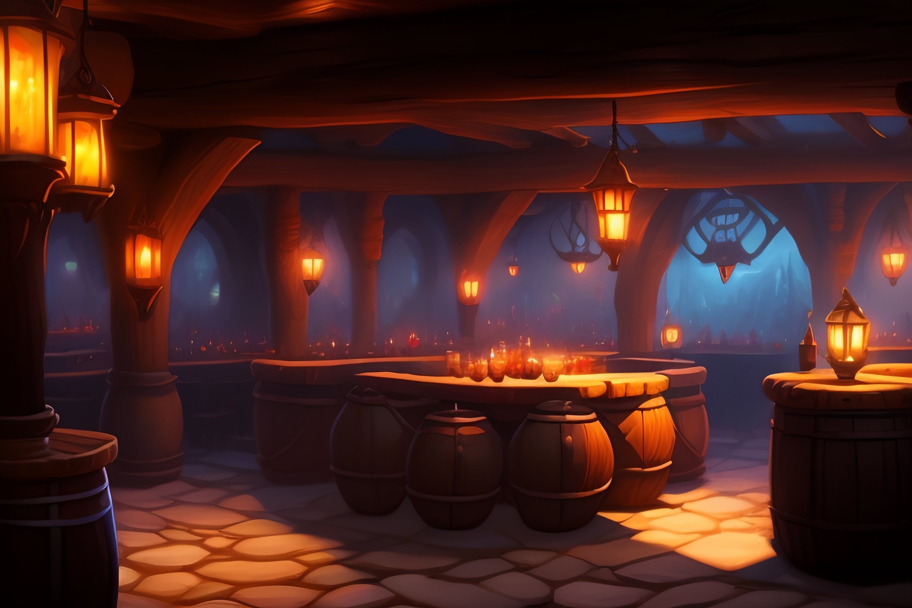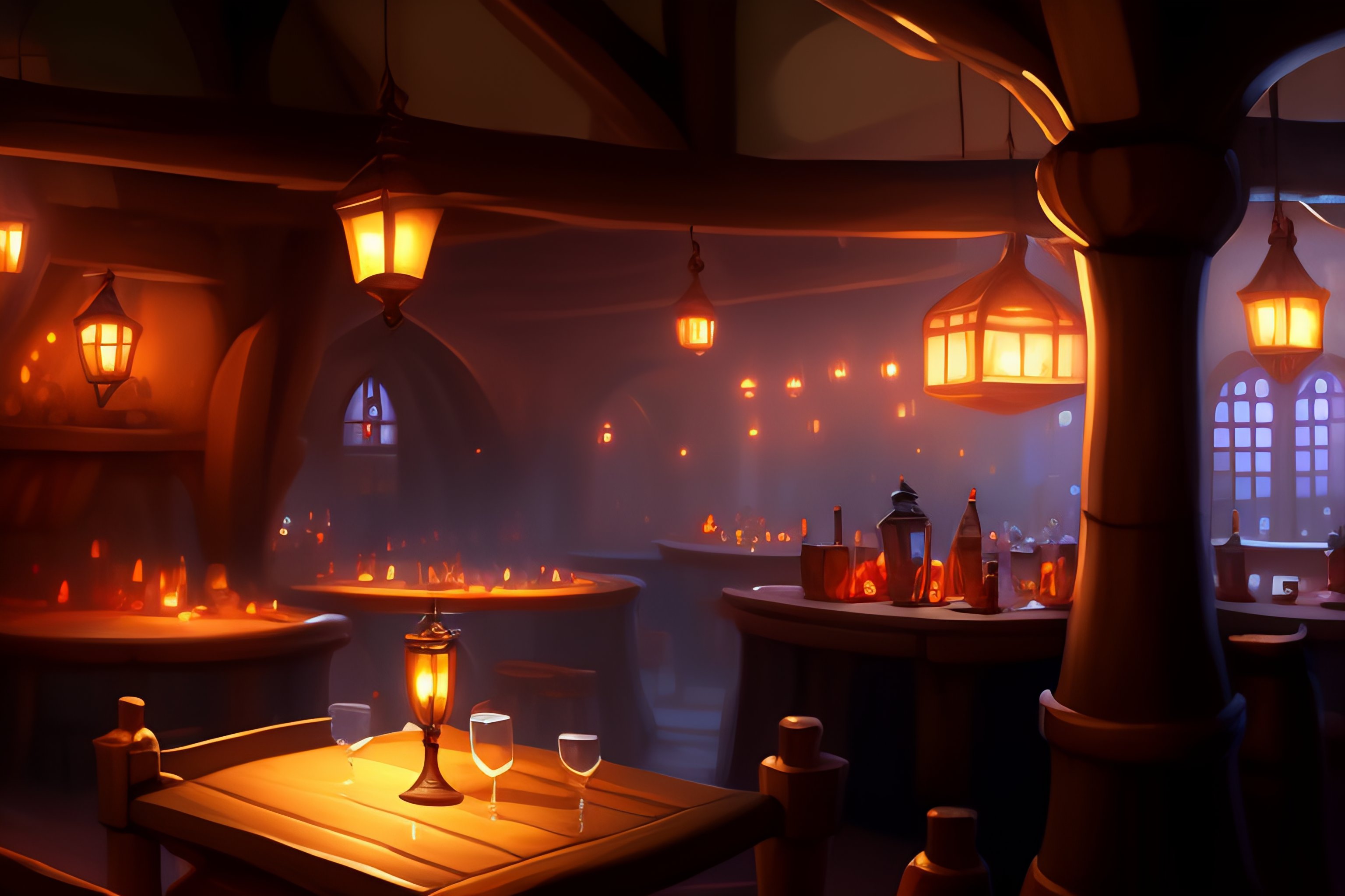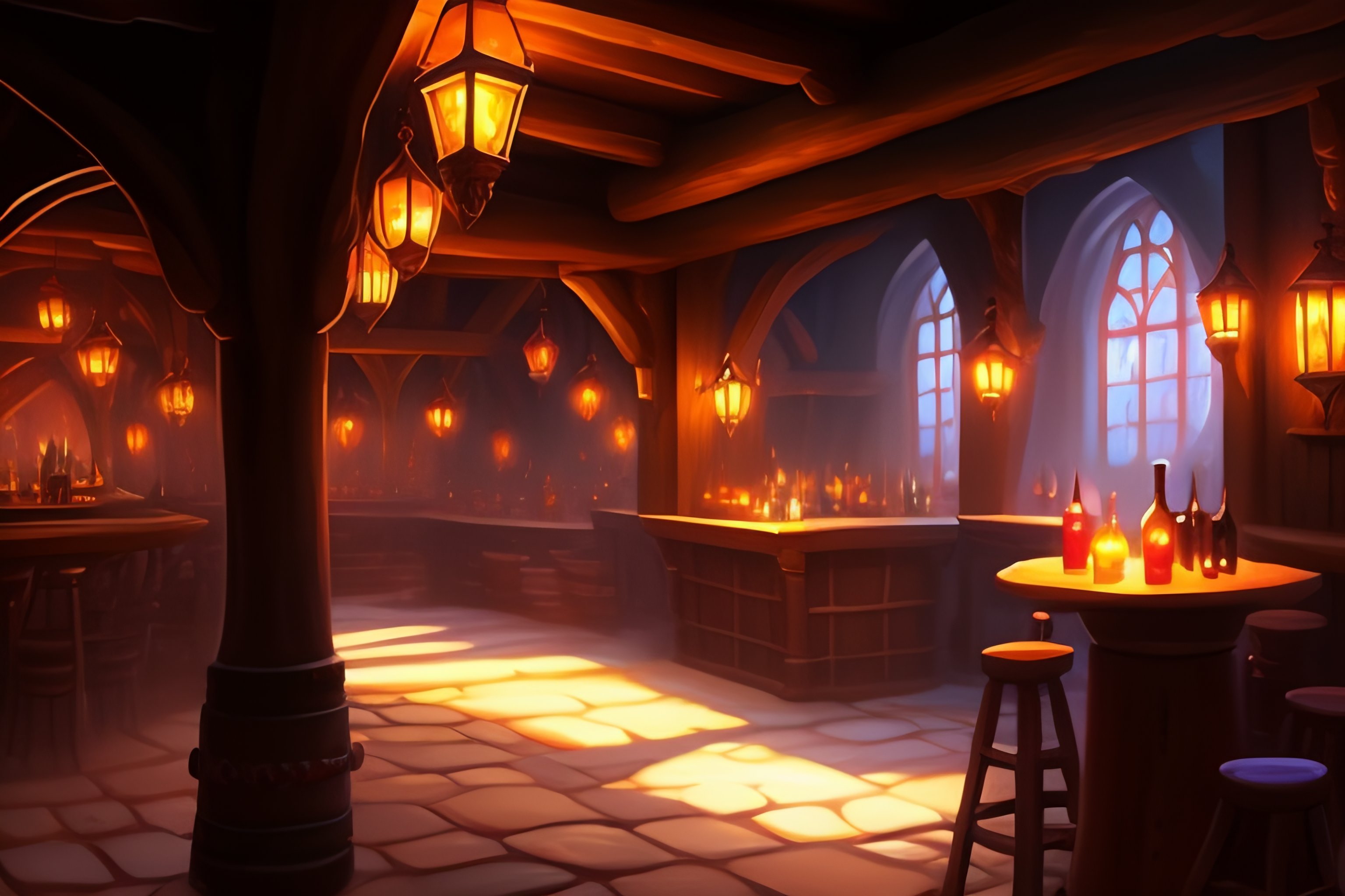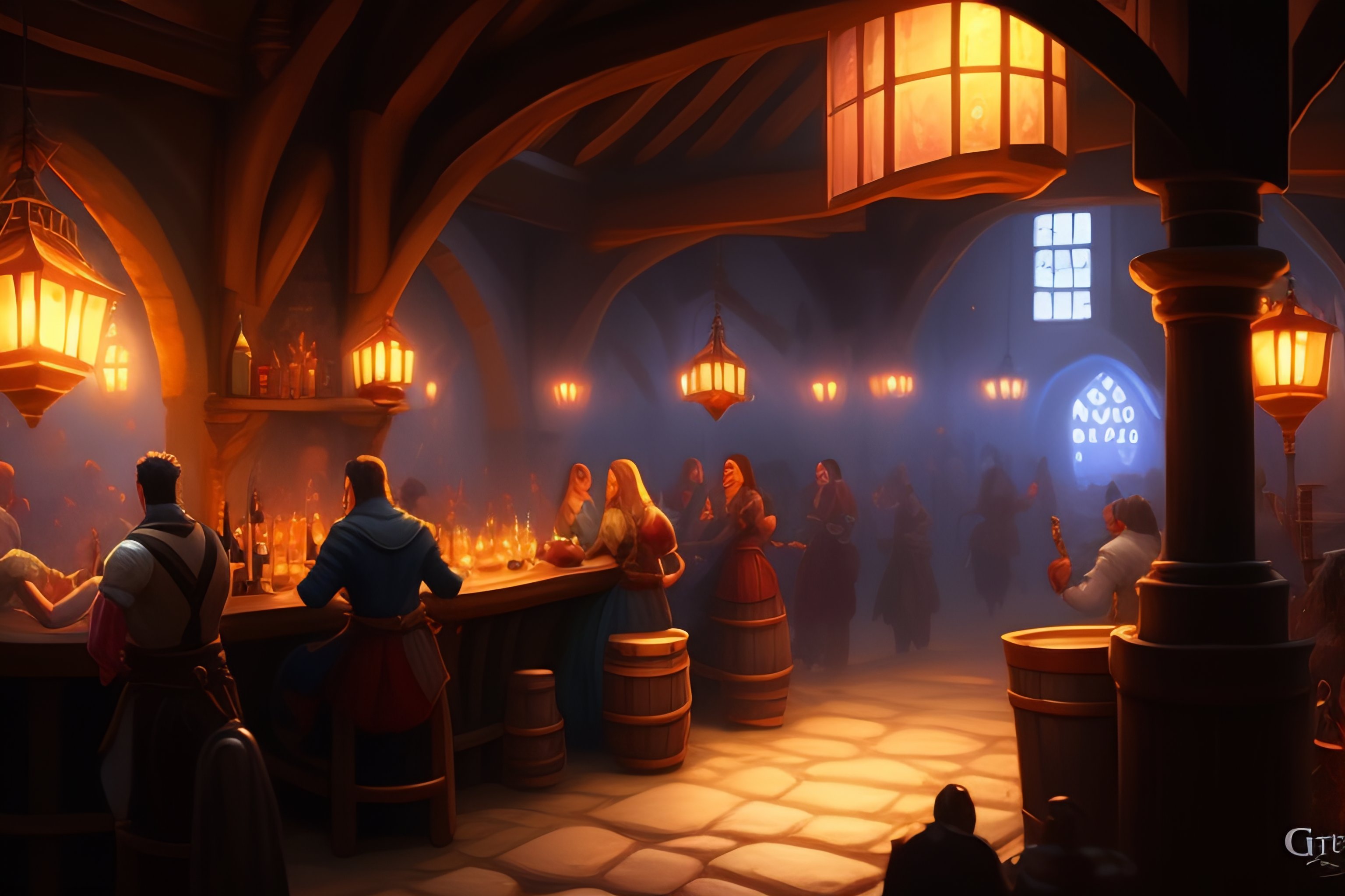 Small interior crowded tavern, medieval, high fantasy capital city outside, greg rukowski, jordan grimmer, artgerm, artstation