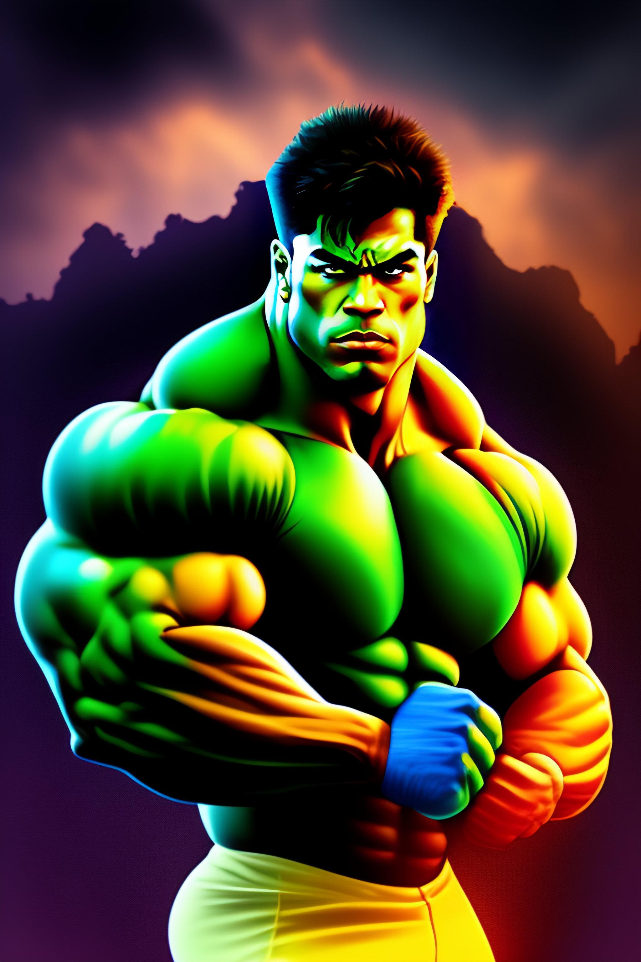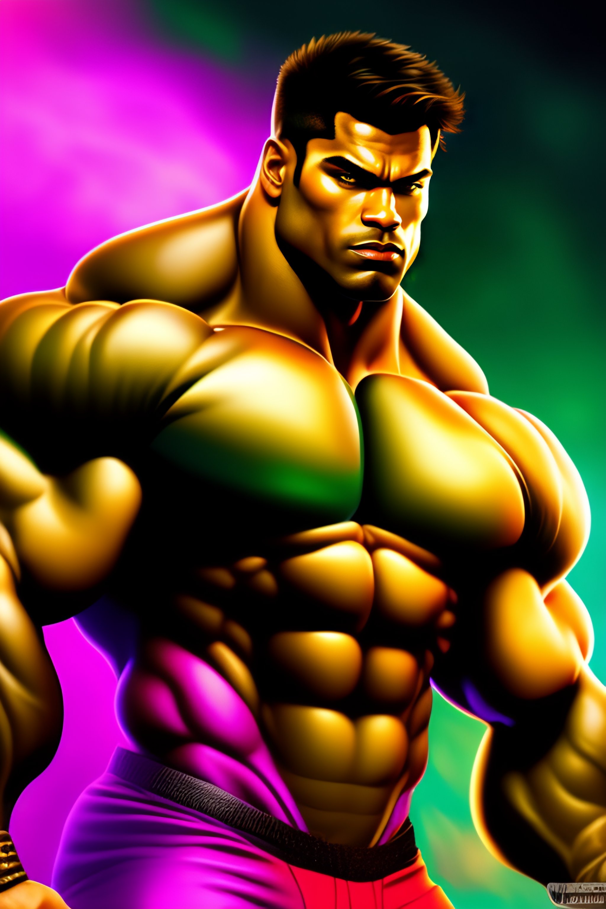 Hyper muscle bodybuilder hulk flexing with huge biceps and pecs in bright digital art style