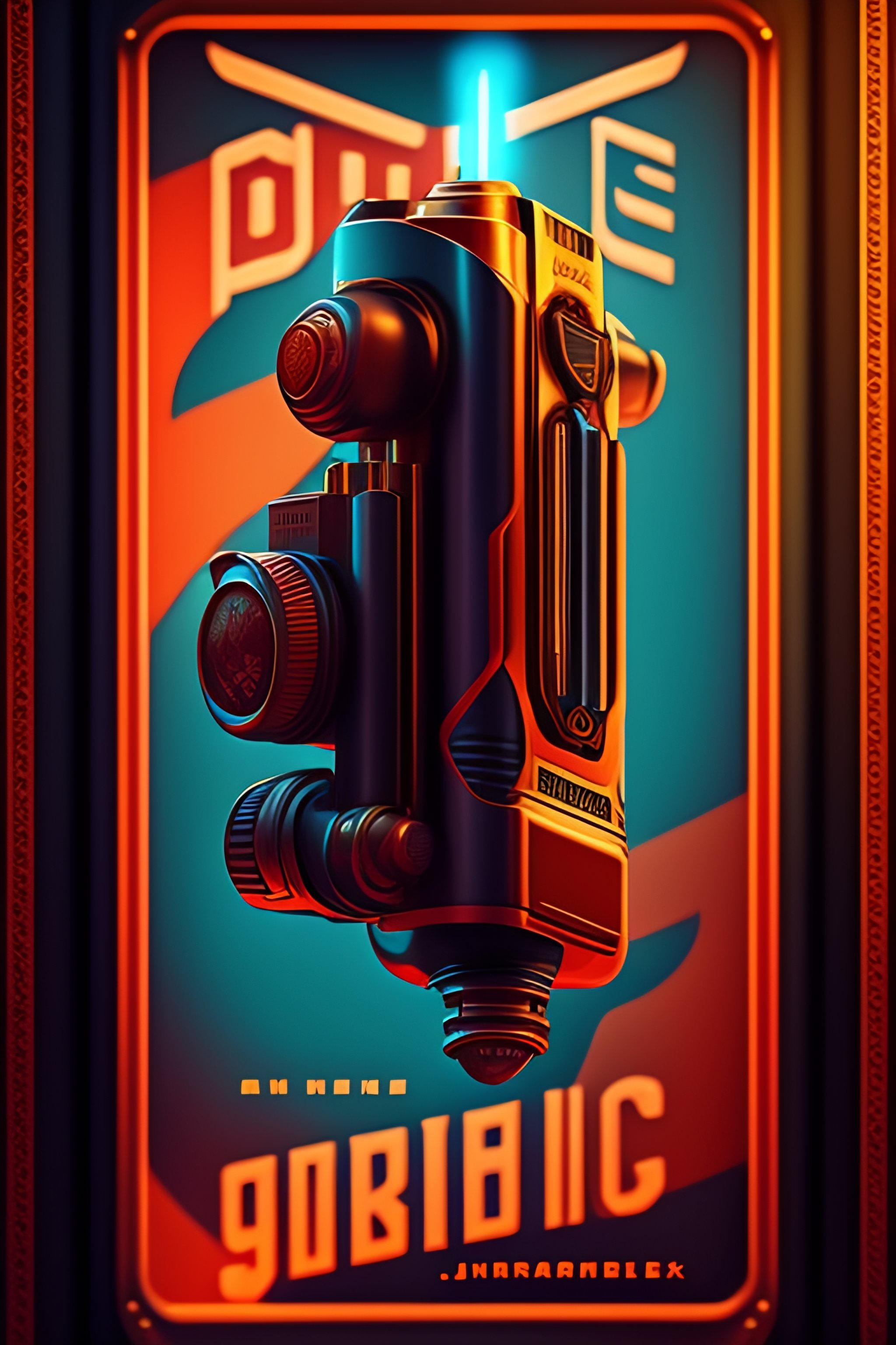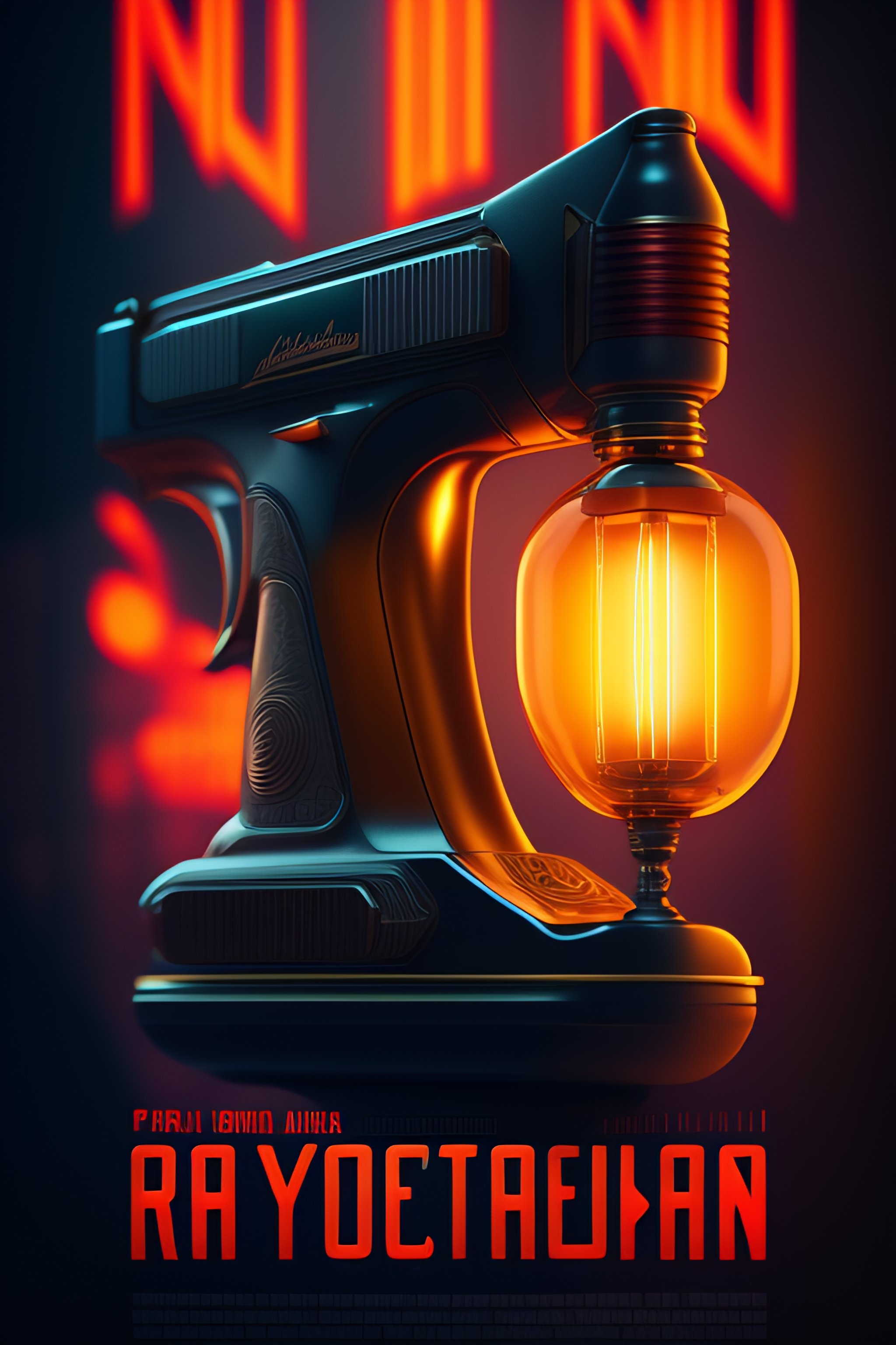 Style medium shot 1920's poster, object, raygun pistol, cyberpunk, robotic, 1820s movie poster, cozy interior lighting, artstation, ultra detailed, cinematic, daz, hyper realistic, octane, netflix lighting, 8k