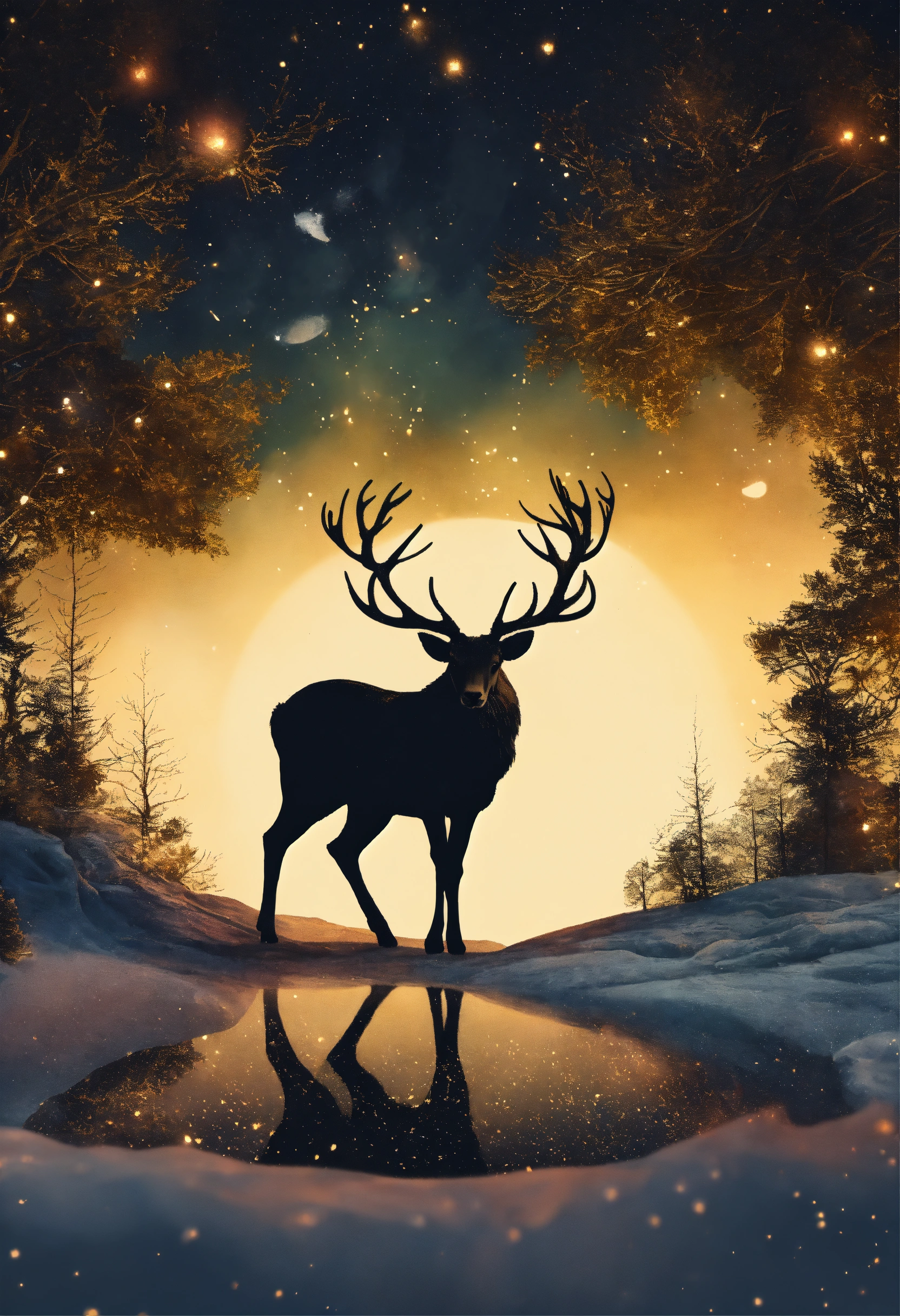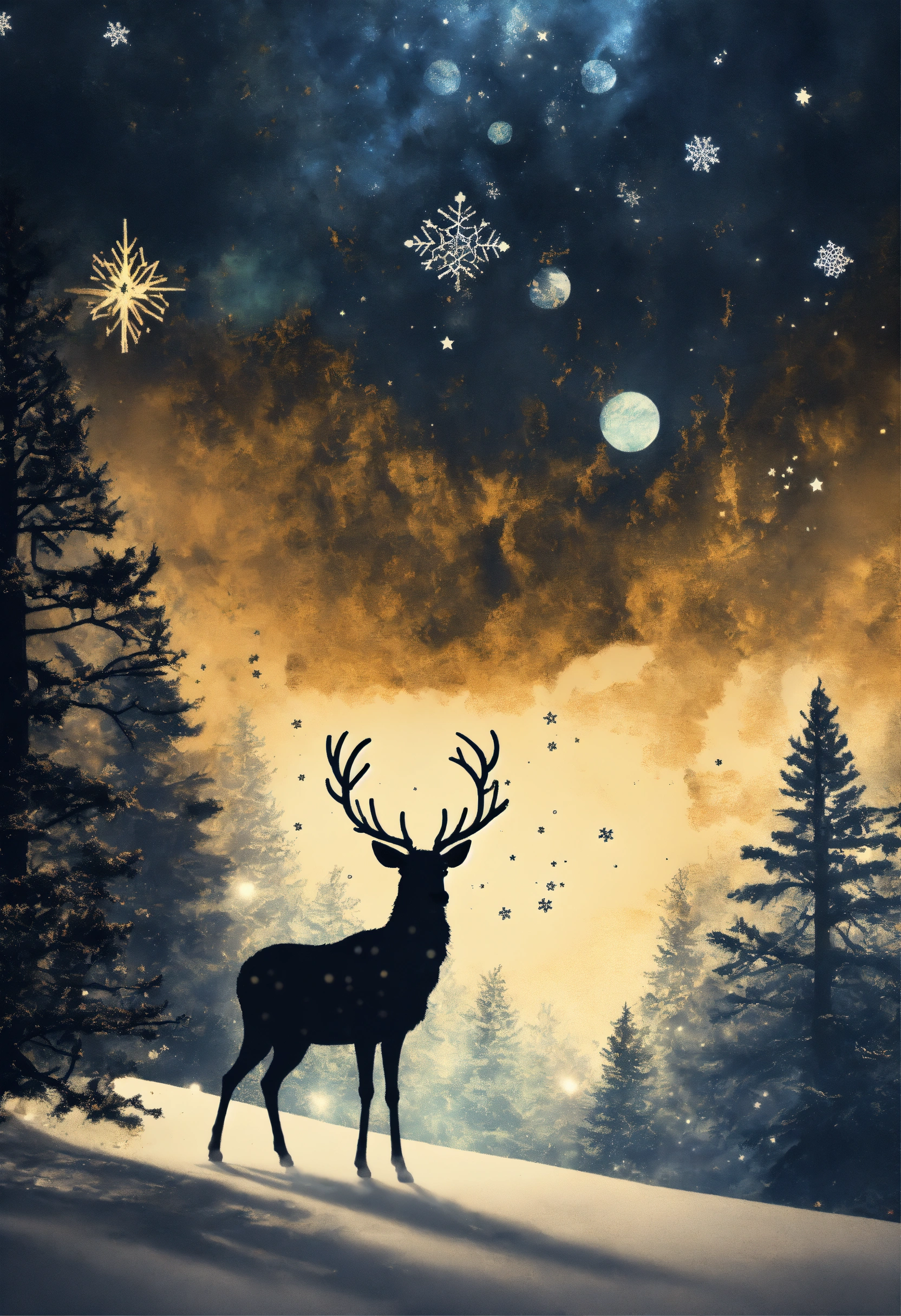 Create an exquisite ink drawing on white paper that forms a seamless multiple exposure artwork. this piece should merge the volumetrically shaded silhouette of santa claus with the form of reindeer, elves, a starry sky, snowflakes, and nature, infusing intricate details into all elements. craft a harmonious and unique composition that conveys a profound sense of christmas peace. this conceptual art should be poster-worthy, showcasing a blend of illustration techniques that evoke a sense of emotional depth and storytelling, golden accents, wildlife photography, typography, 3d render, illustration