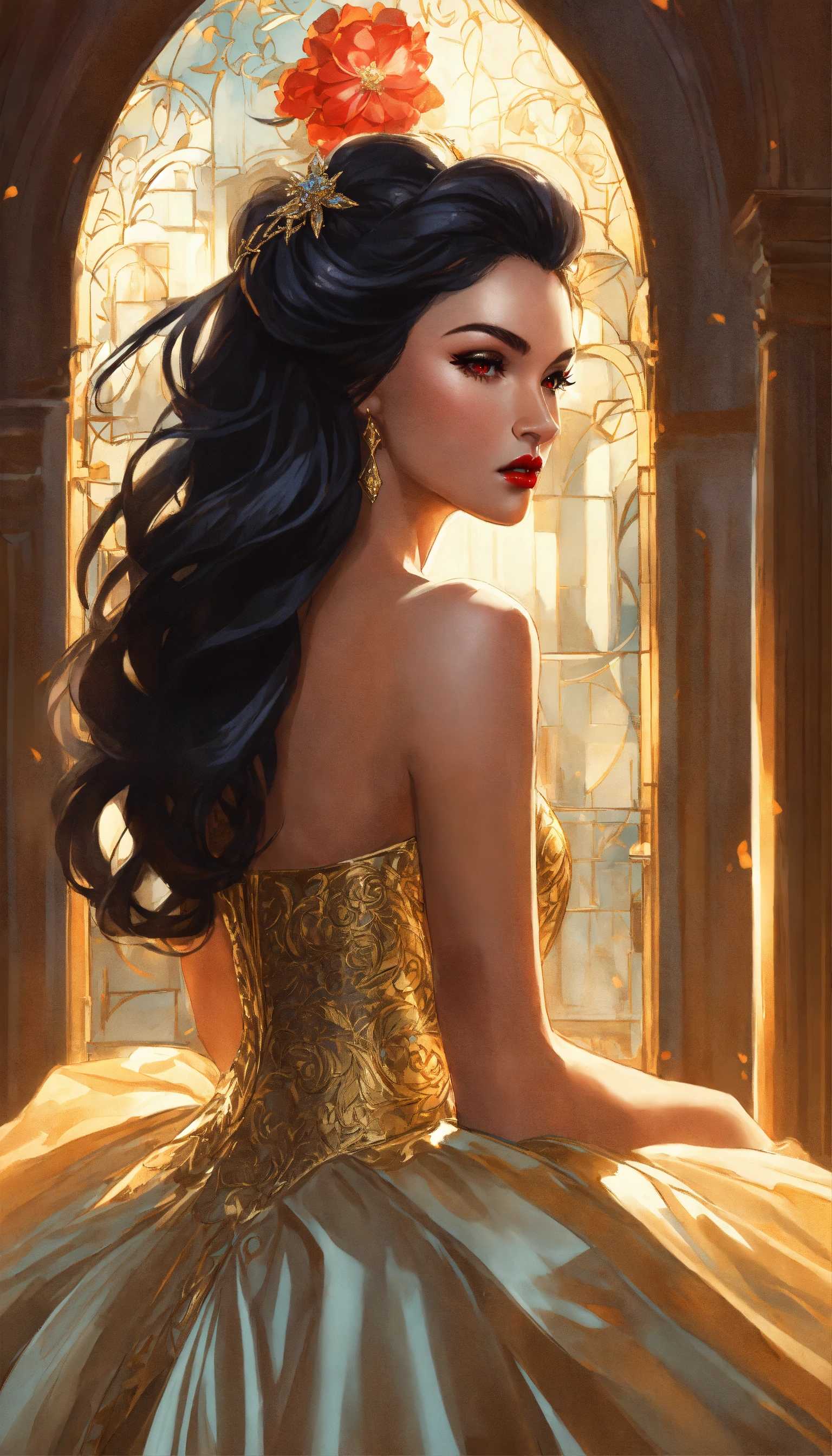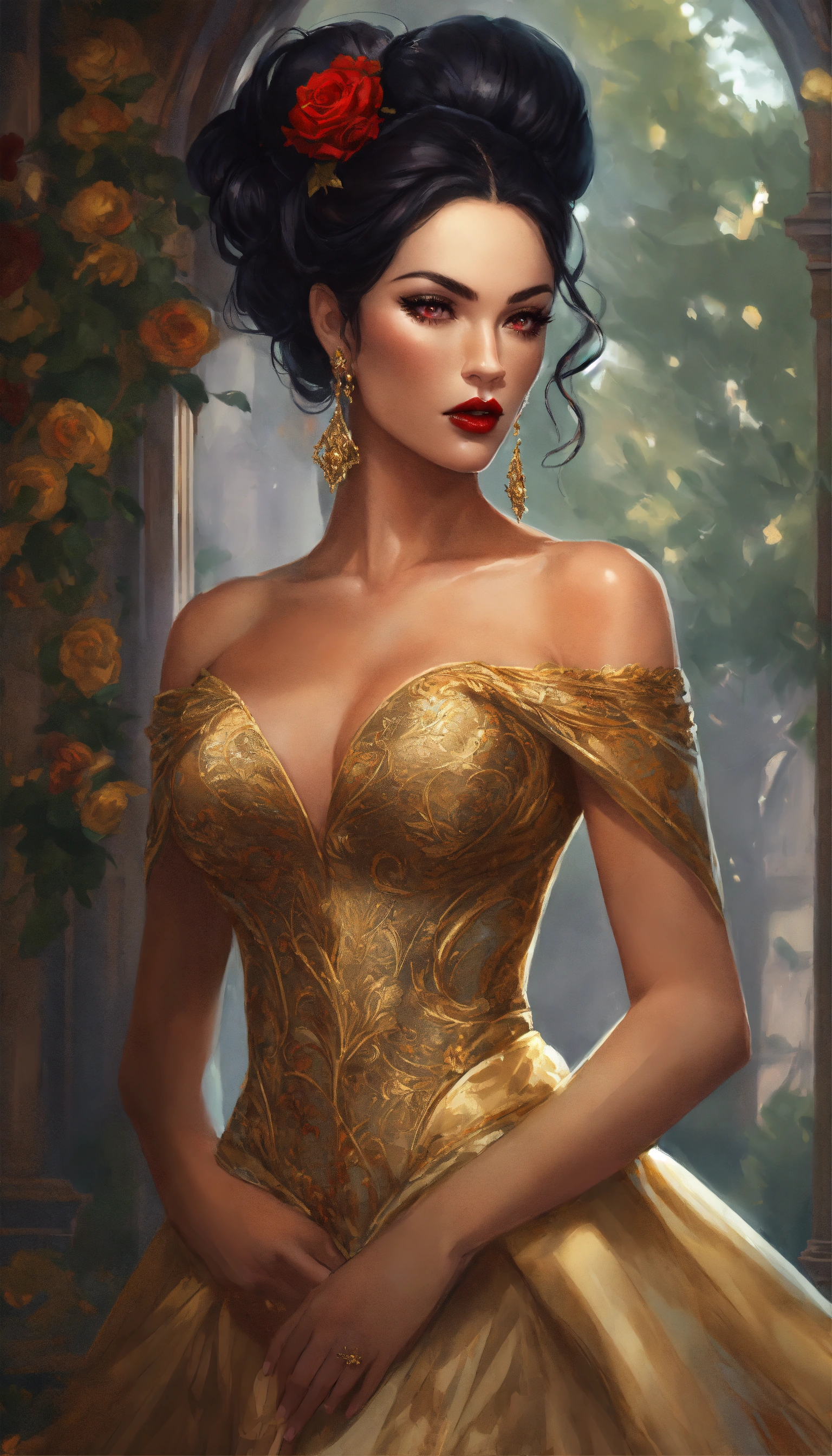 Concept art of ravenna, megan fox, glowing red eyes, curled voluminous flowing black hair in a formal wedding updo, hair in a bun, updo, bun, curled black hair tied up in a wedding bun, beautiful, tan skin, realistic, sabine rich, artgerm, j scott campbell, artgerm, perfect body, detailed, intricate, round face, slim nose, long black eyelashes, red lips, sharp jawline, perfect detailed face, realistic, floor length gold veil, full body view, evil dark sorceress, gloomy grey castle background, gloomy dark flowers forest castle, gold floor length fitted full skirts bridal gown, low cut neckline, gold high heels, voluminous curled long hair, gold train updo veil, gold wedding gown, very long transparent golden long veil and hair tied up, golden fitted bridal gown, big voluminous long train full skirt gown, forest, yennefer, zuhair murad bridal, zuhair murad bridal ball gown, gold textured silk shimmer fabric embroidered dress, gold long train wedding dress, walking down aisle, sleeves