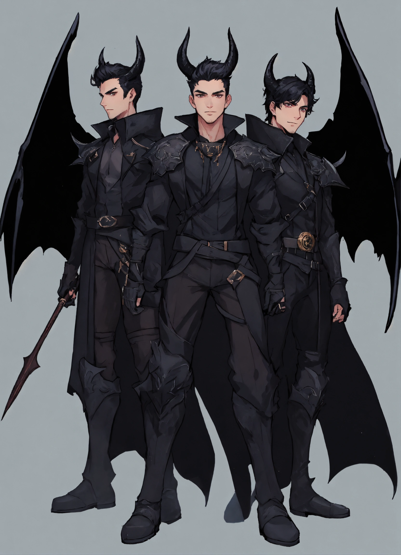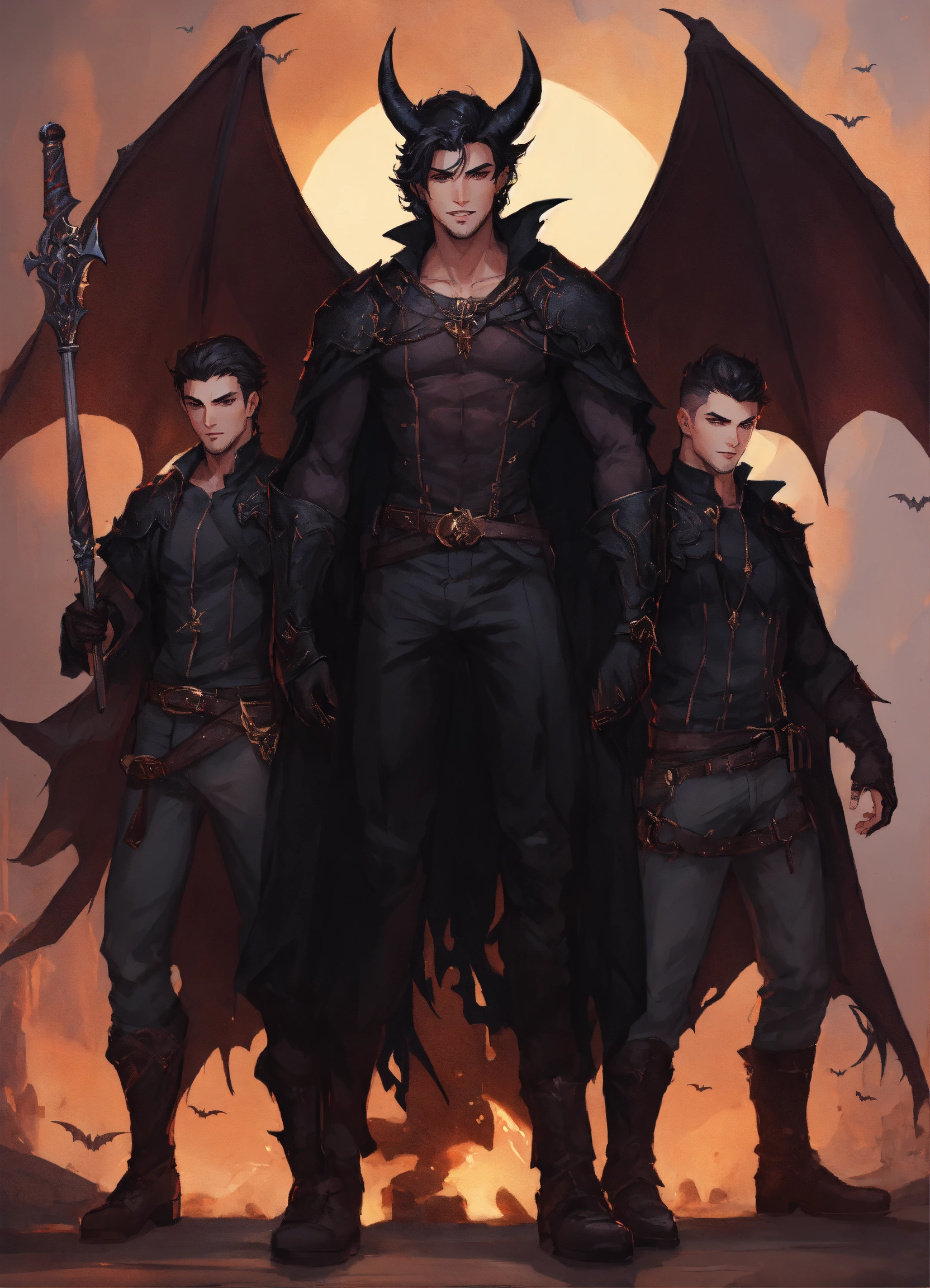 Four half handsome demon half human brothers wearing black with bat wings dnd character art