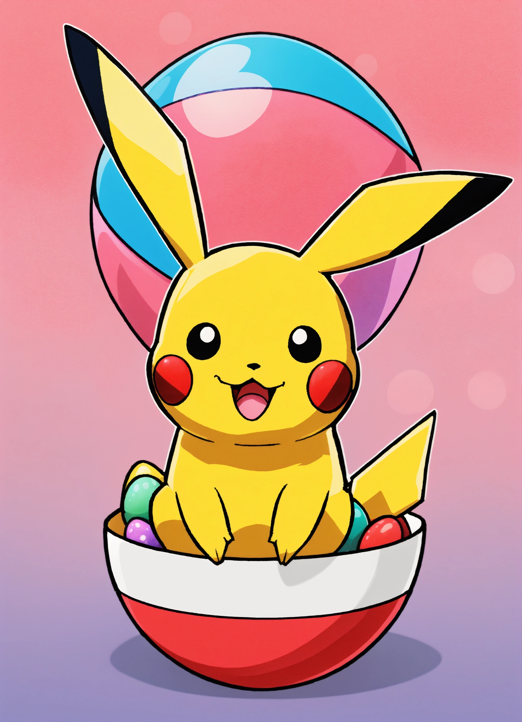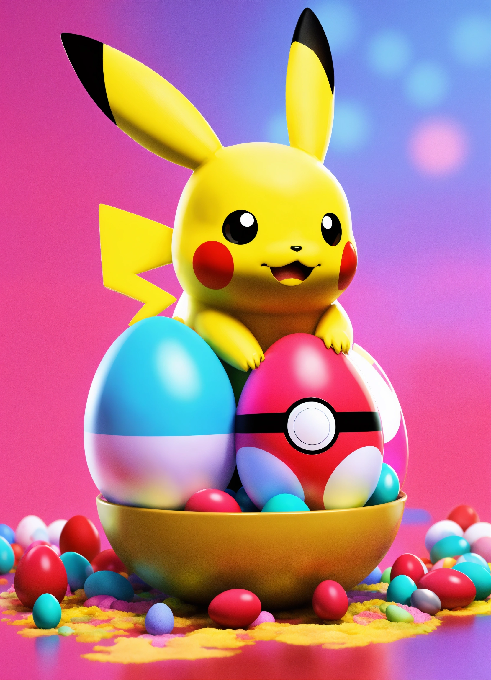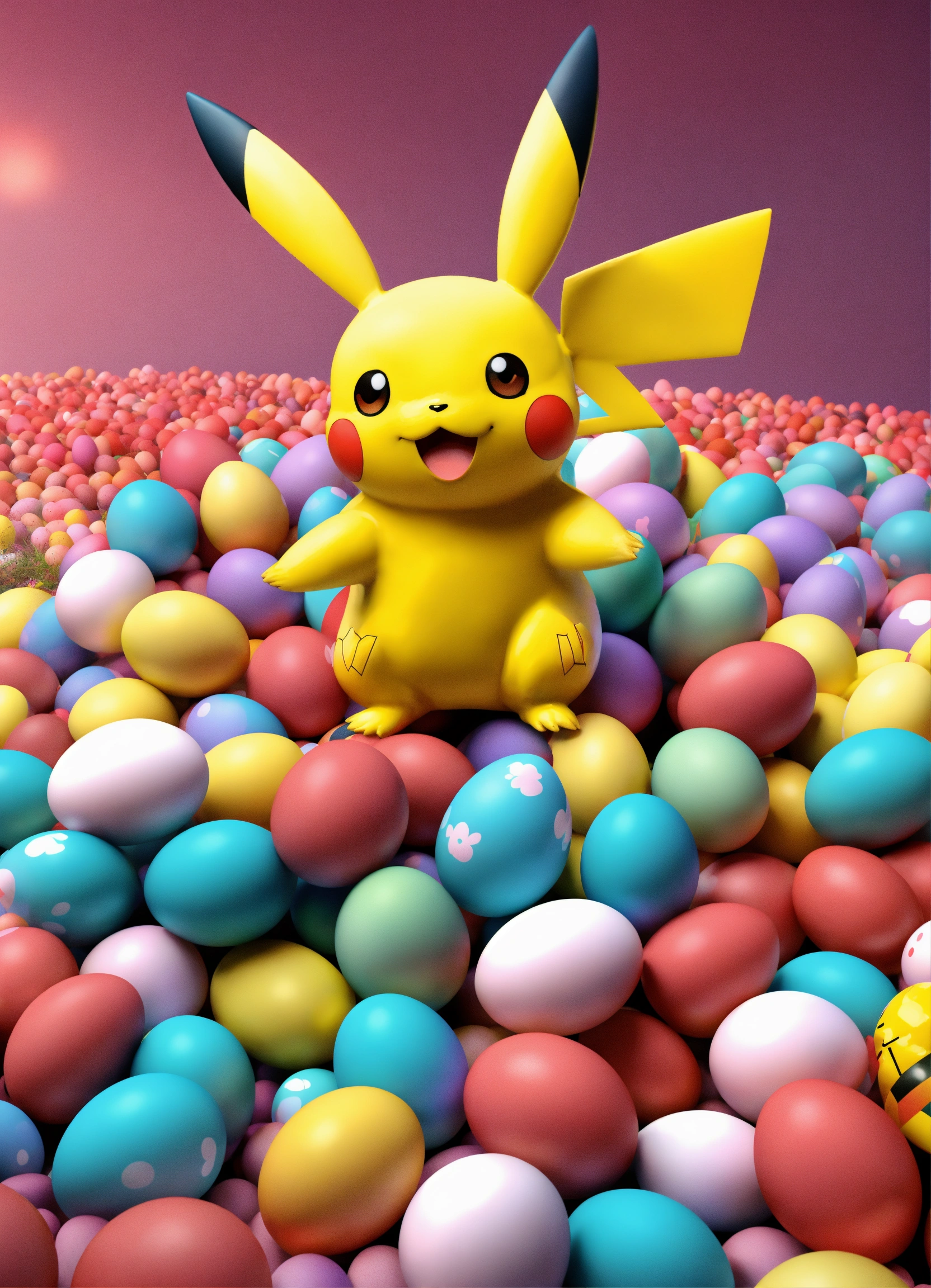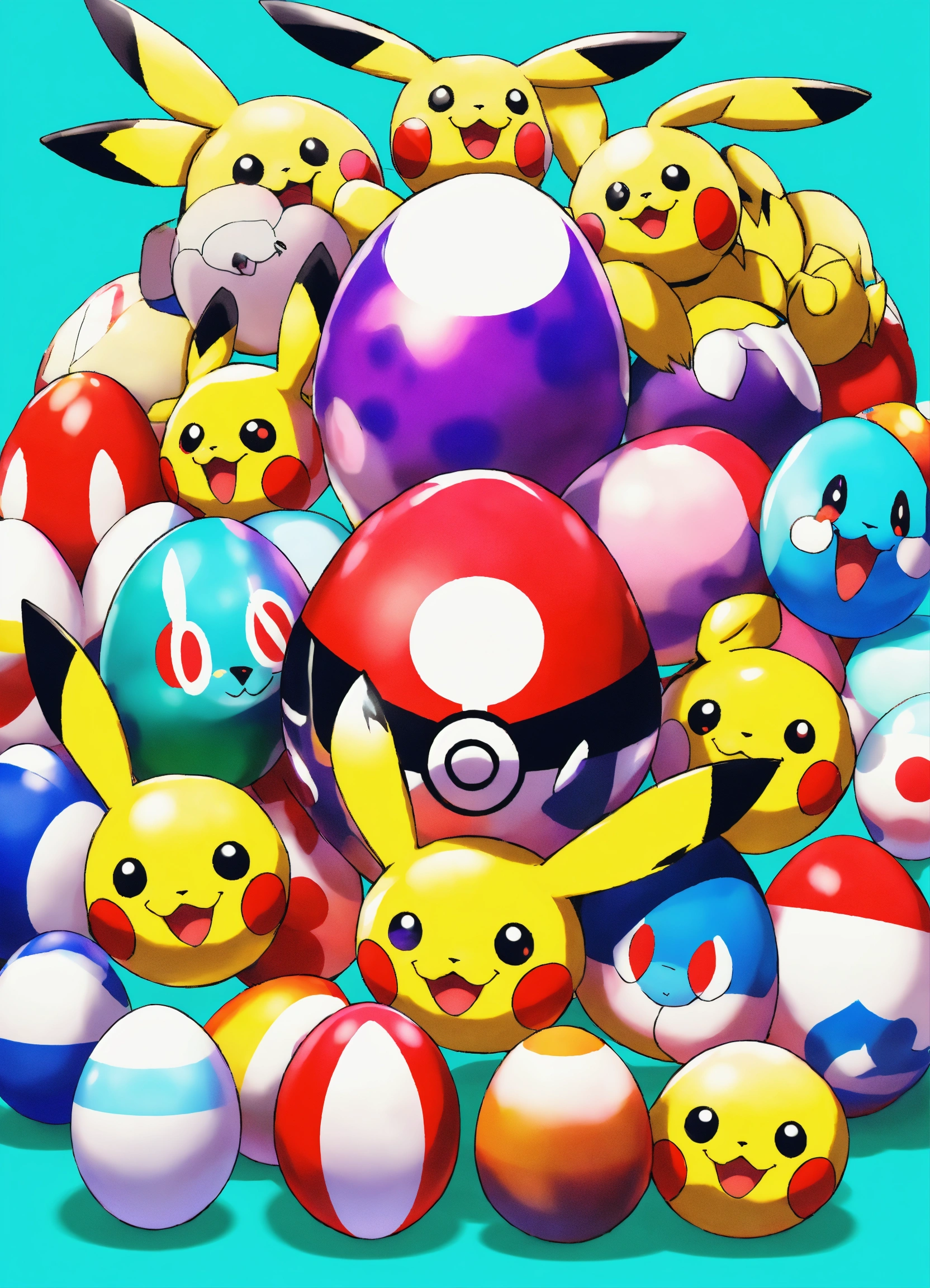 Pokéballs designed as easter eggs, pikachu with bunny ears, pokémon and satoshi tajiri, anime art, digital render, vibrant pokémon palette.