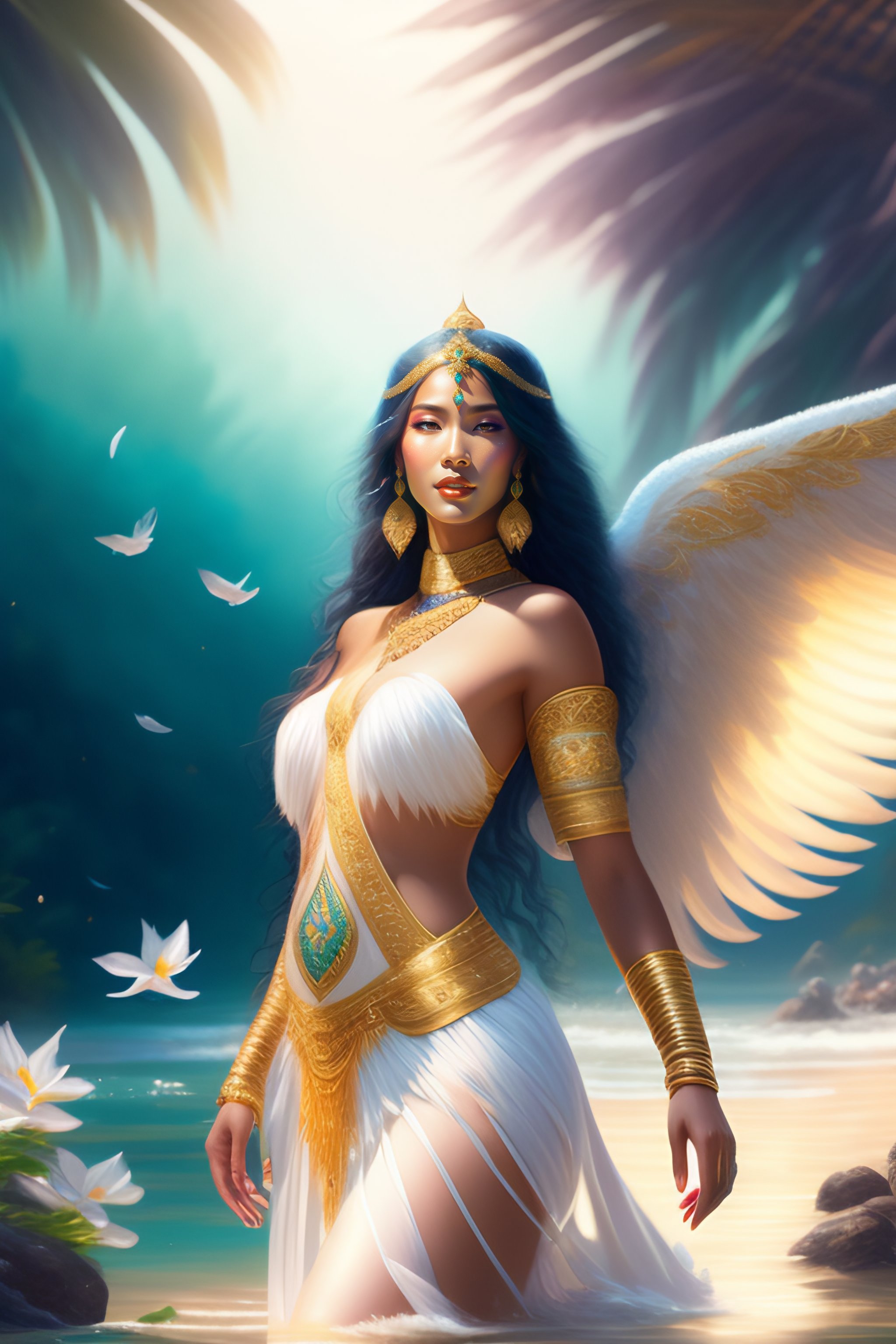 企鵝妹 as beautiful arabian princess with angel wings wearing white clothes and gold jewels dancing in water on tropical beach with greeneries and colorful flowers, full-body view, greg rutkowski, ultra detailed, volumetric lighting