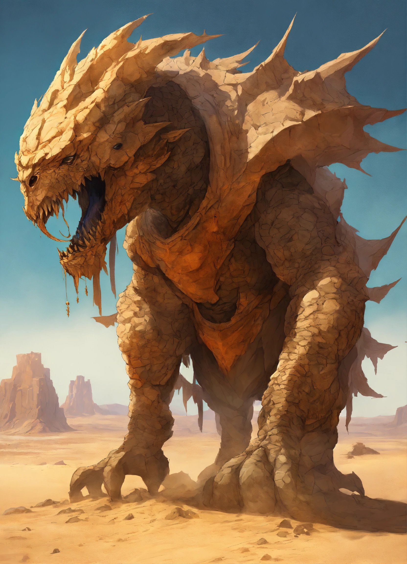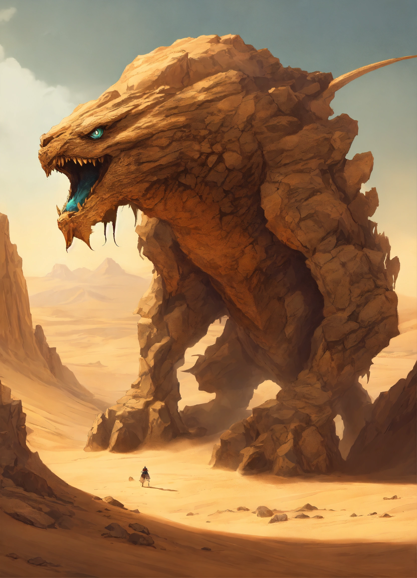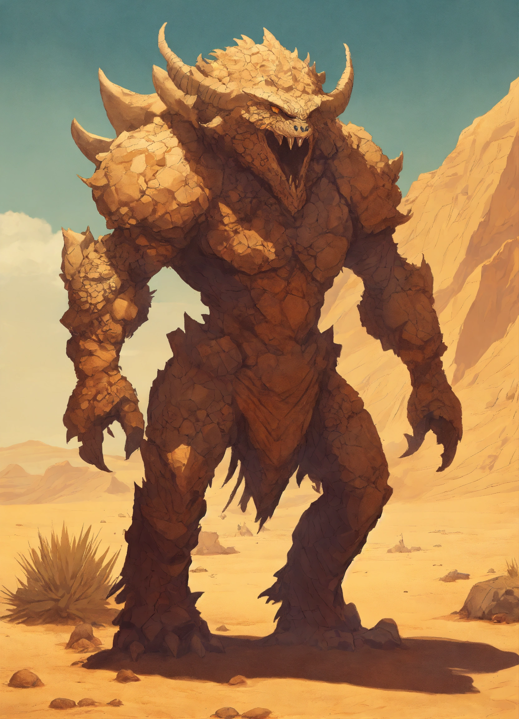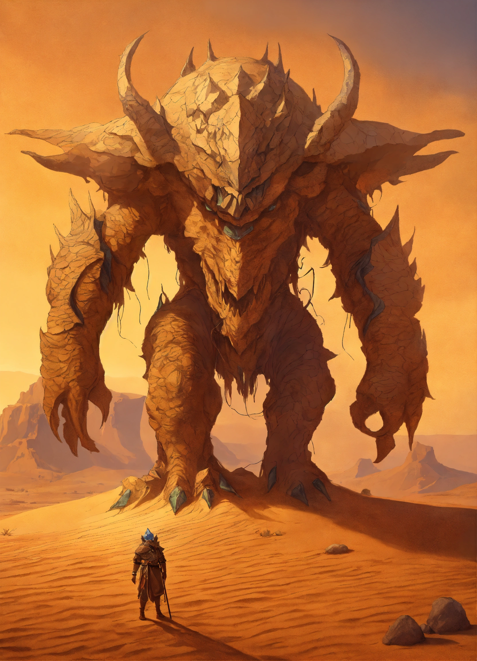 A fantasy monster that is a guardian of the desert, large in stature, looks like a sand and rocks attached to its body, background desert, graphic novel art
