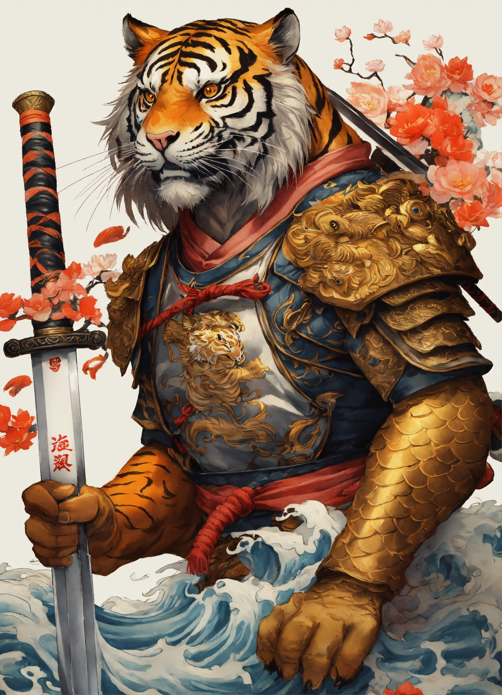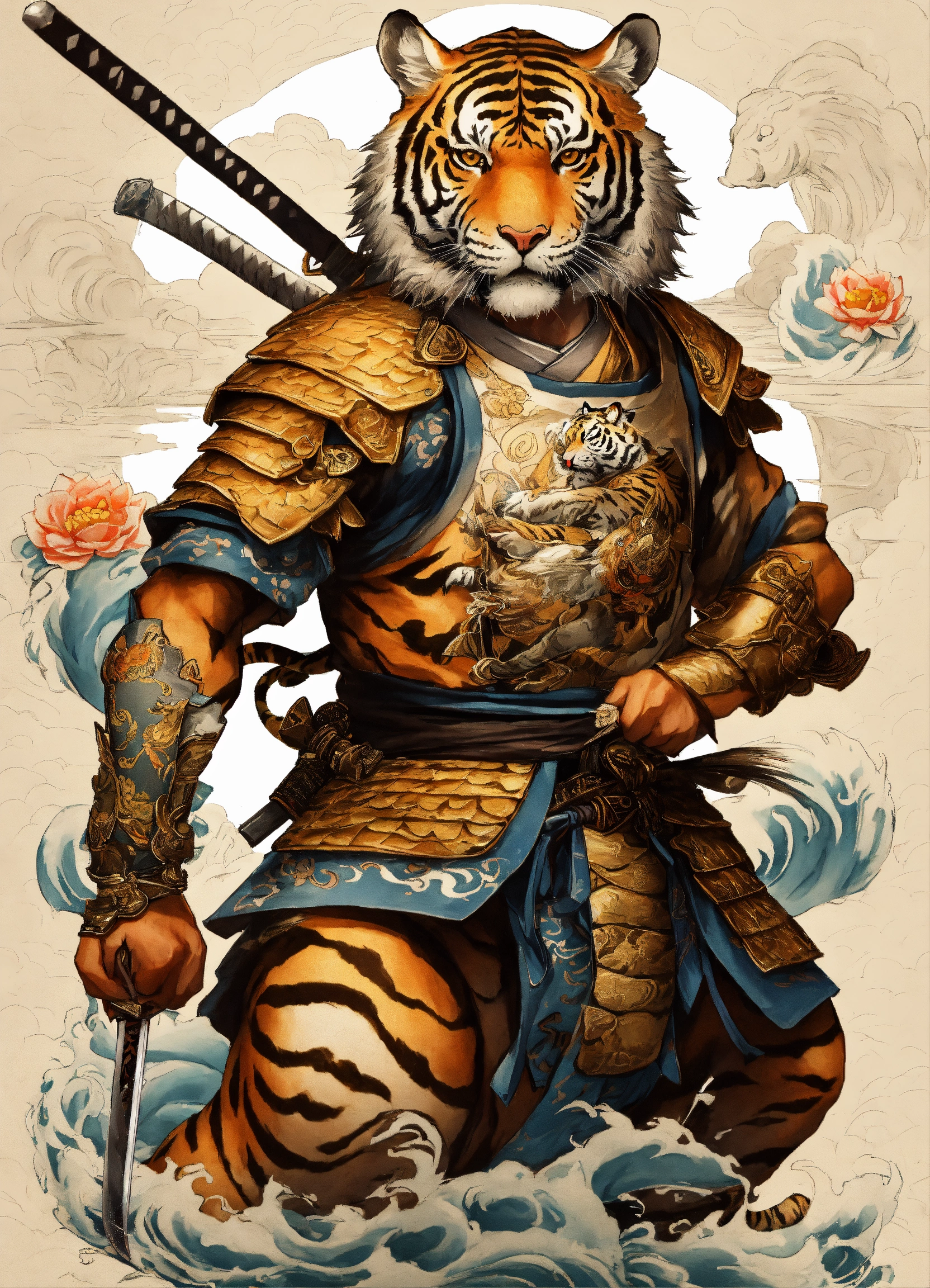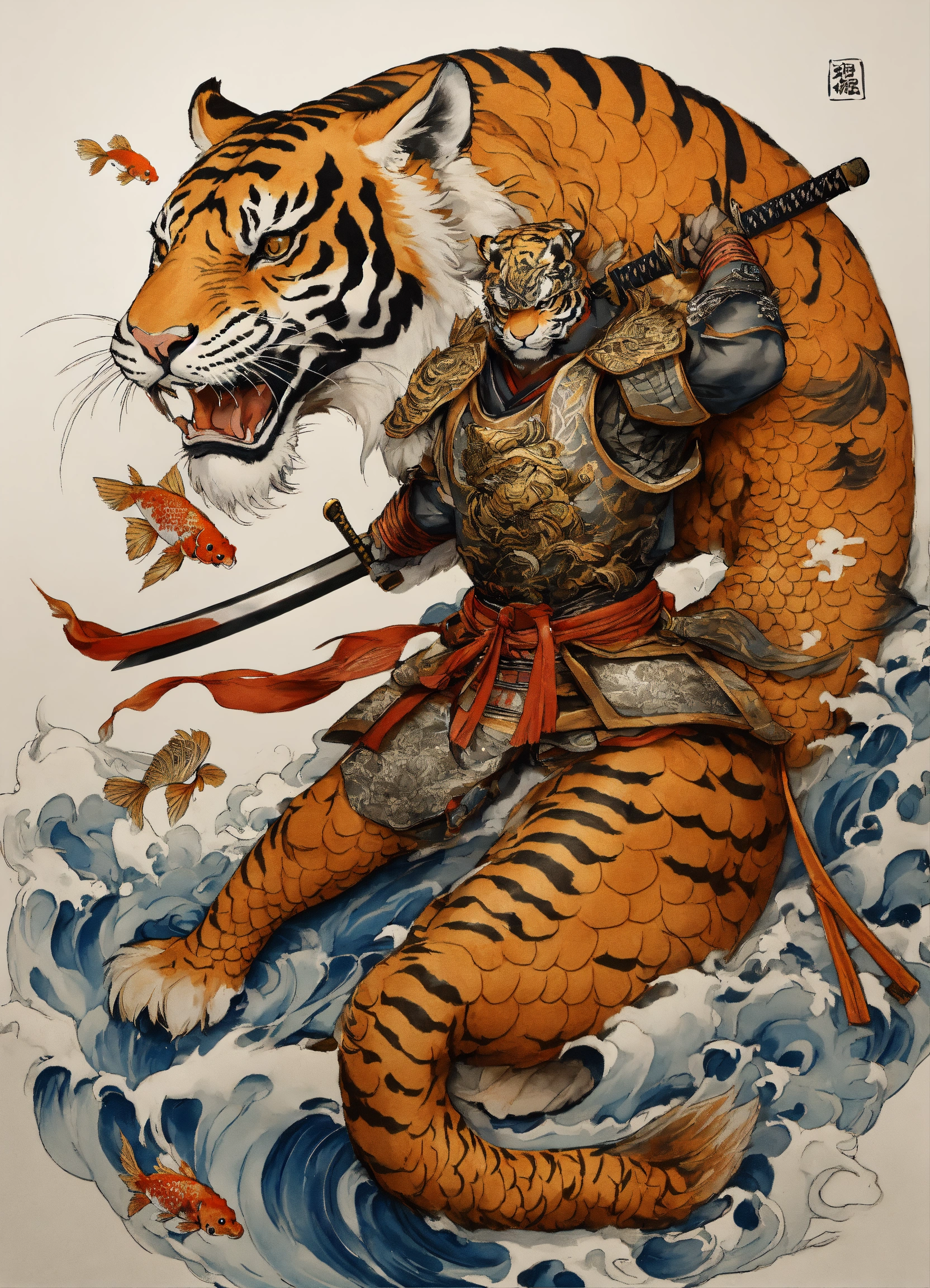There is a tiger with a big carp koi and a sword on a white background, samurai tiger, tiger warrior, armored tiger, anthropomorphic tiger ninja, samurai deity with koi armor, by kanō tan'yū, highly detailed, model tattoo