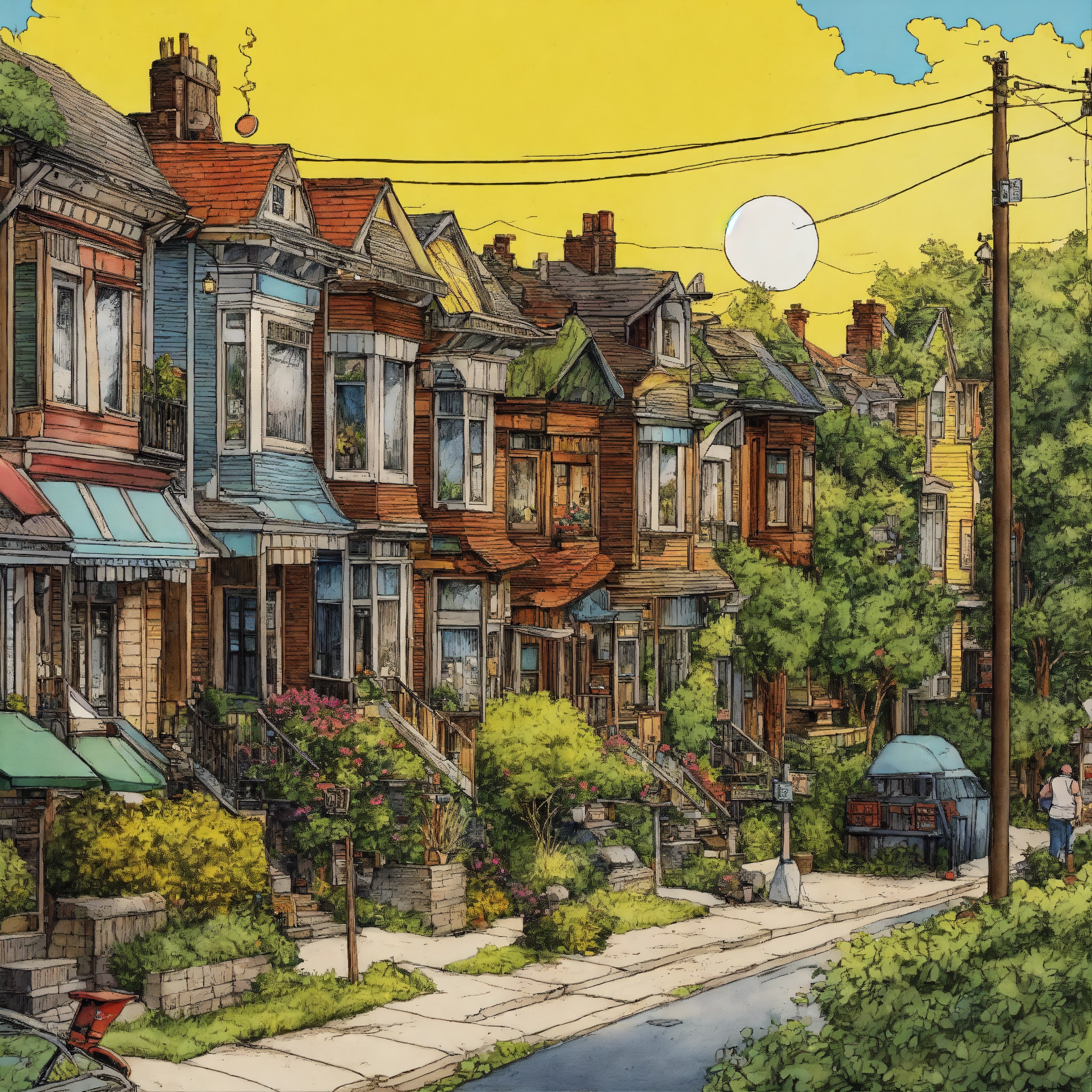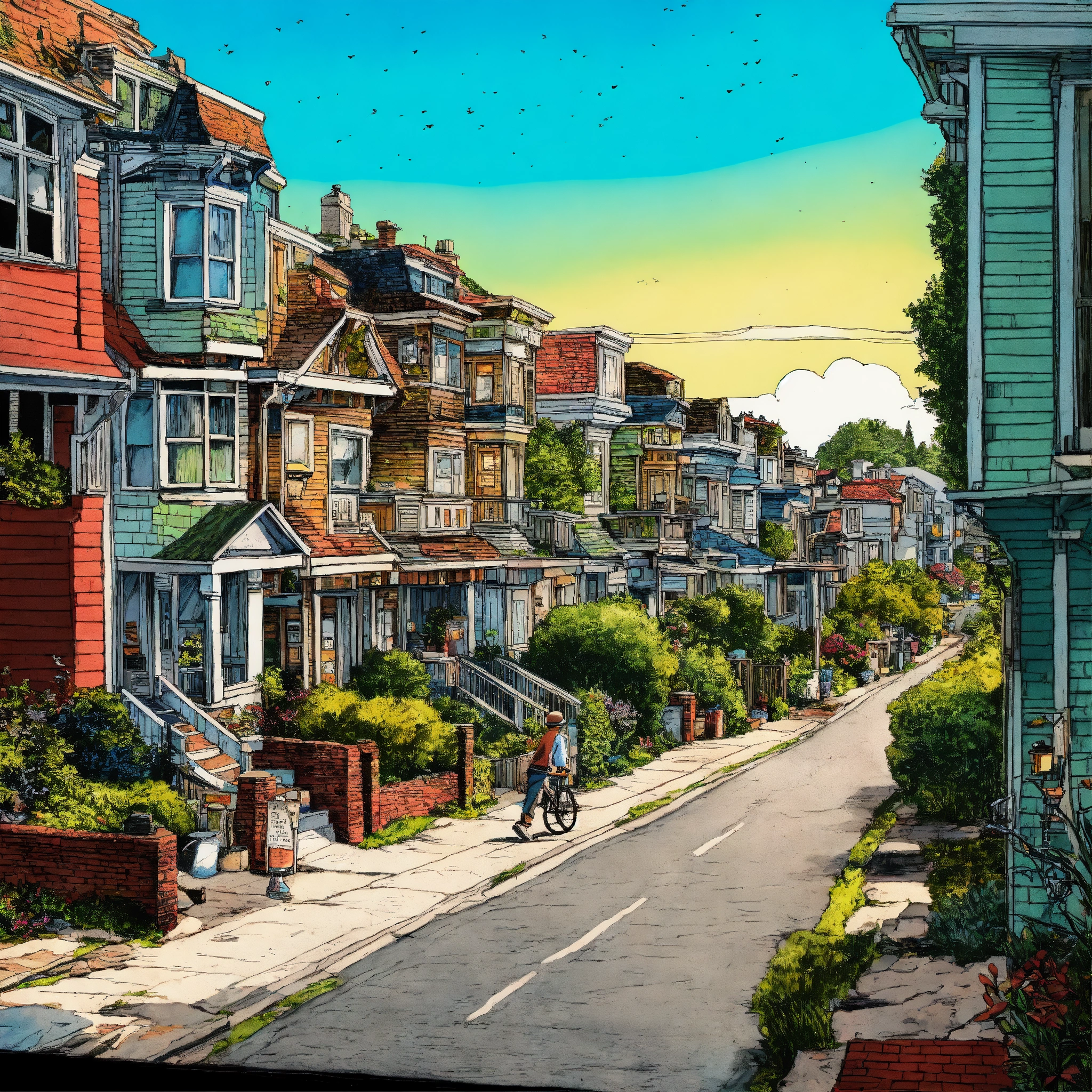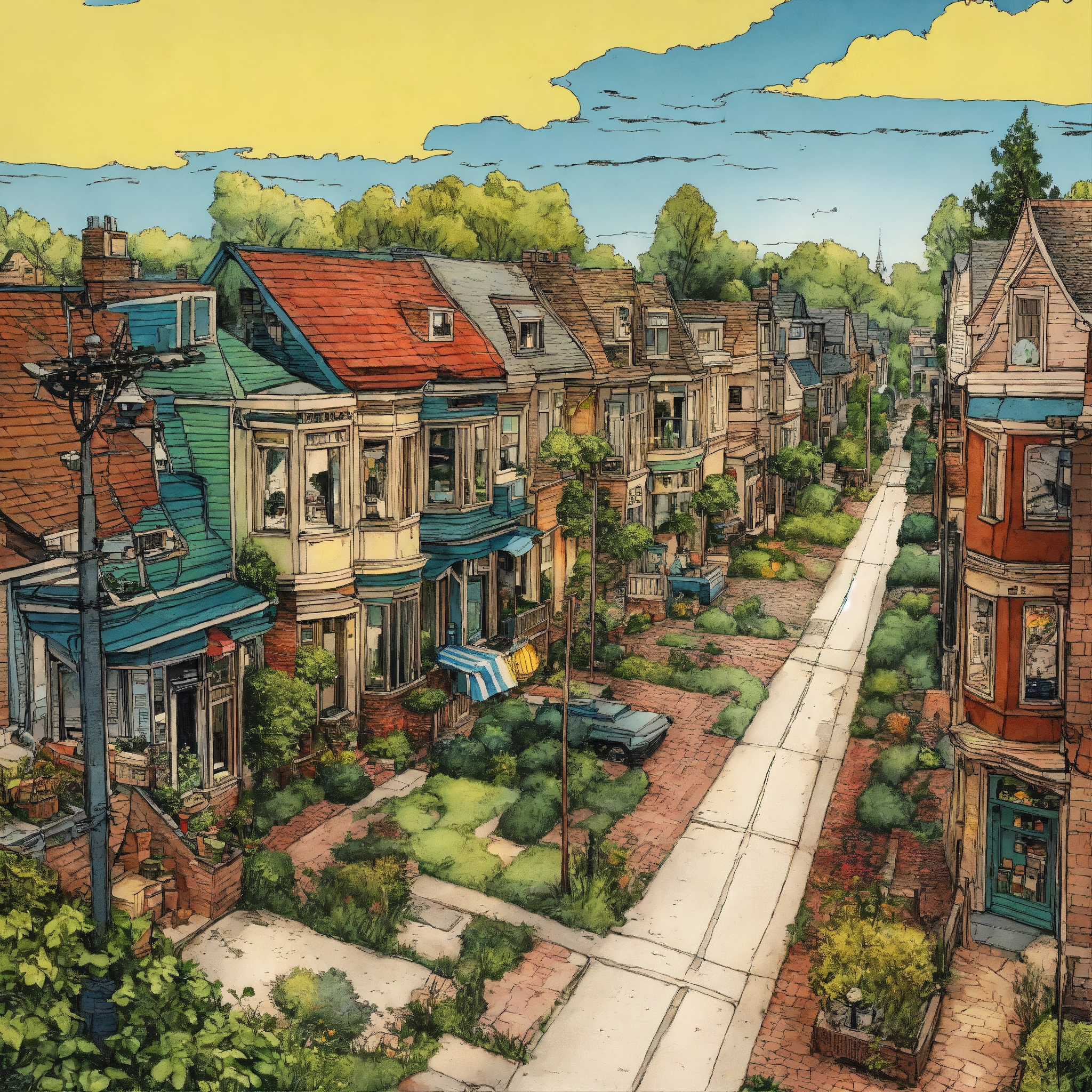 Sunny suburban culdesac street in detailed pen and ink in the style of tin-tin comics, colorful, detailed, high quality