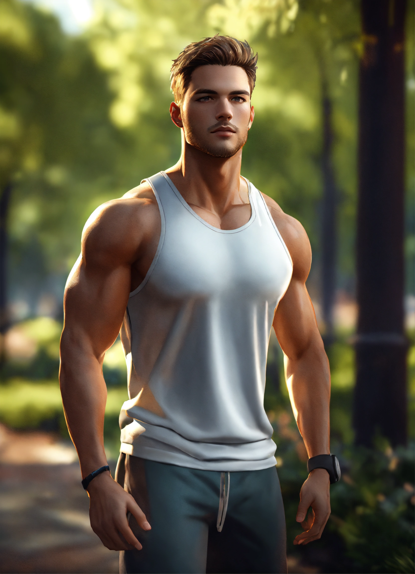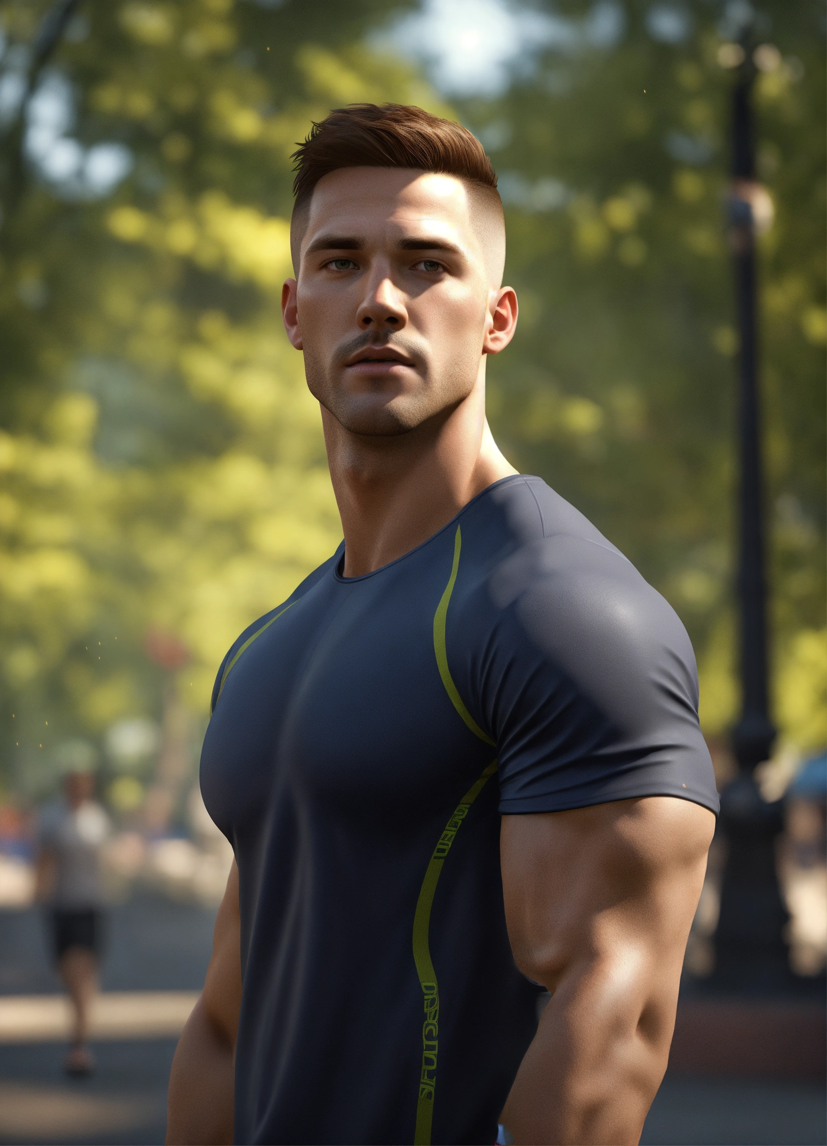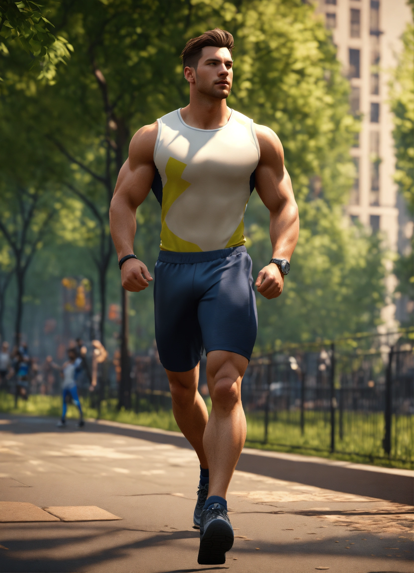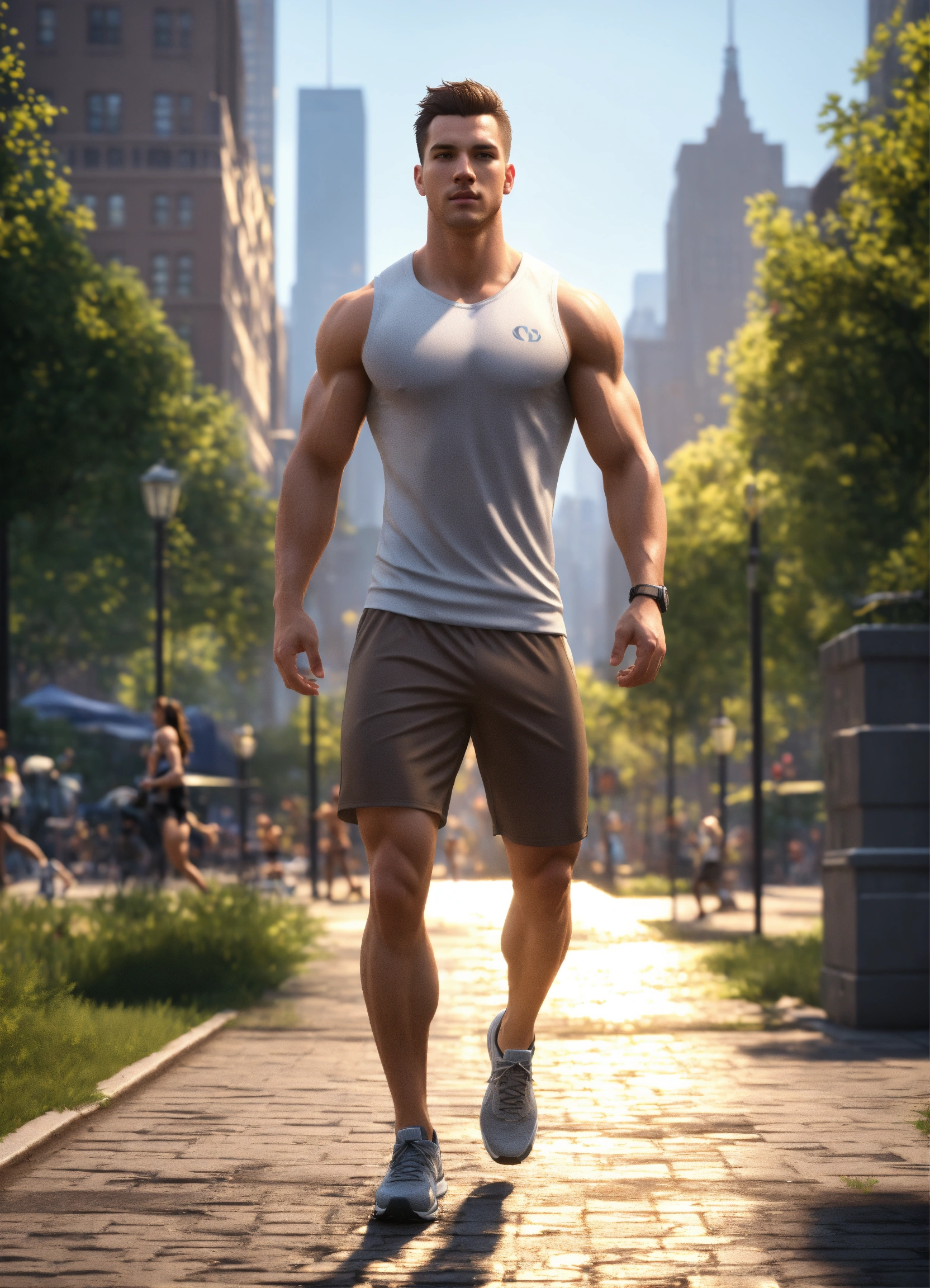 Full body of a handsome, athletic white male, with short brown hair, perfect face clean shaven, a very handsome athletic man, a hero wearing workout clothes, at new york city park, full body, 8k resolution concept art portrait dynamic lighting hyperdetailed intricately detailed splash art trending on artstation unreal engine 5 volumetric lighting