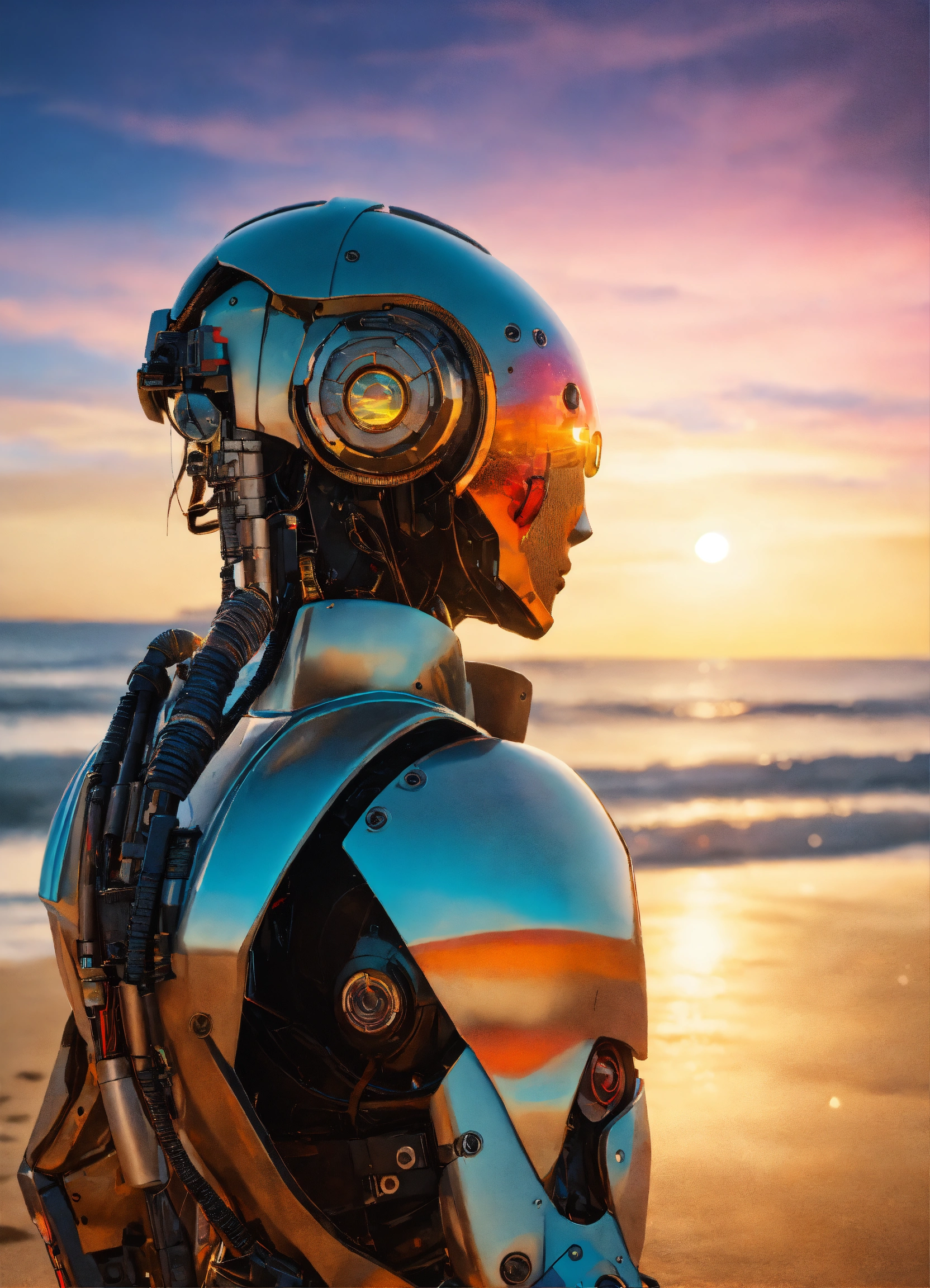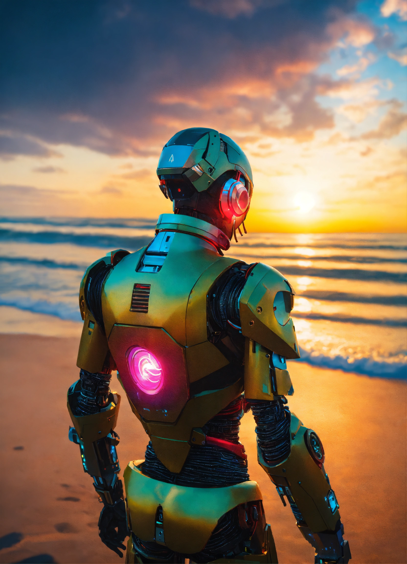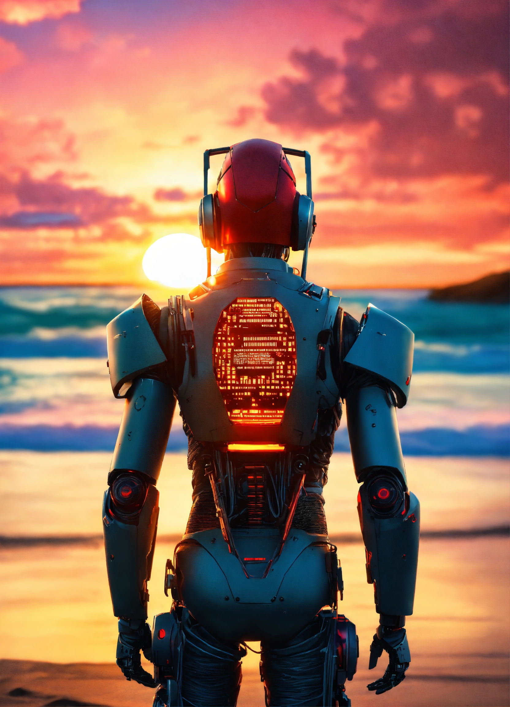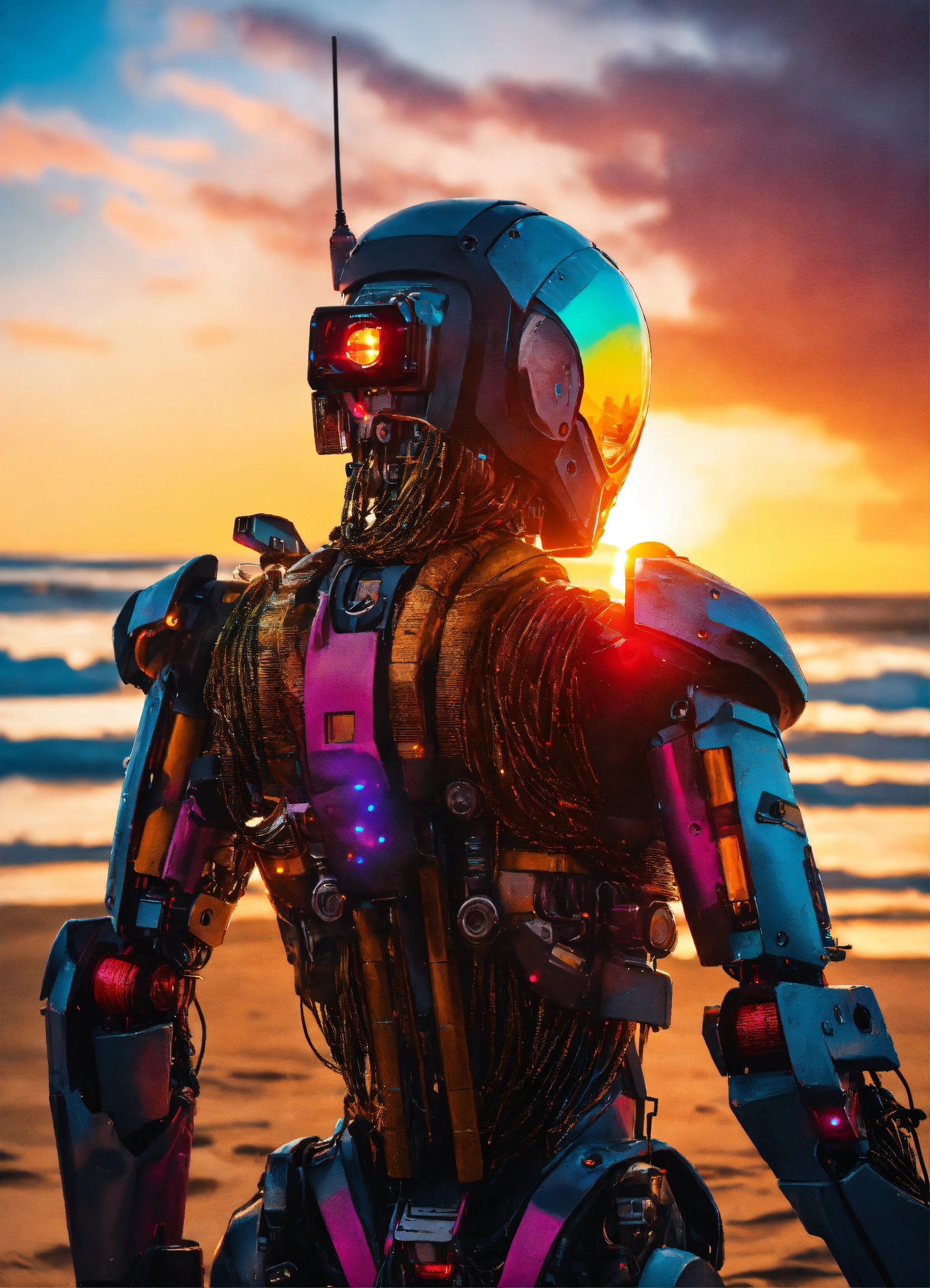 View of the back of a very human looking cyberpunk male android on beach looking off into the sunset with the sun visible and shining to the left of robots head. hyper realistic, vivid colors