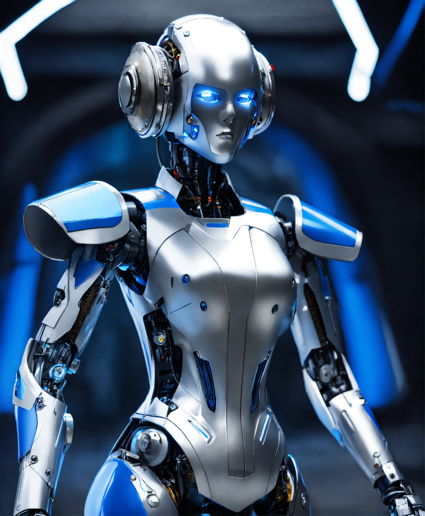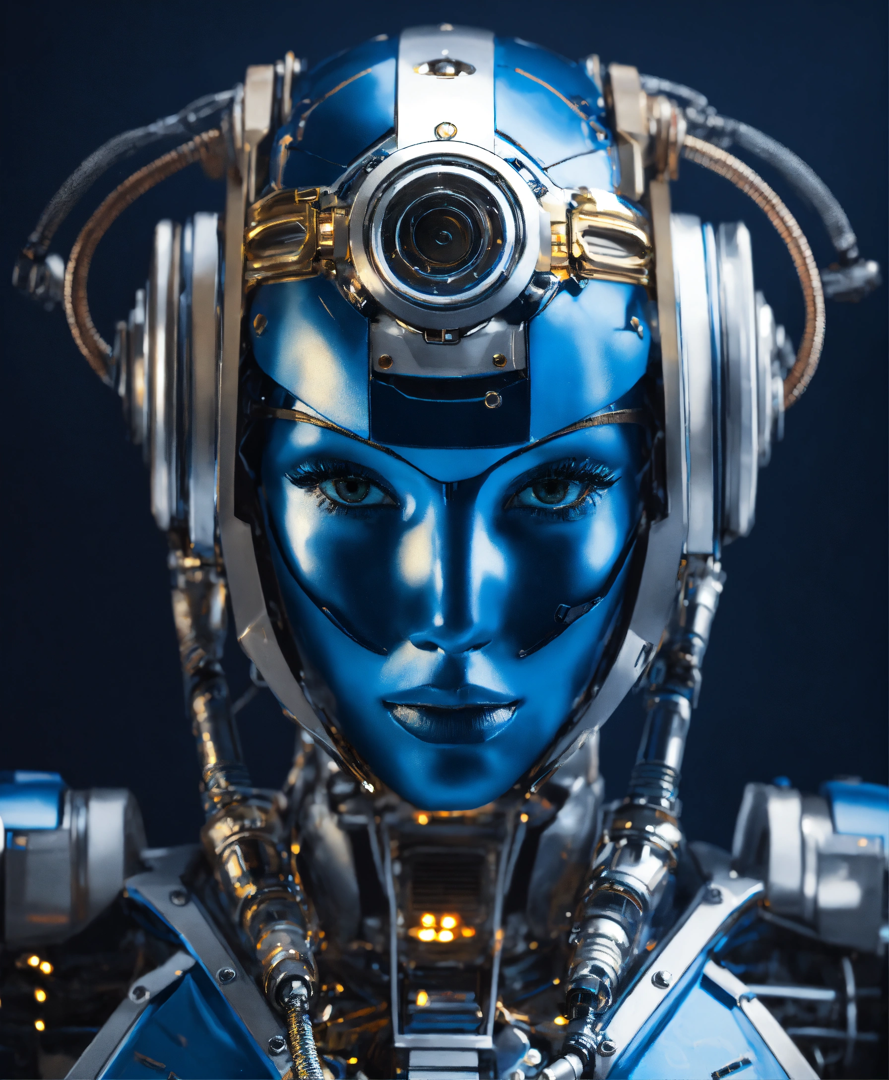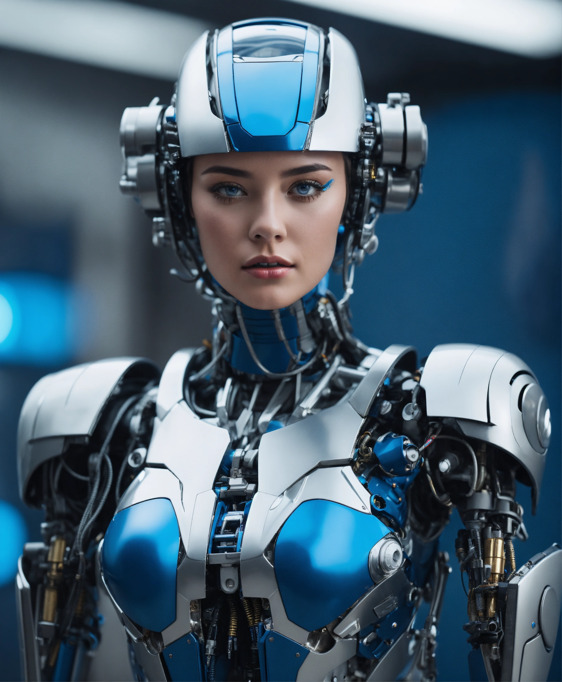 Upper body of a robotic woman in blue and silver mechanical dress with a helmet