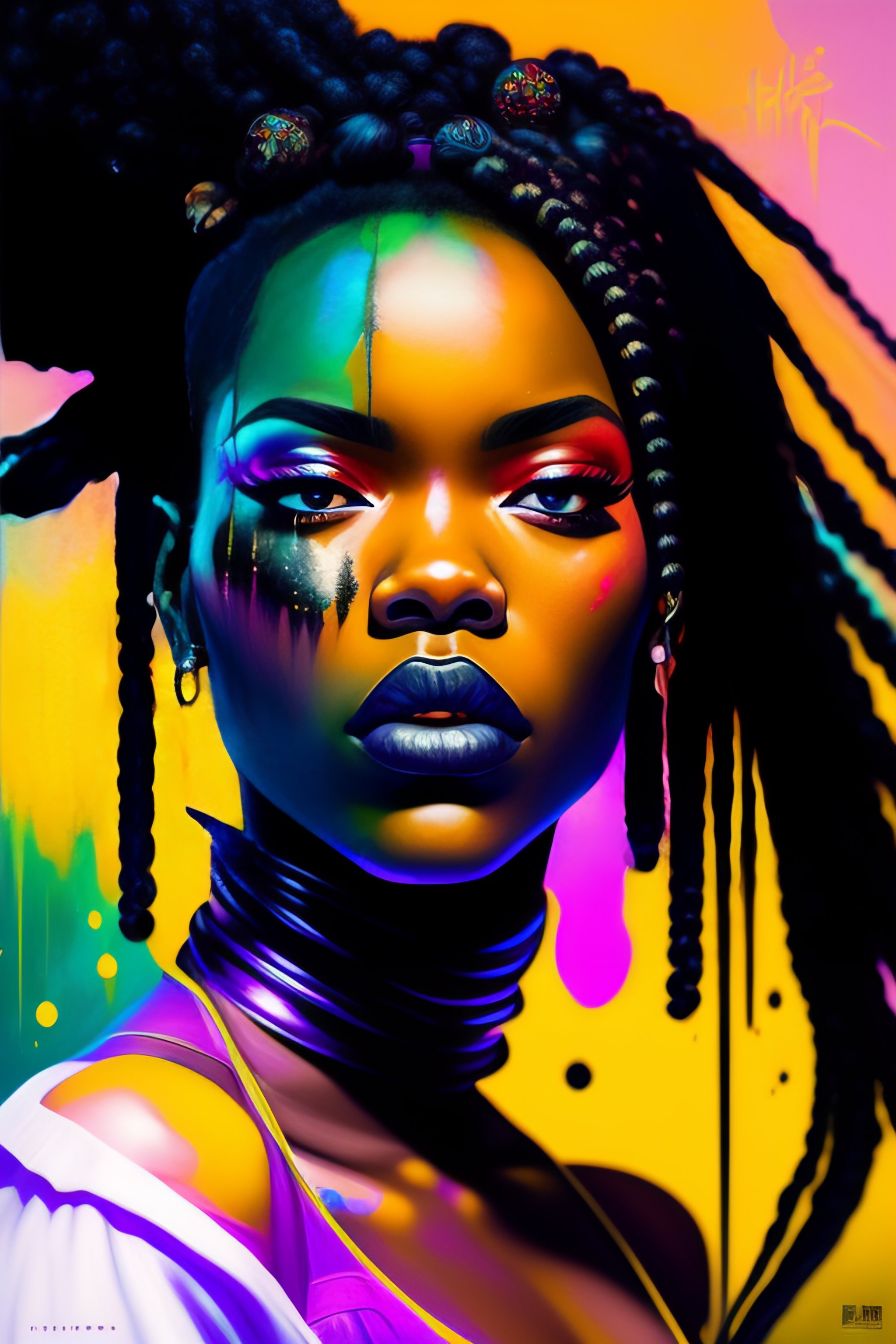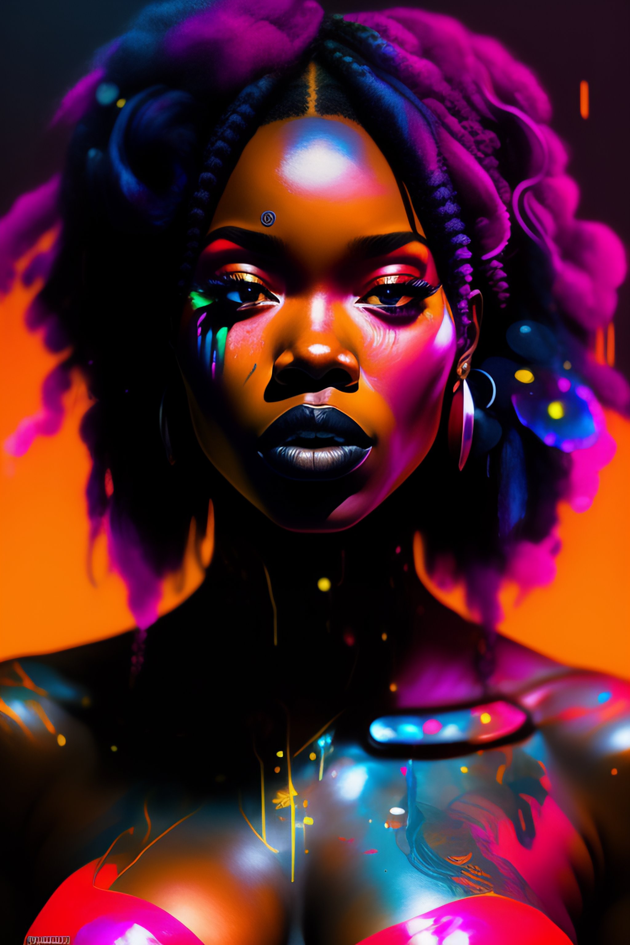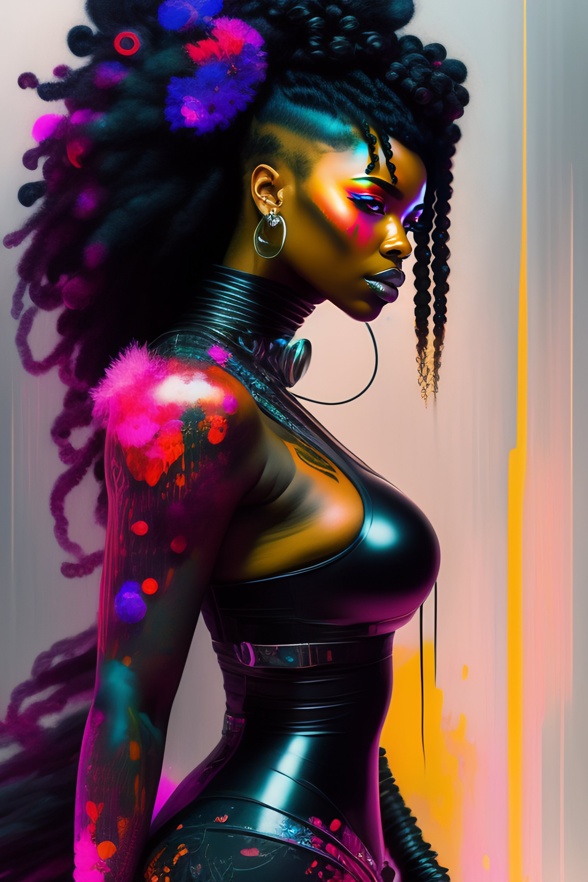 A black woman cyborg, grafitti, part machine, part human, splatter, tattoed, neon, neon ink, neon light, hair on fire, in the style of adrian ghenie, esao andrews, jenny saville, edward hopper, surrealism, dark art by james jean, takato yamamoto, inkpunk minimalism