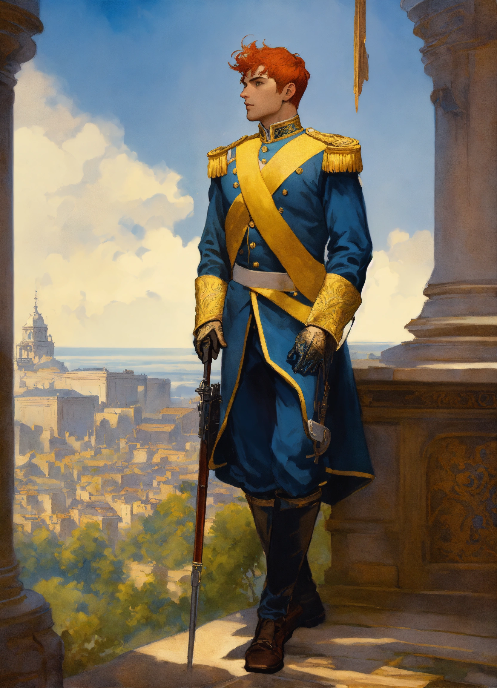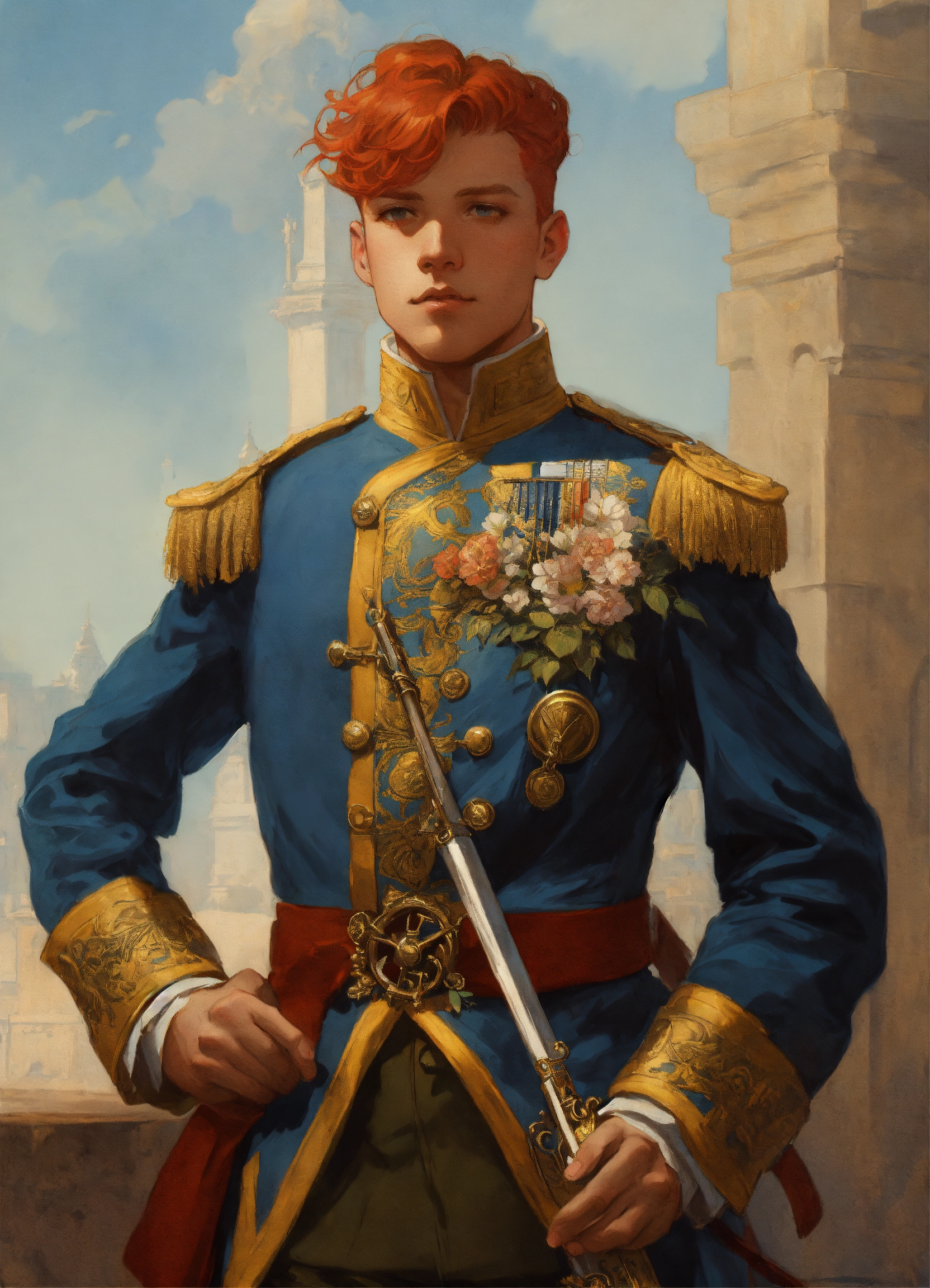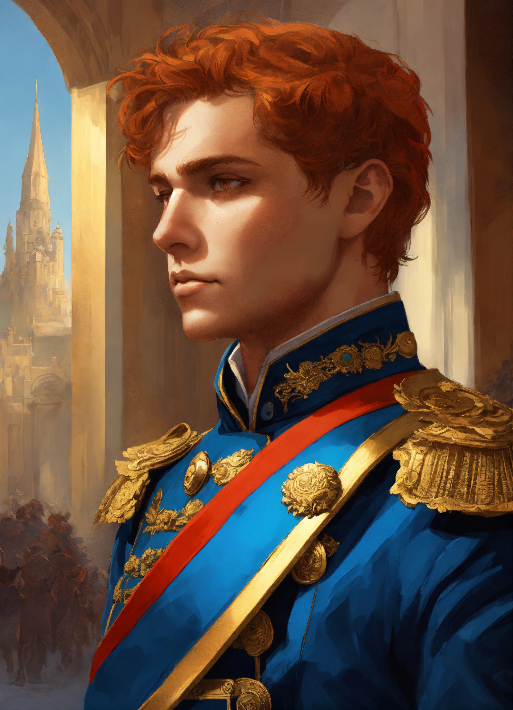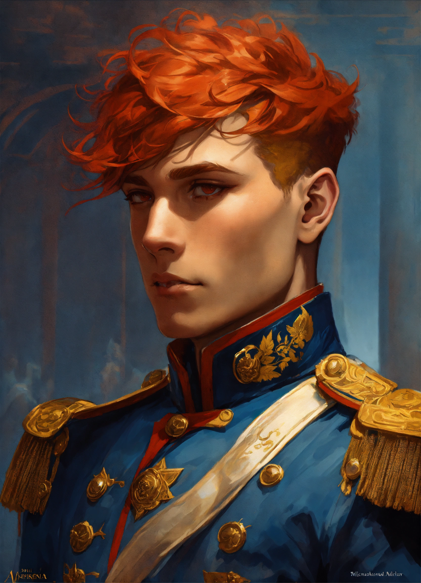 Male human early 20s, short red hair to one side, 19th century military blue and gold uniform . concept art, intricate details, highly detailed by greg rutkowski, michael whelan, and gustave dore, alphonso mucha, mystra