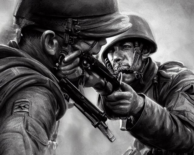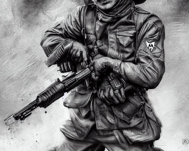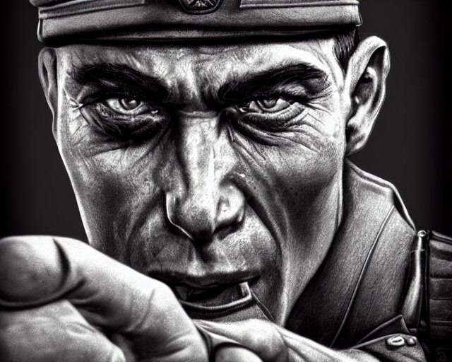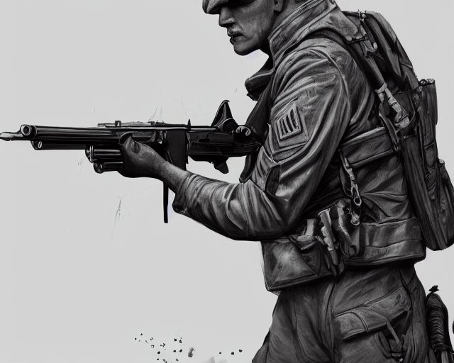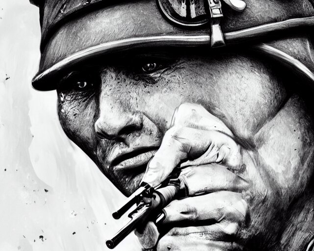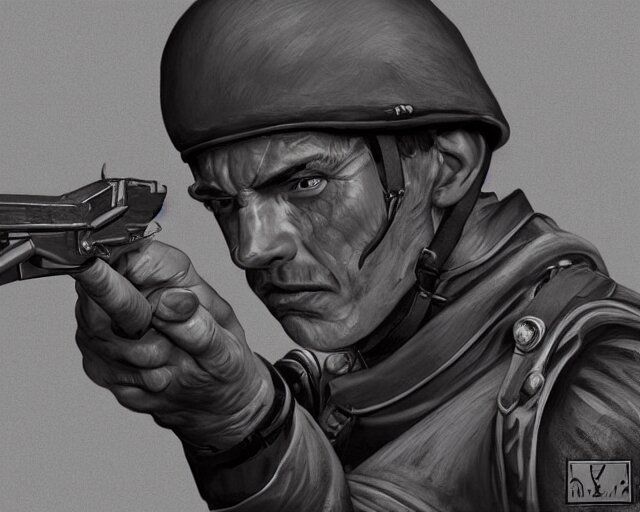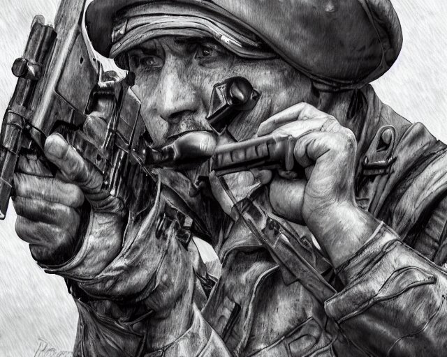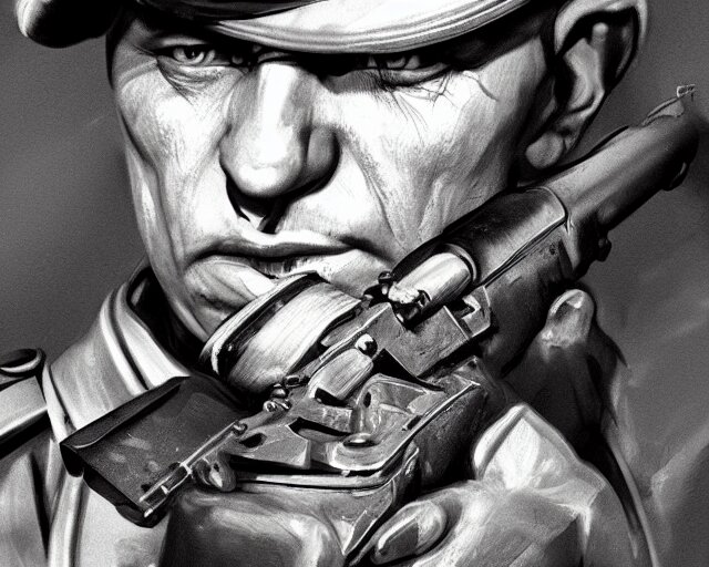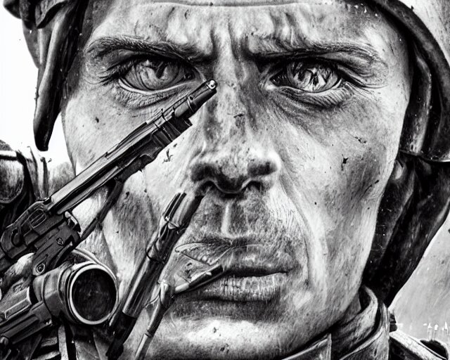 A soldier aiming a gun, hateful face, world war 1, close-up, realistic face, beautiful face detail, mature facial features, black and white, amazing digital art, hyper detailed, artstation, in the style of tony sart