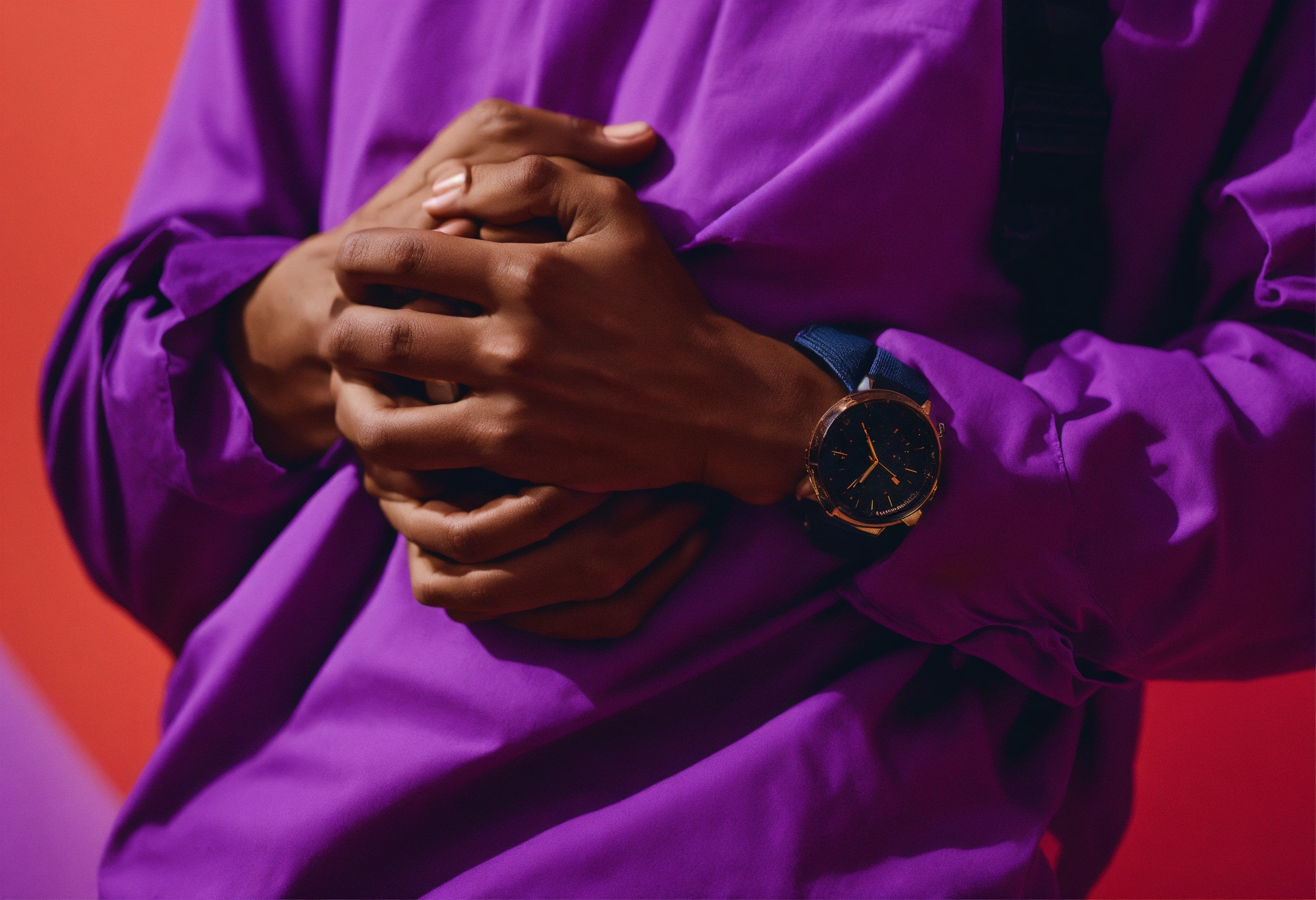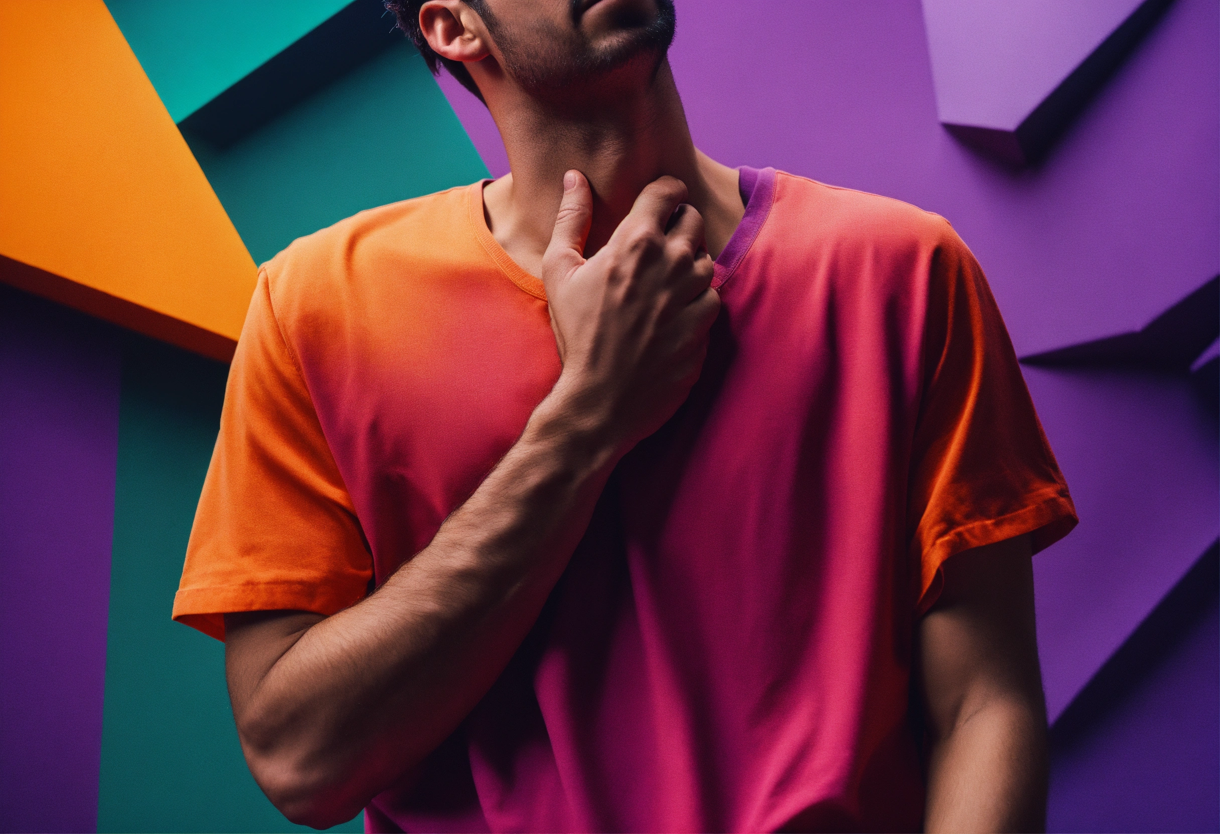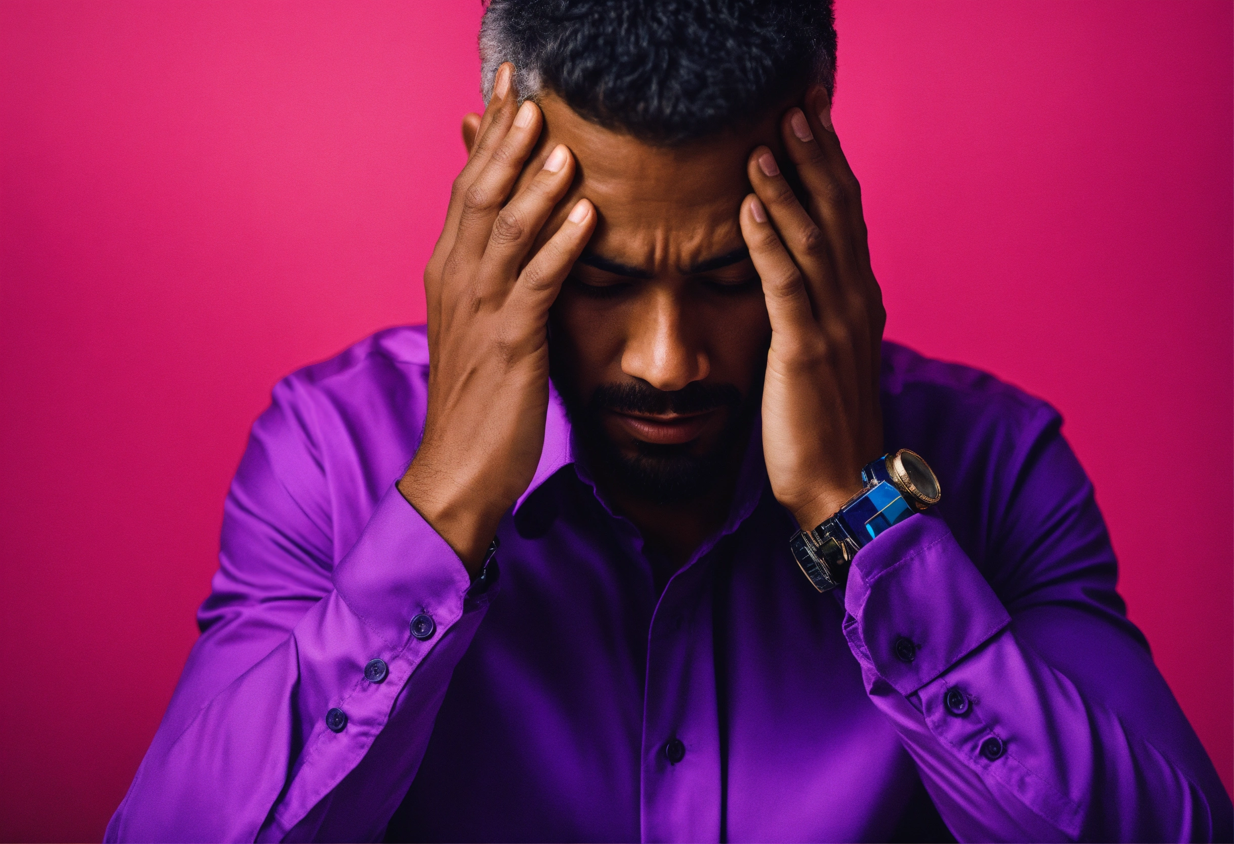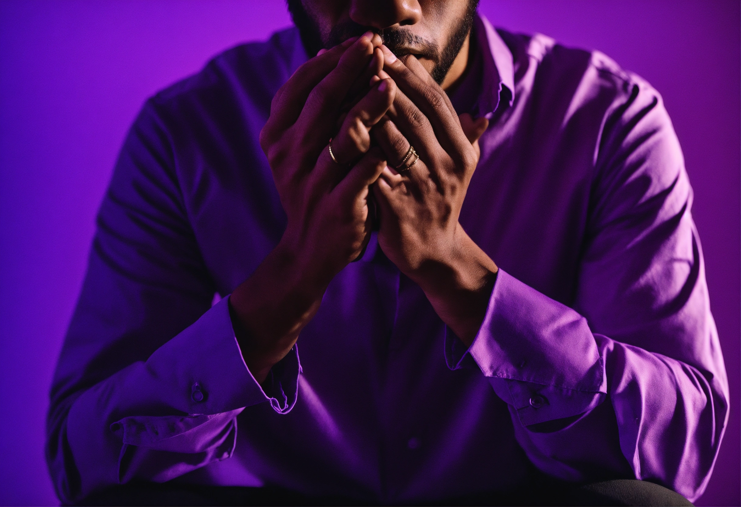 Close up, telephoto, man in purple shirt holding his hands in pain. geometric composition, bold colours