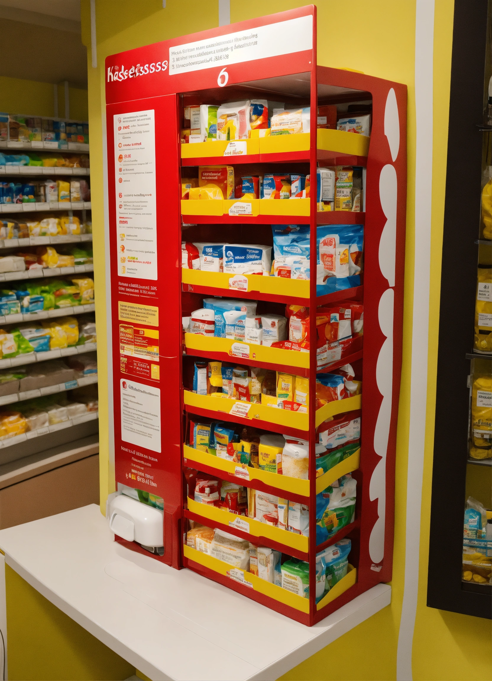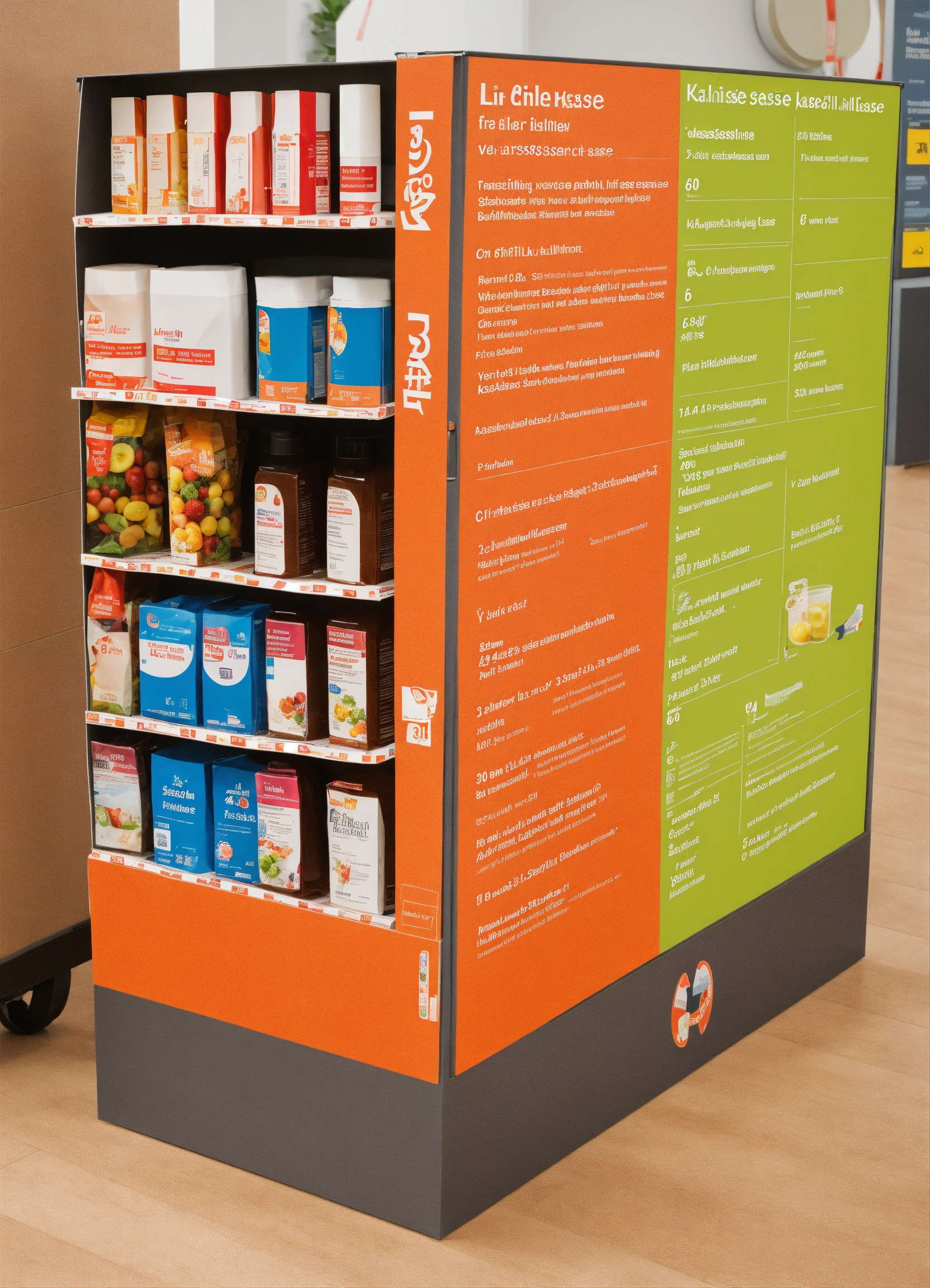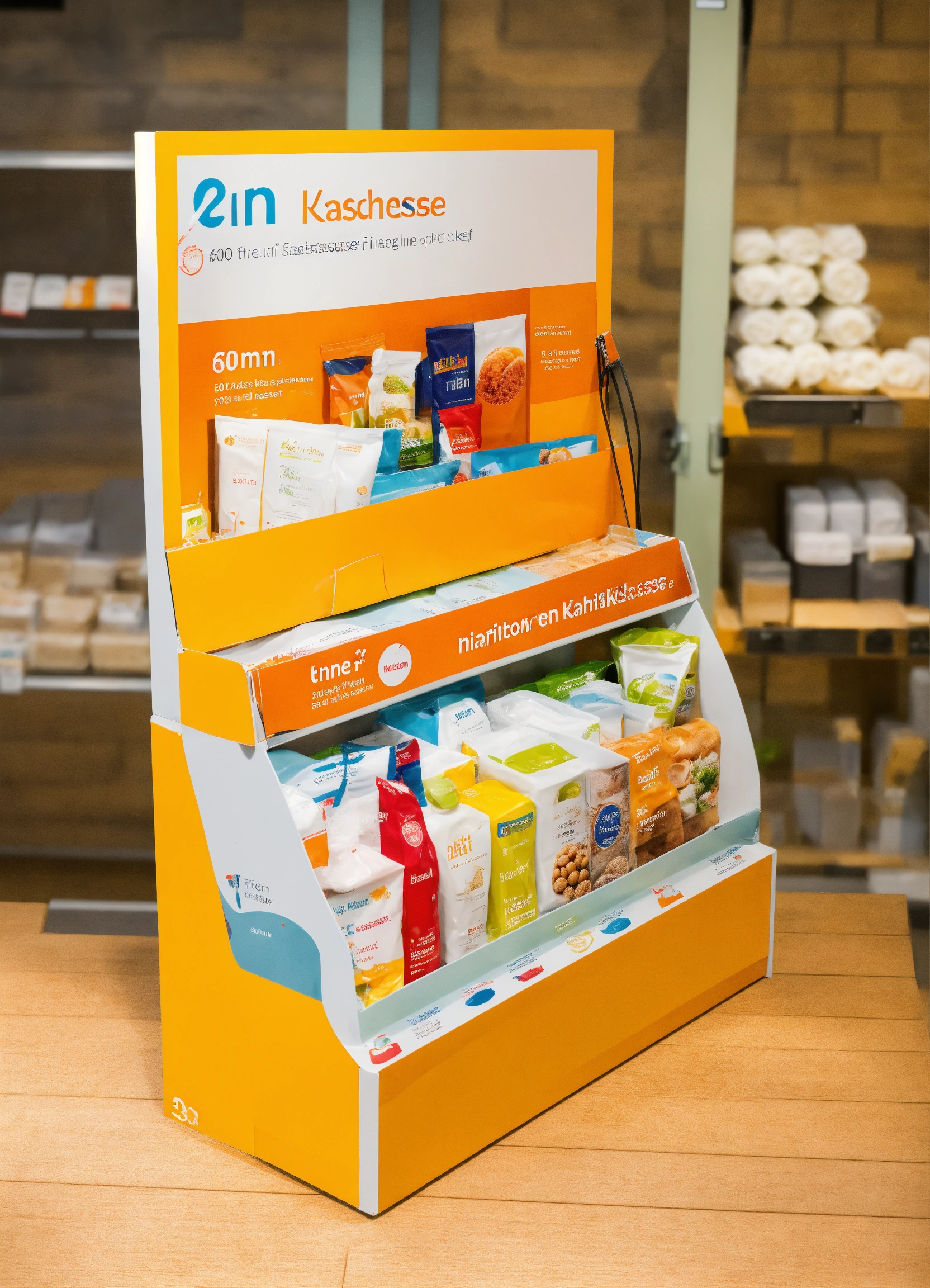 Ein kleines verkaufsdisplay steht neben der kasse im sanitätshaus. es besteht aus karton und ich 60m hoch, 40 cm breit und 30cm tief. befüllt mit 6 flach liegenden produktverpackungen