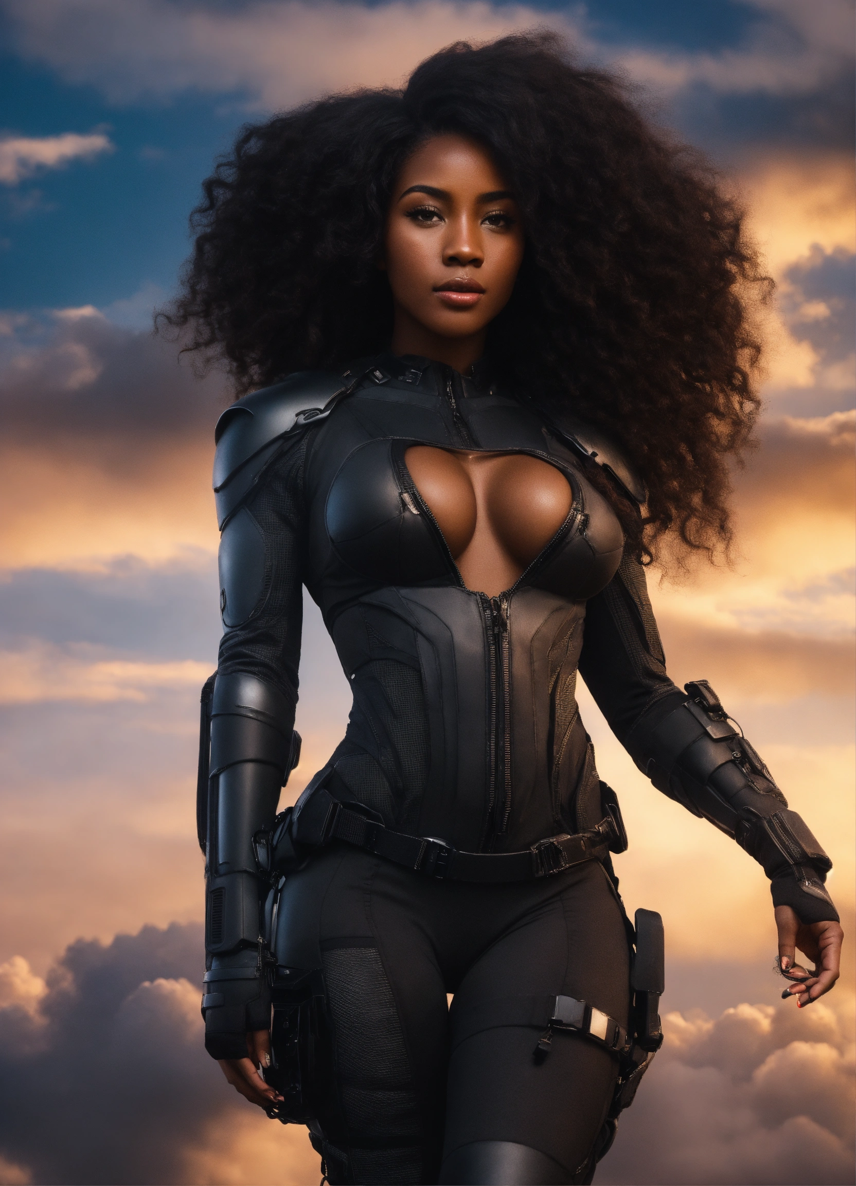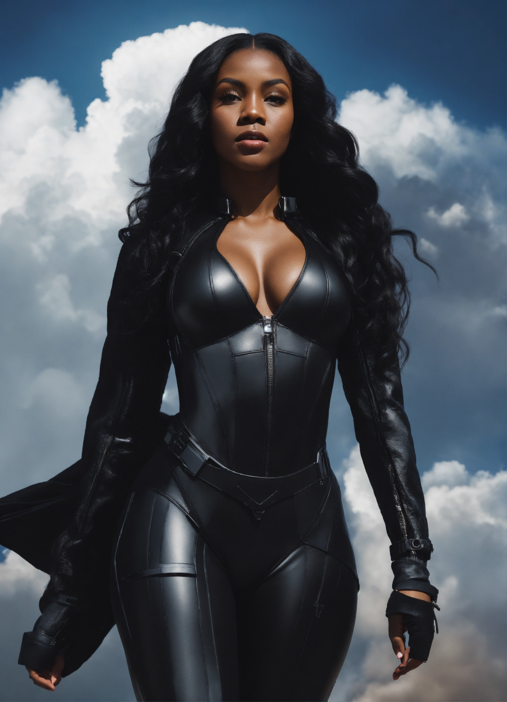 A beautiful black girl goddess, a hottie, perfect face perfect figure, shapely beautiful goddess with long dark hair hour-glass figure wearing a black spy stealth suit, walking in the clouds, resolution 8k, insanely detailed