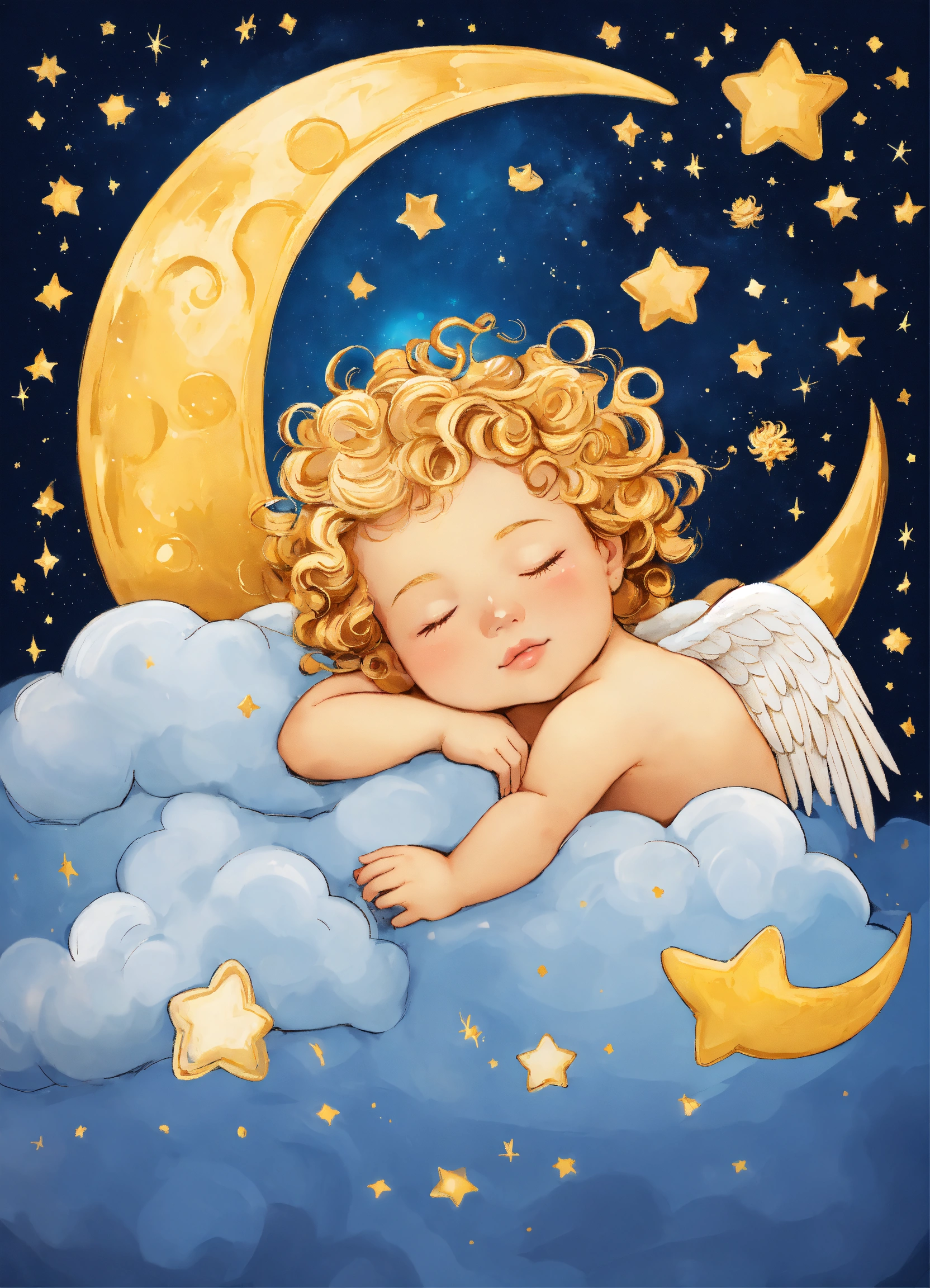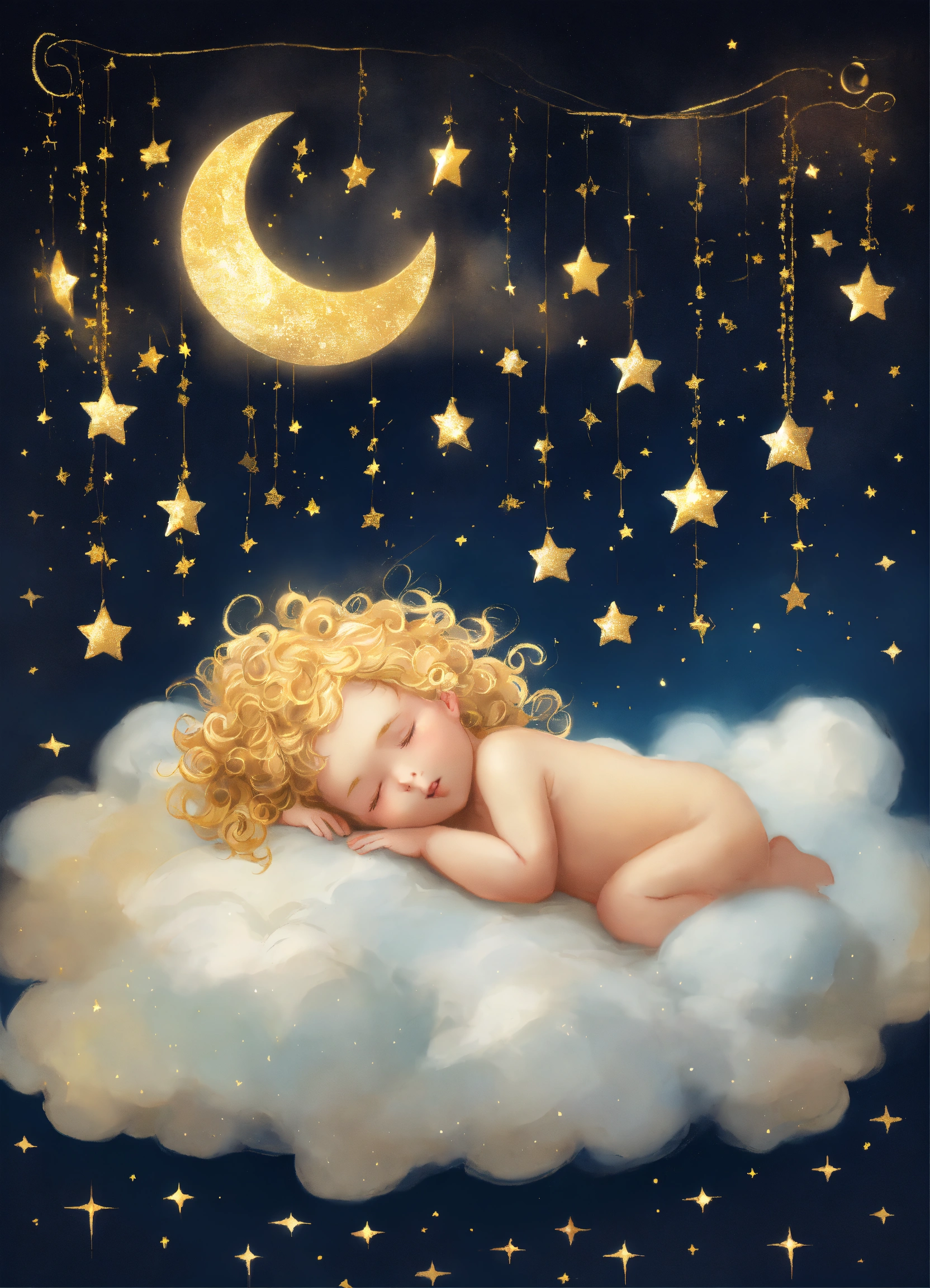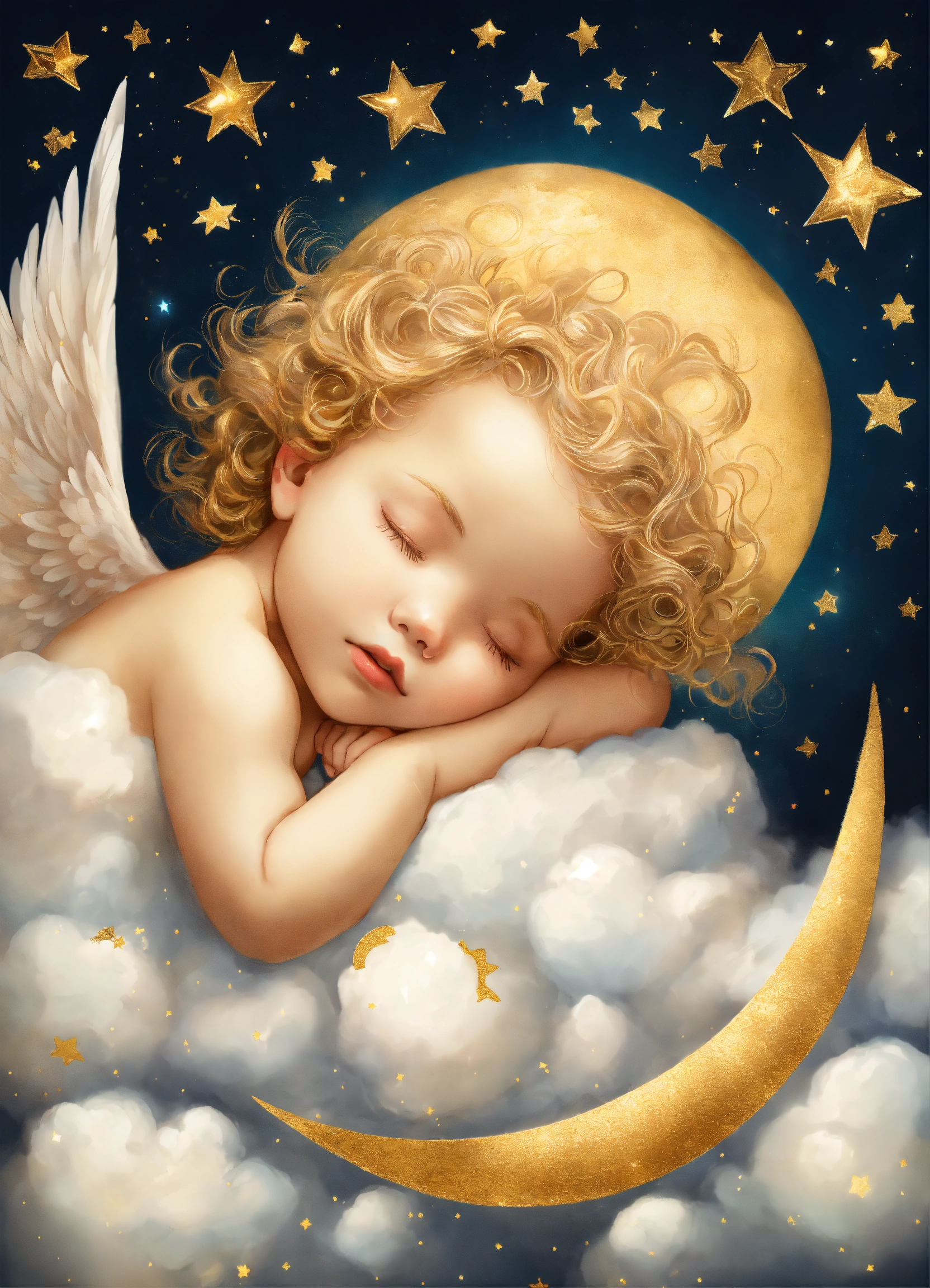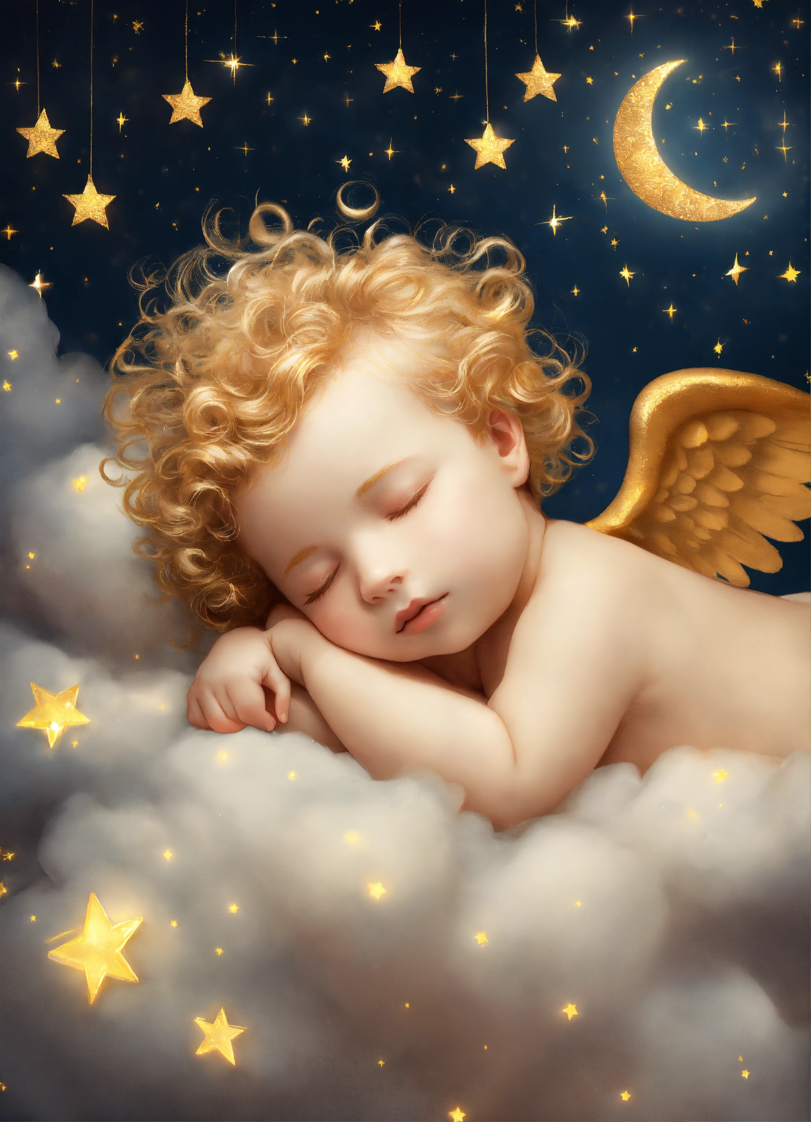 A little angel baby with golden curls sleeping on a cloud