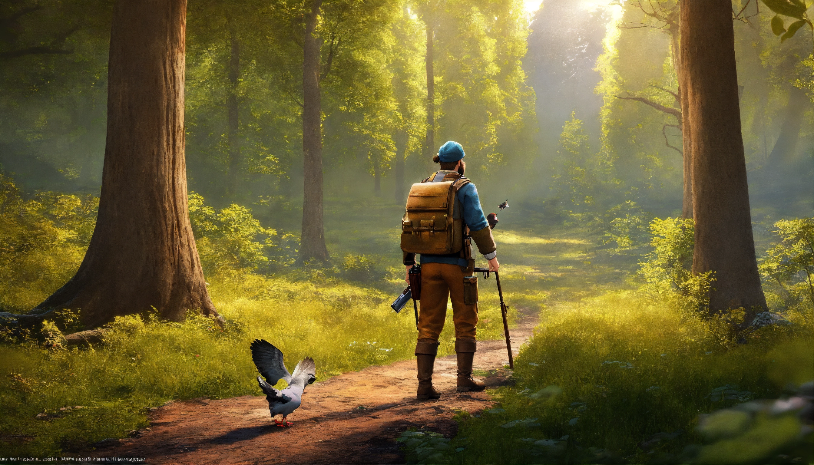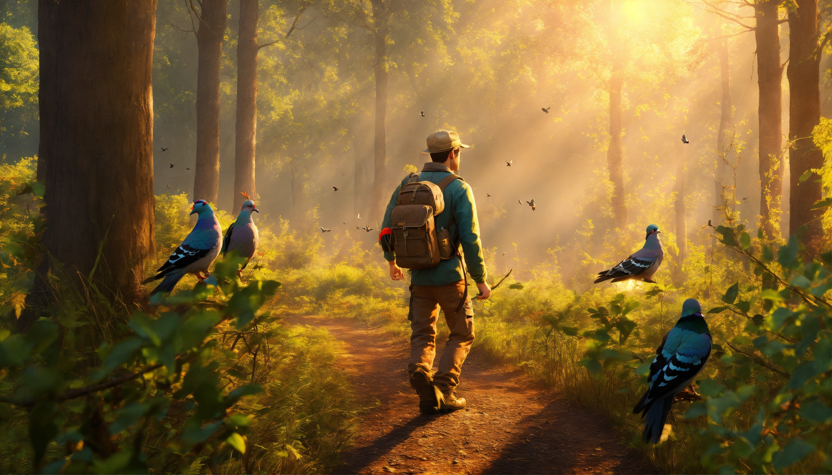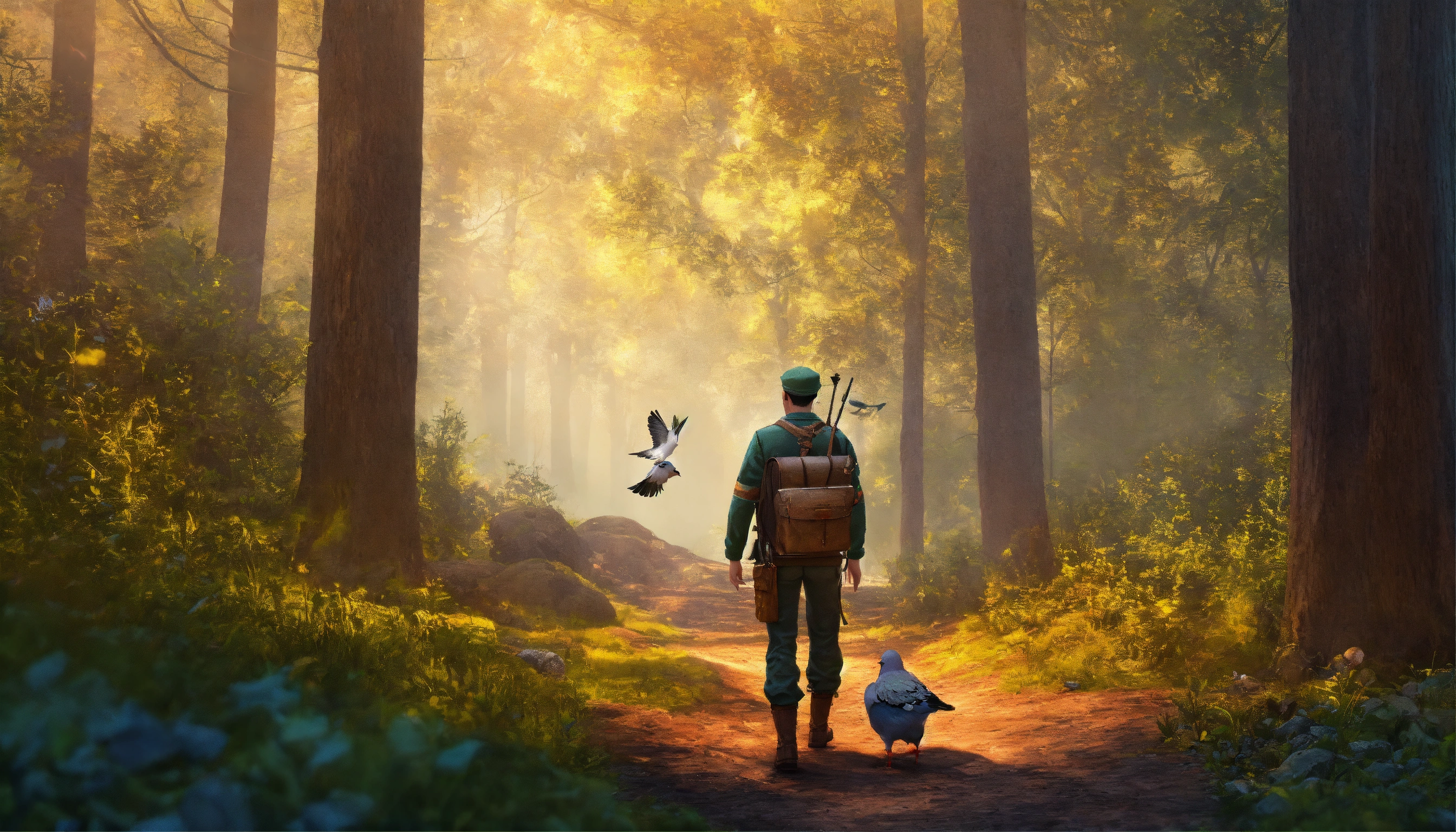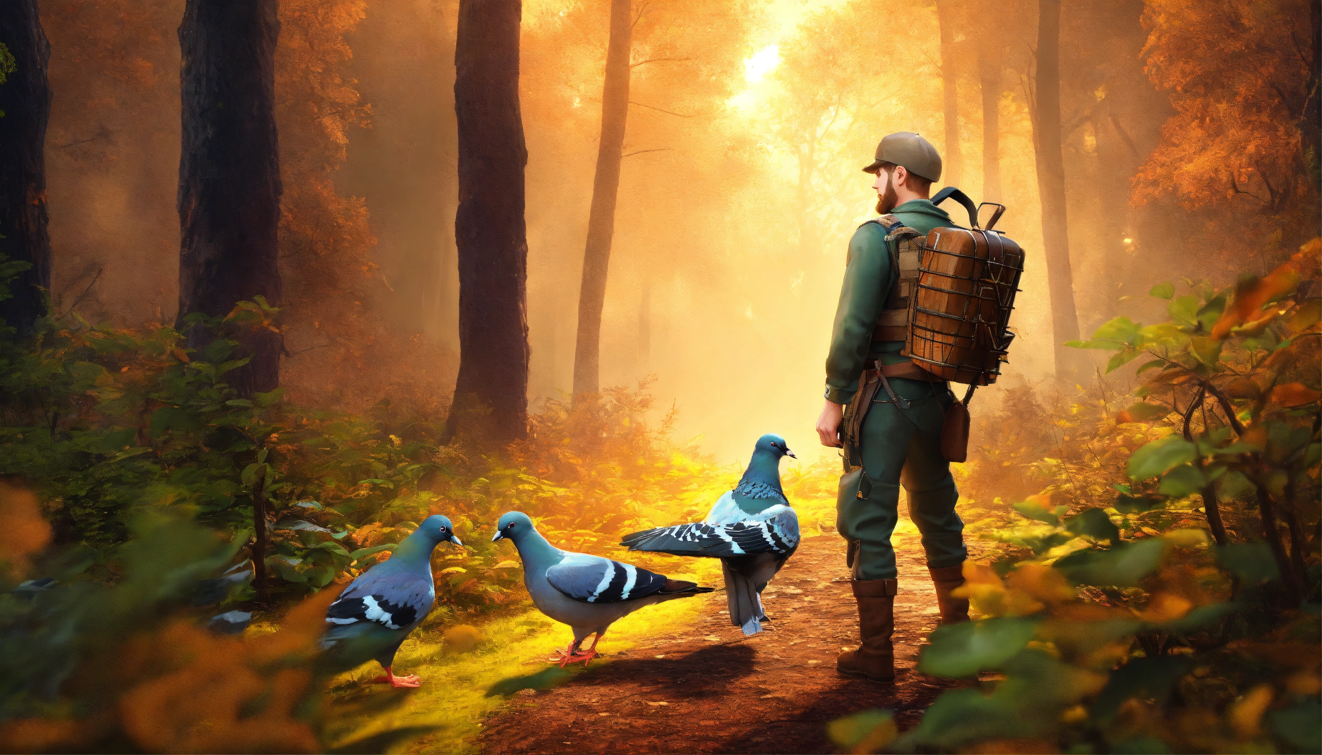 Generate an image hunter man with pigeon trap wandering in the forest, 3d pictures, storybook illustration, digital art, professional, high quality, detailed.