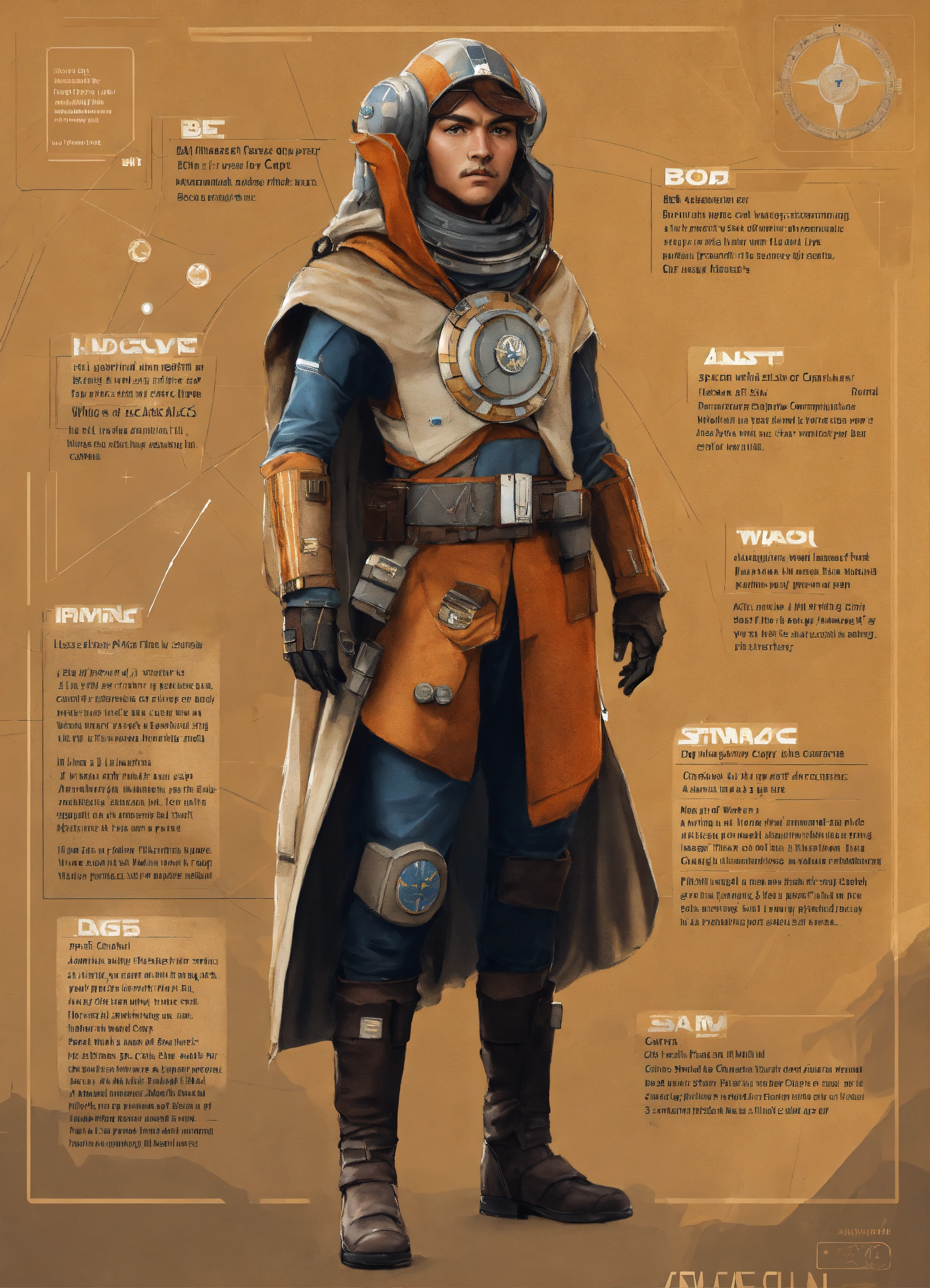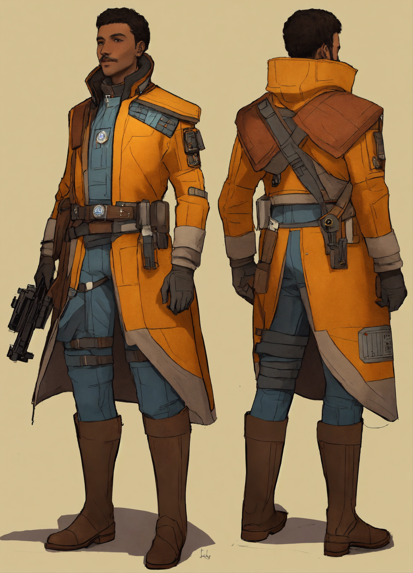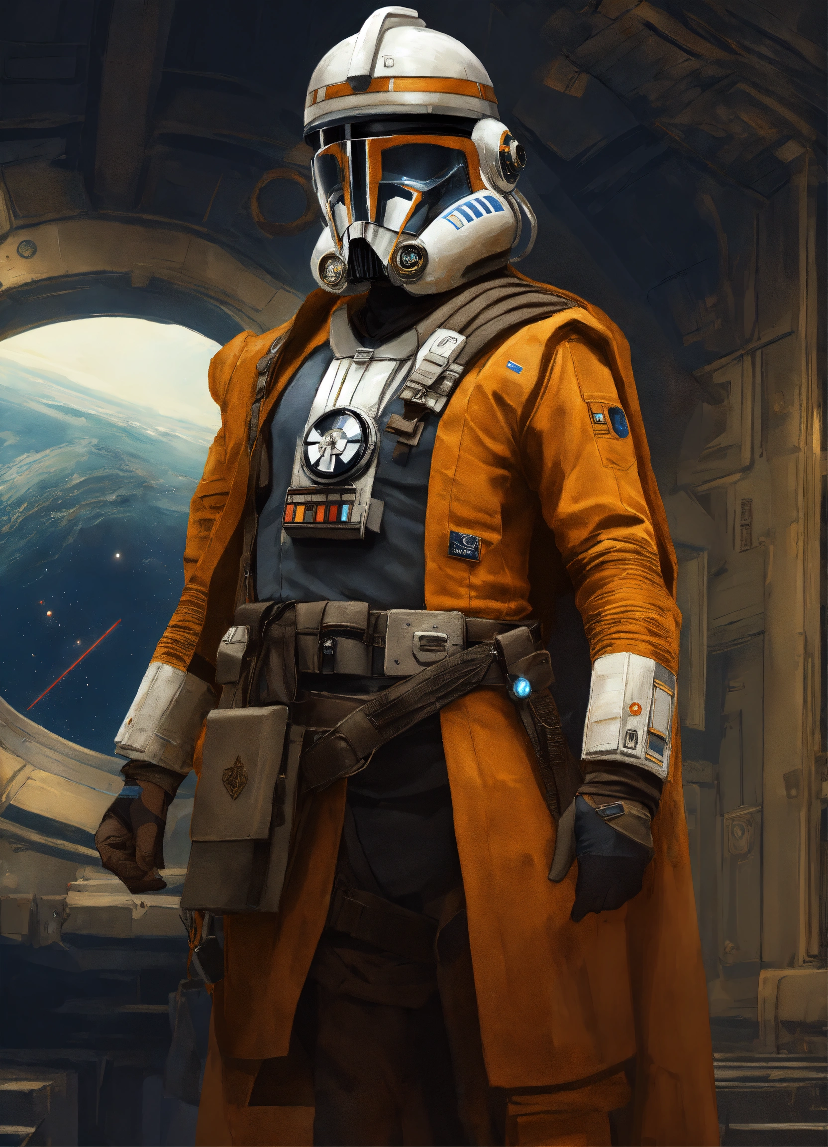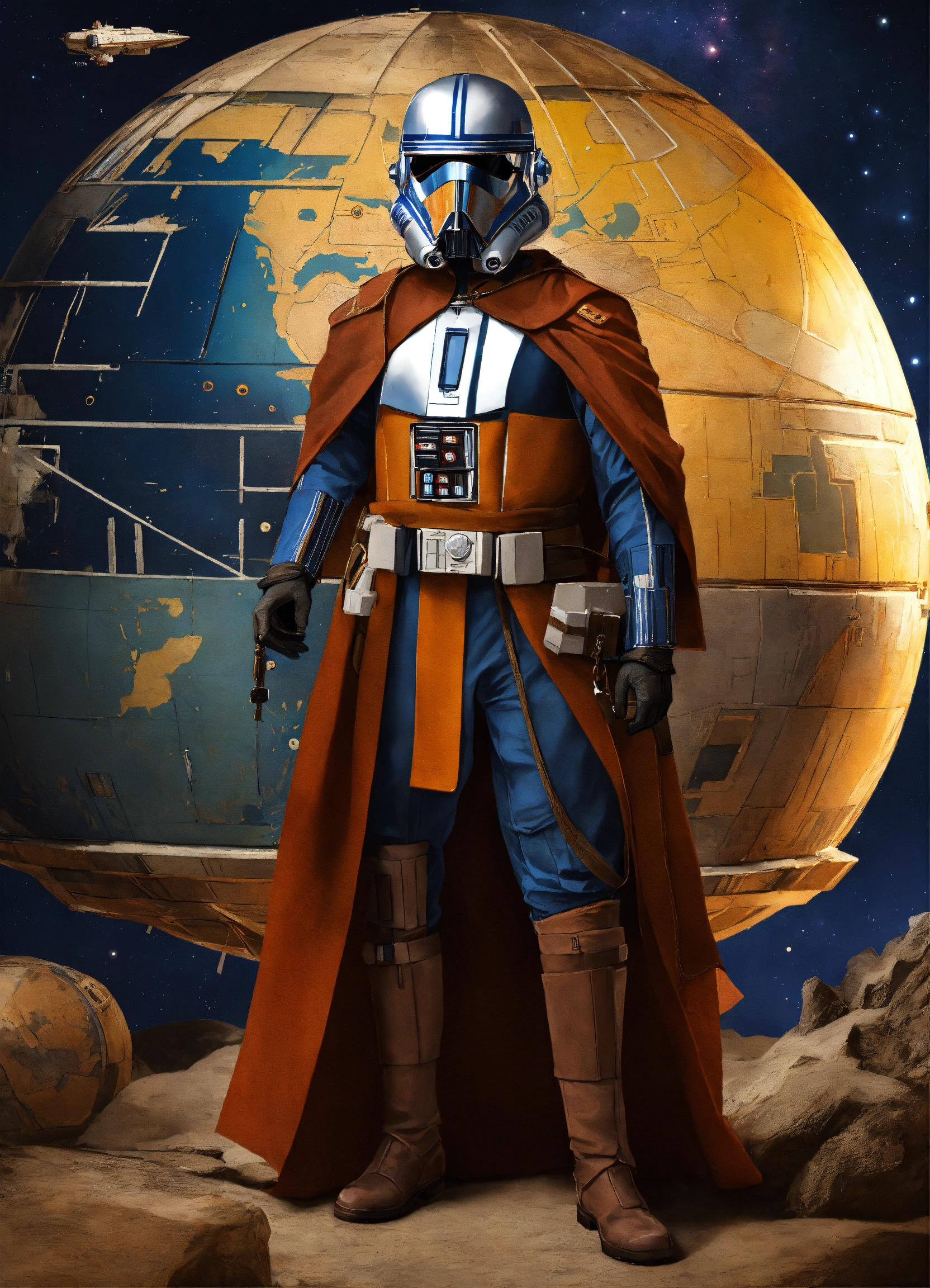Digital art of a star wars character with traits of a spacefaring captain. they should wear a weathered jacket or cloak reminiscent of the worn robes and uniforms of the star wars universe. incorporate some subtle nautical elements, like a stylized compass or astrolabe. their attire should include utility belts or harnesses equipped with futuristic gadgets. the character's overall demeanor should be confident and authoritative, with a hint of roguish charm.