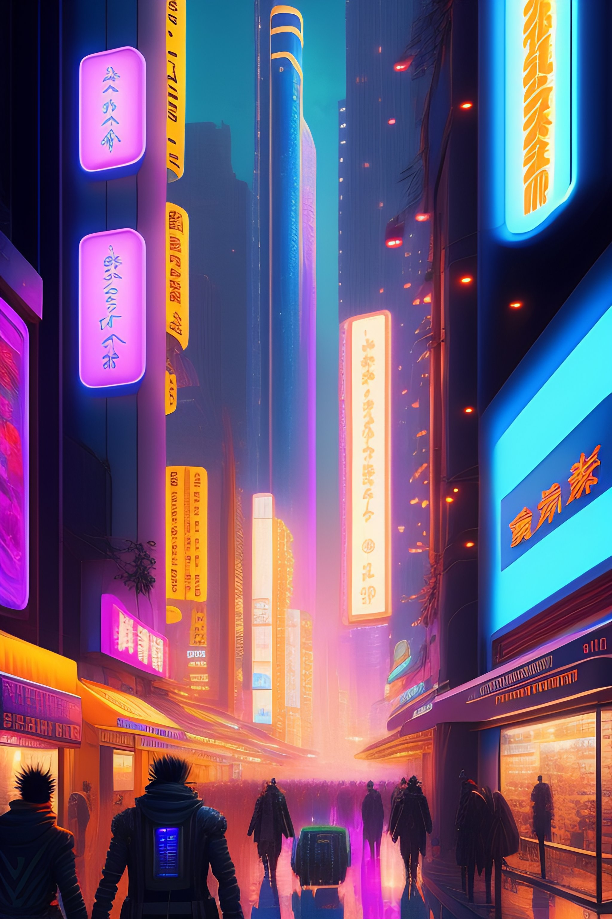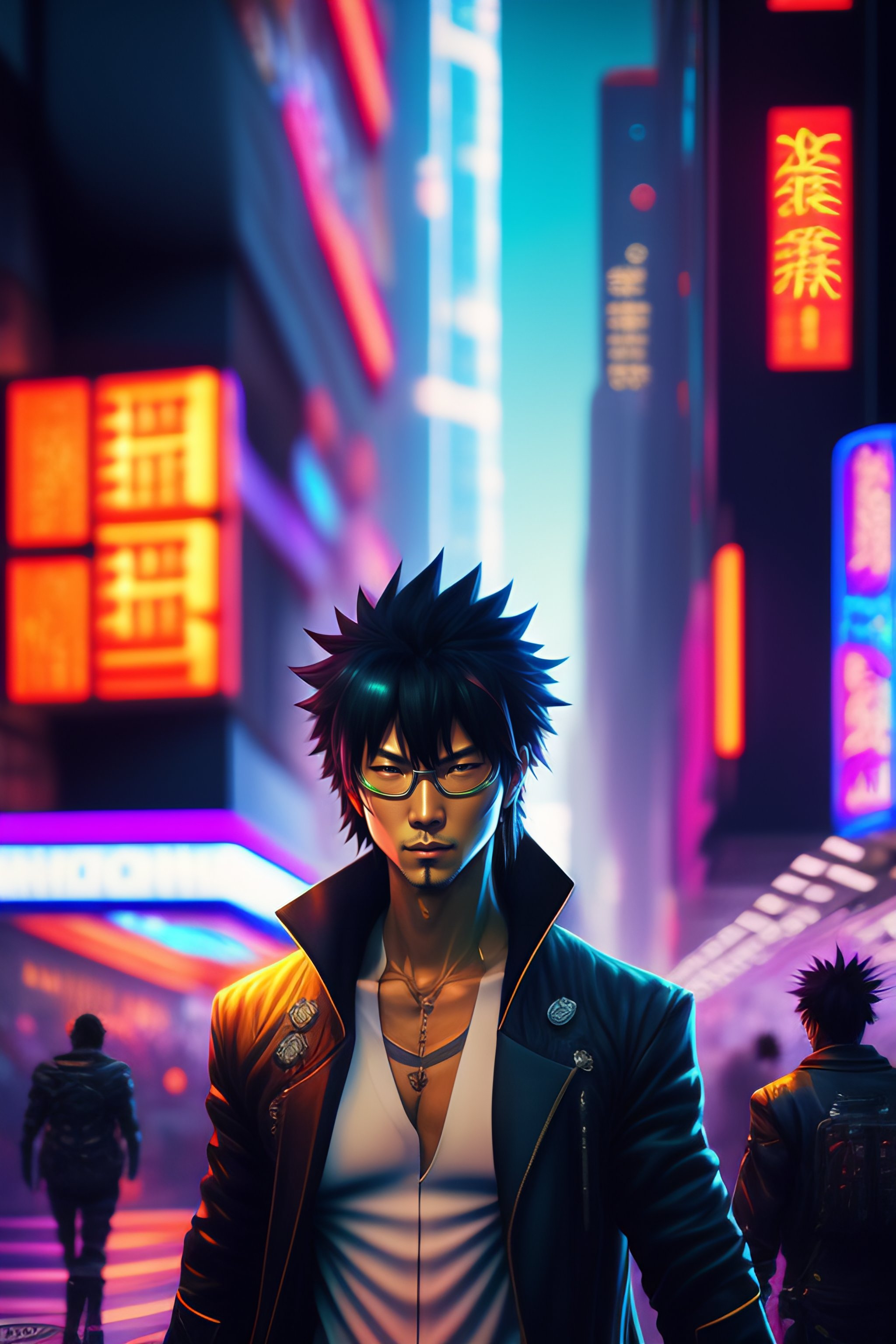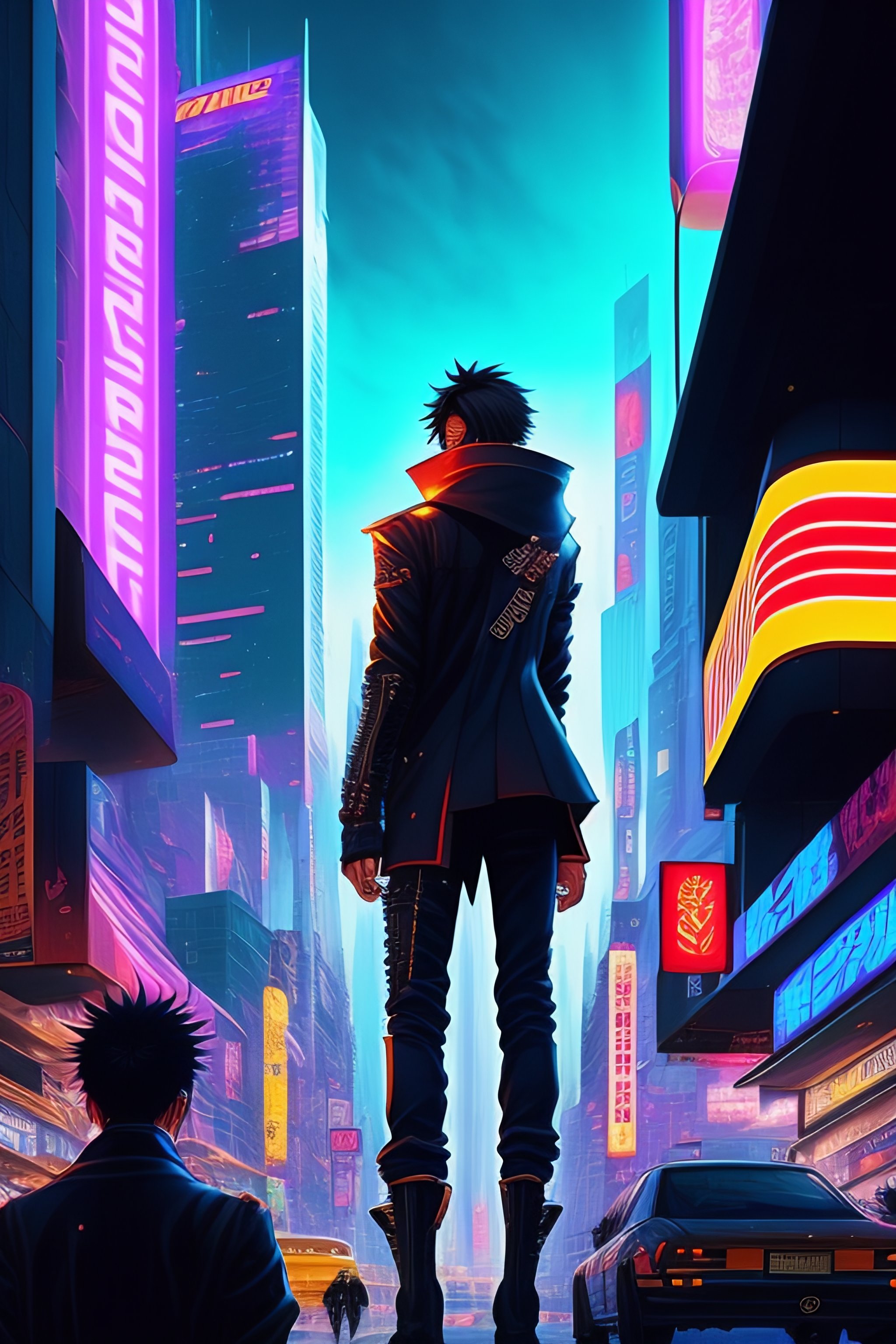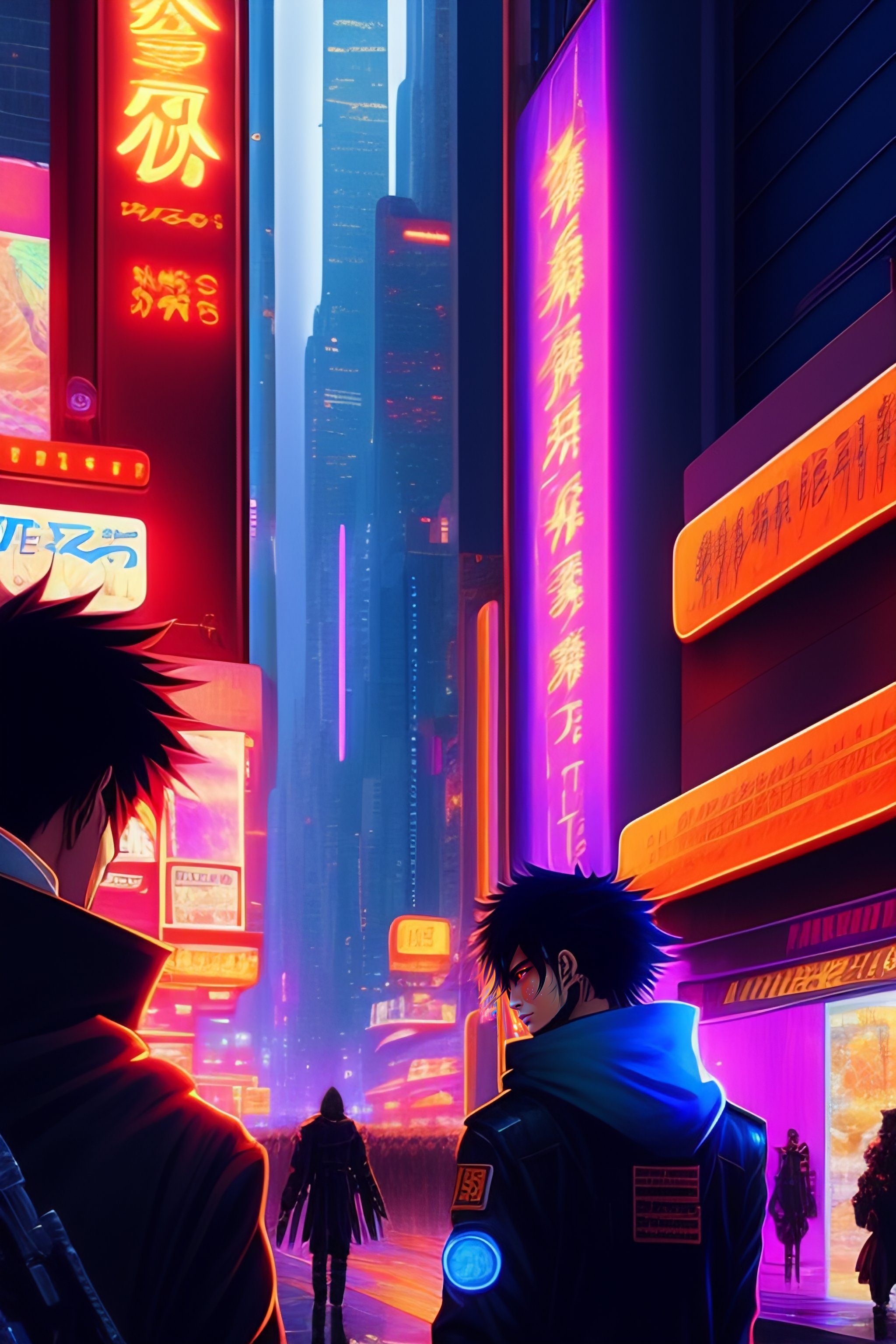 Futuristic cyberpunk style. a crowded, chaotic streetscape filled with holographic advertisements; kurosaki ichigo hacking through the chaos; by masamune shirow, eiichiro oda, kōhei horikoshi, tite kubo, atsushi ōkubo, technology, neon, chaos