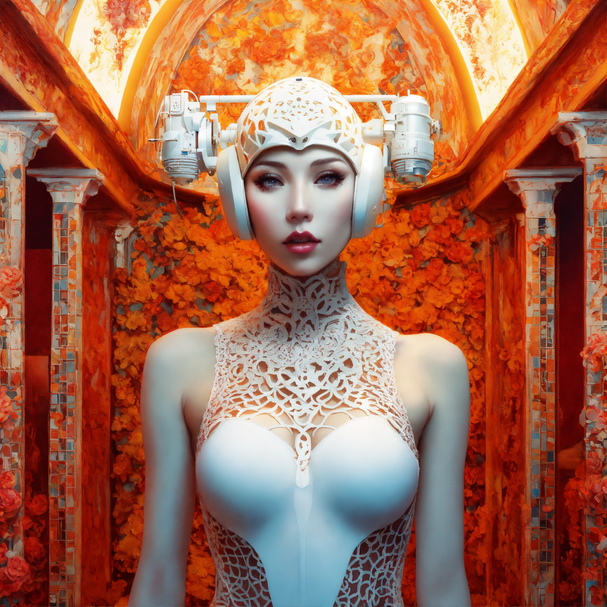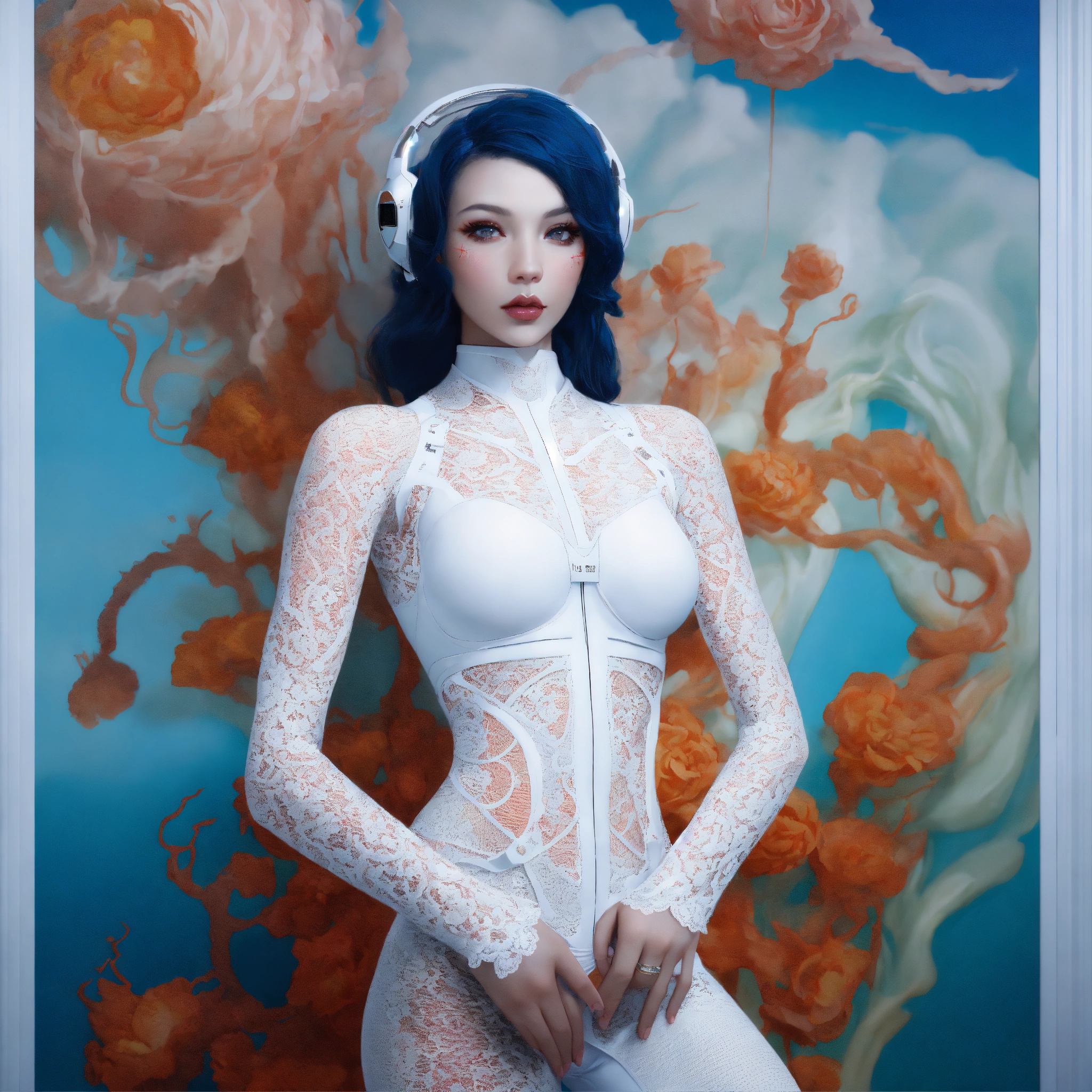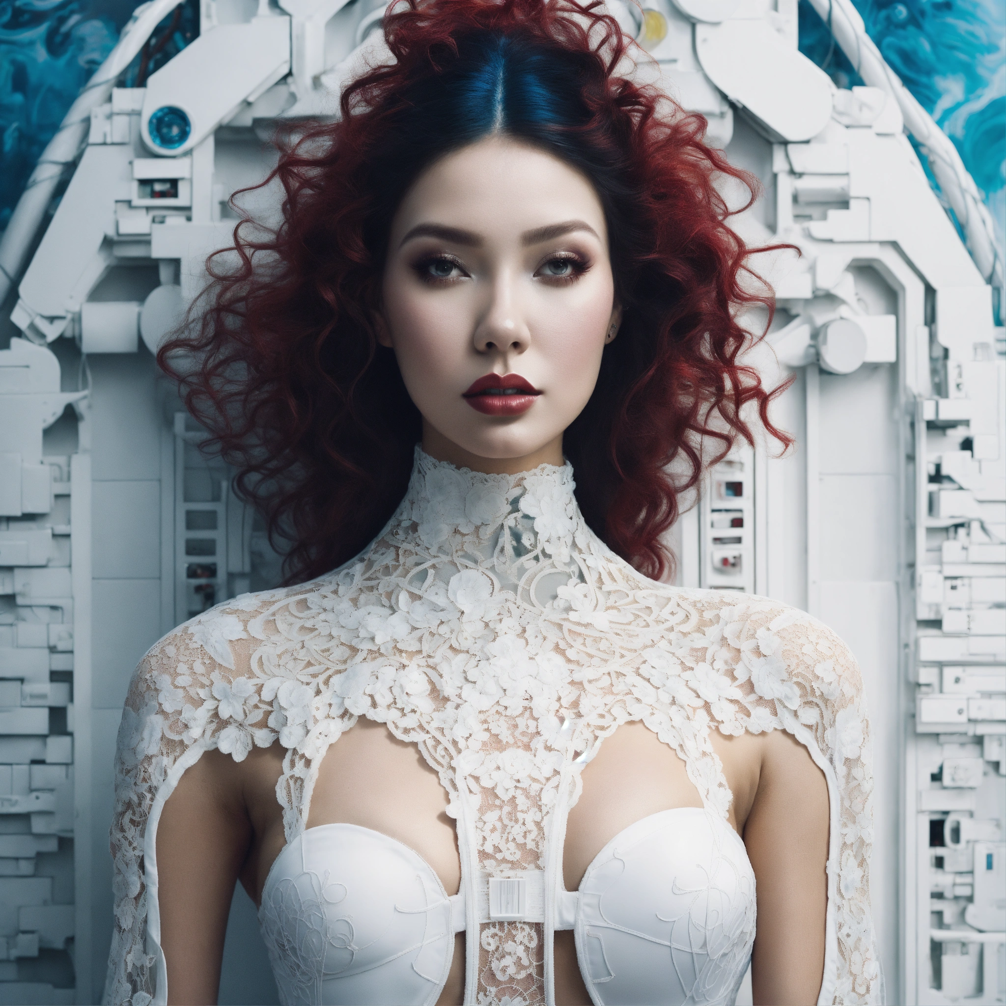 Deflagration of vibrant hues half body shot photography, a hi tech sci-fi well shaped body woman, in a white tight-fitting lace, with her cybernetic implants, in front of a white wall, 80 degree view, art by sergio lopez, natalie shau, james jean and salvador dali