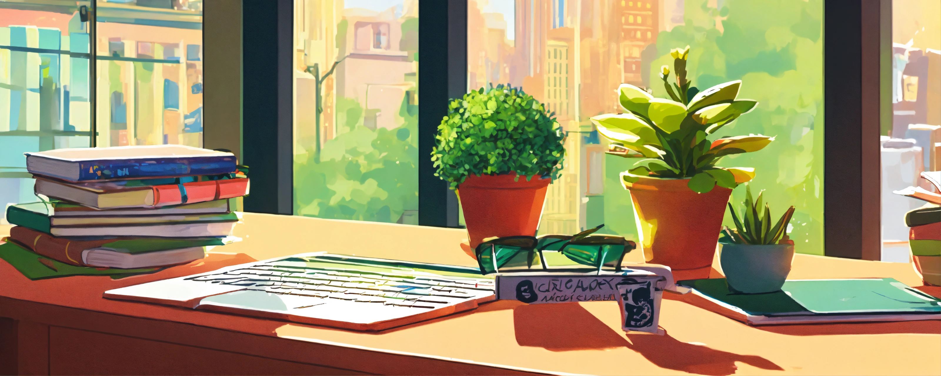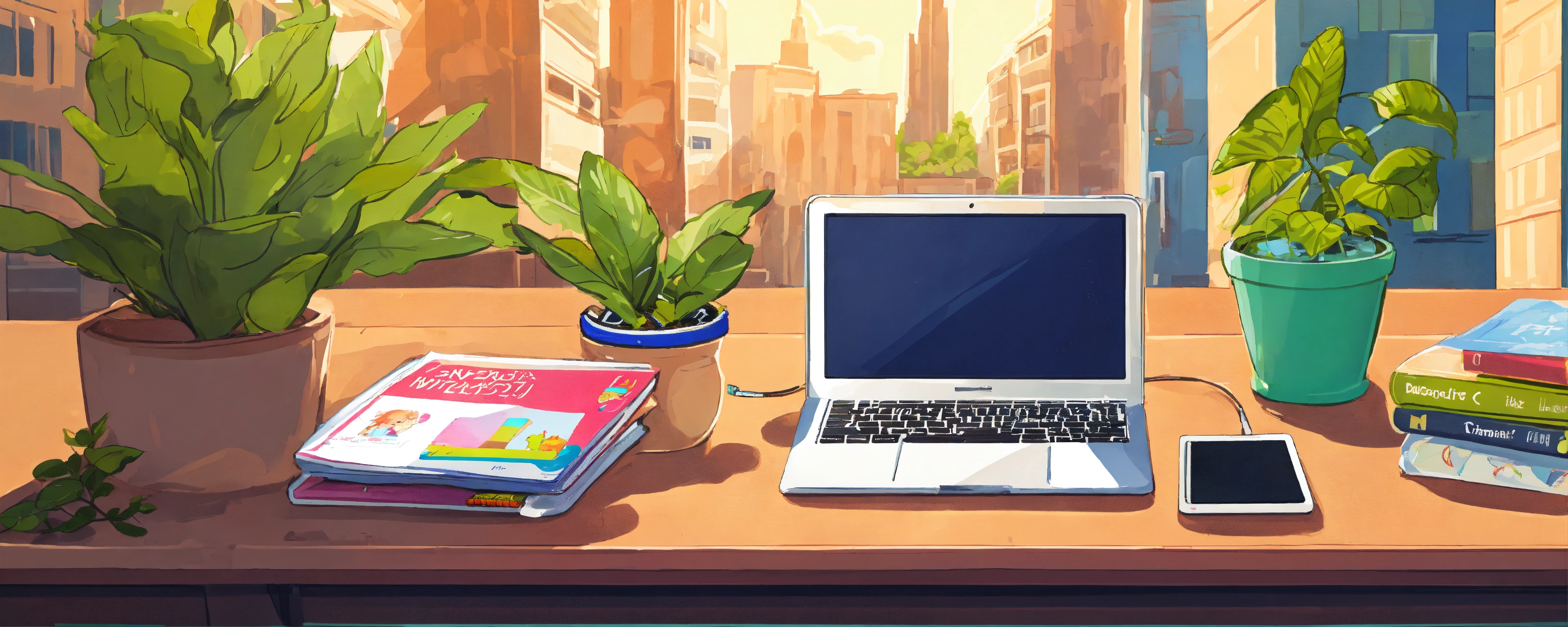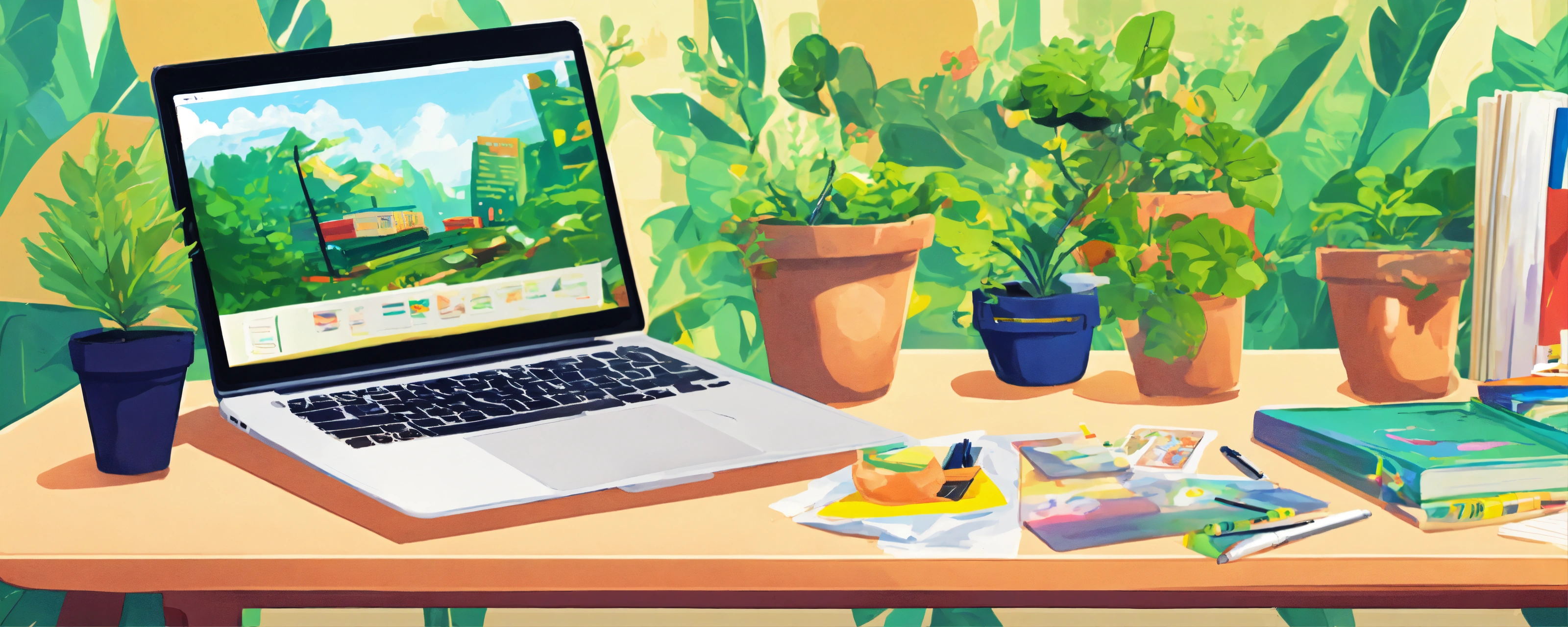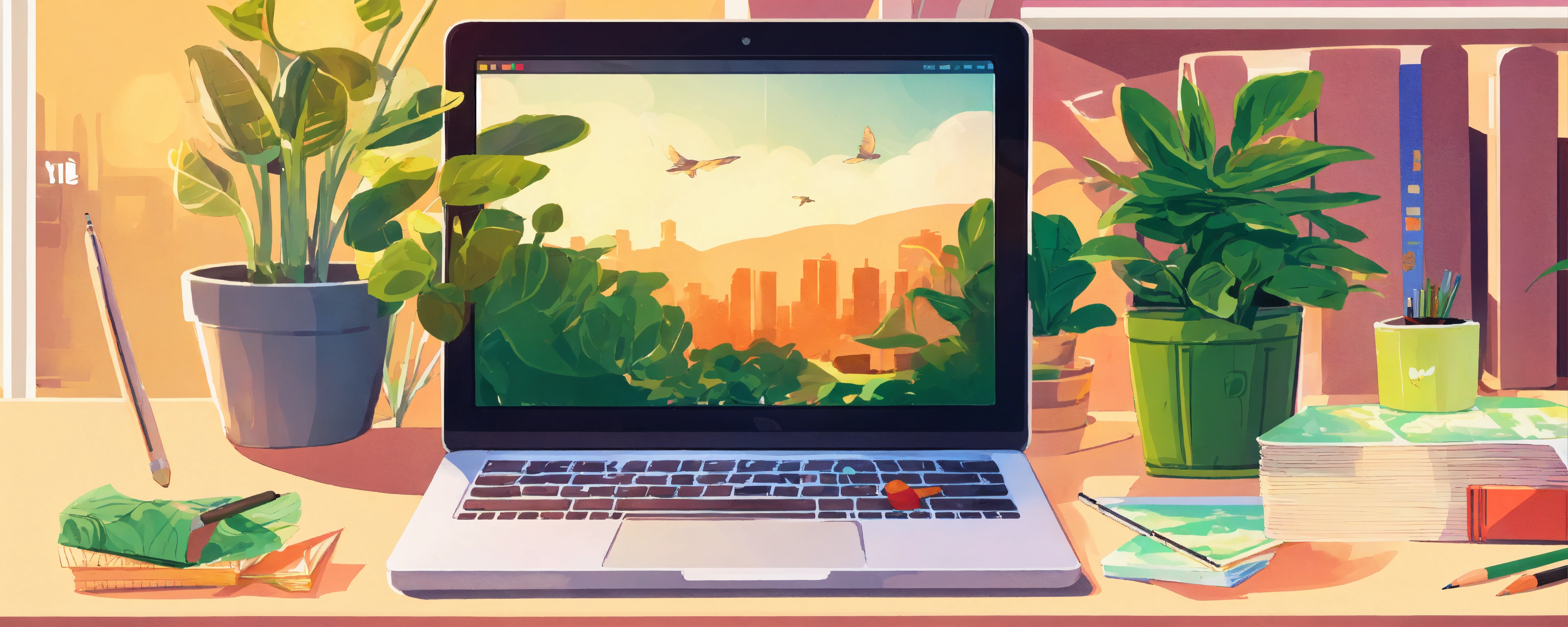 Macbook, educational, books, magazine, pencils, sketches on the desk, stickers, ideas, sunny day in the city, green plants, flat illustration