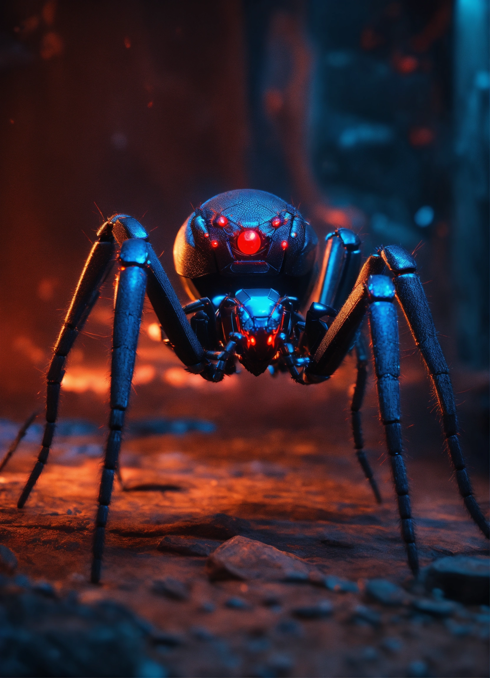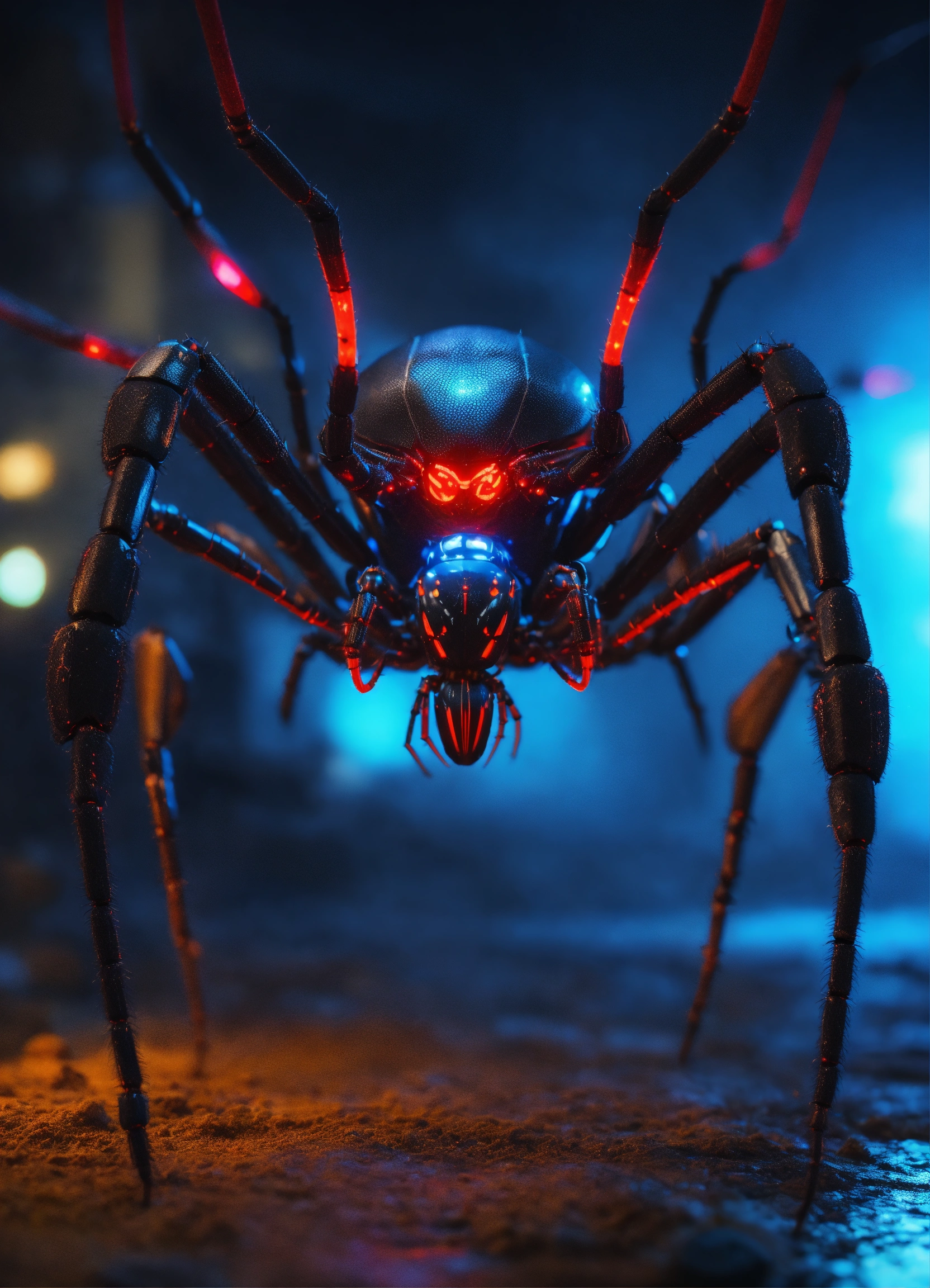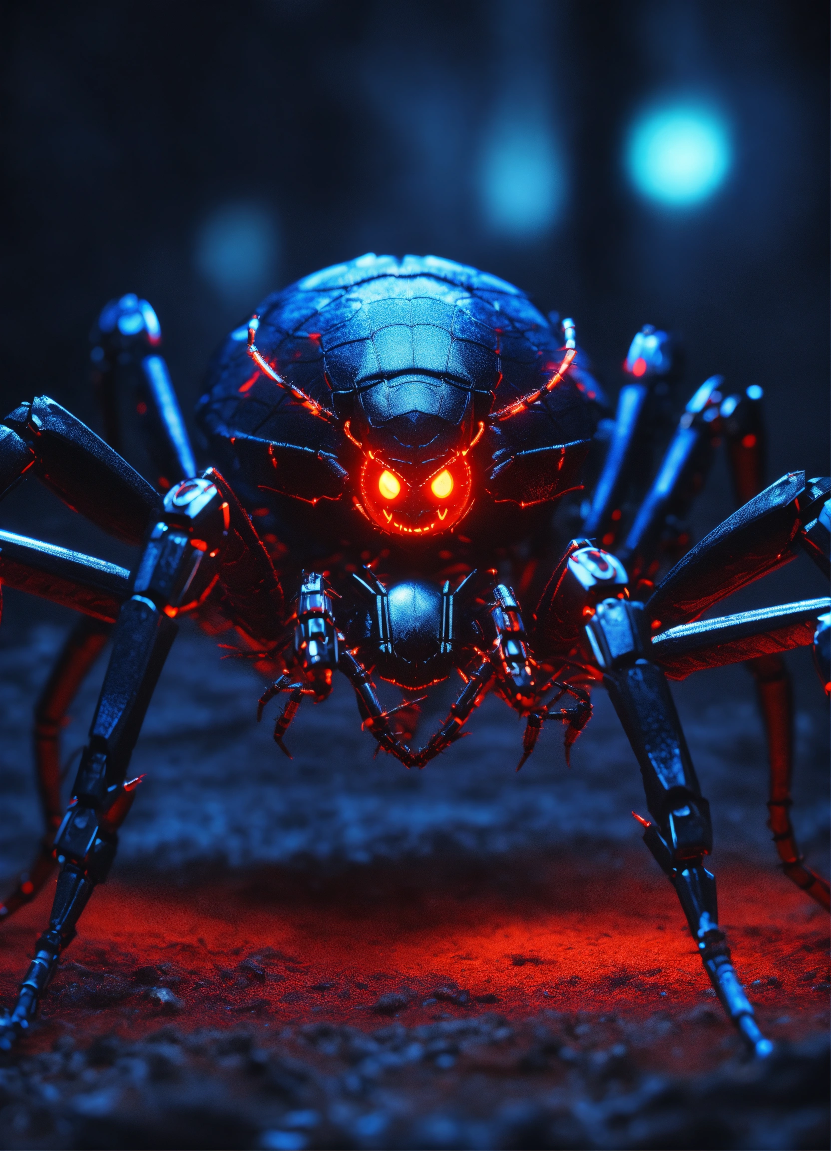 Gigantic black armored robotic spider with red glowing eyes, and long spider fangs, feeding off the energy, the energy glows electric blue, realistic, 8k