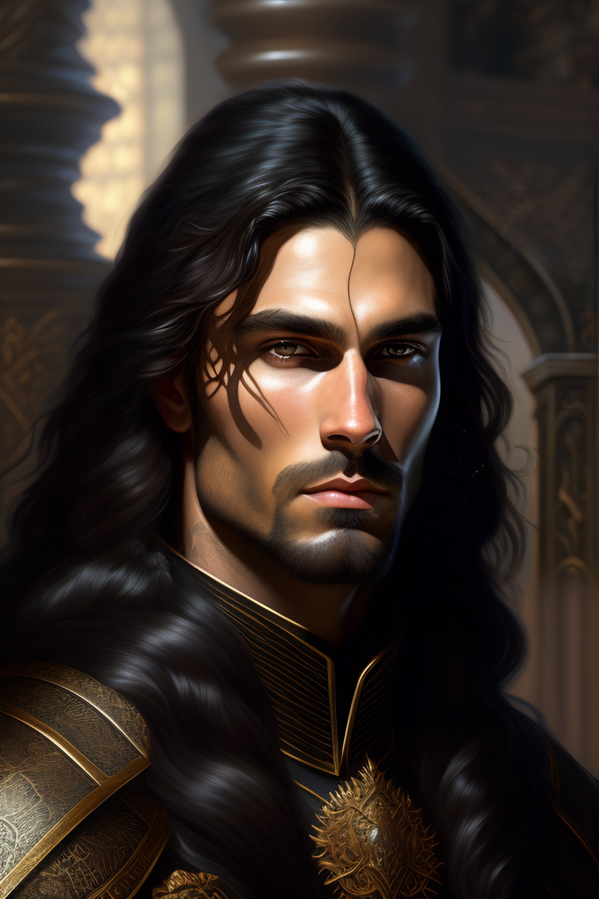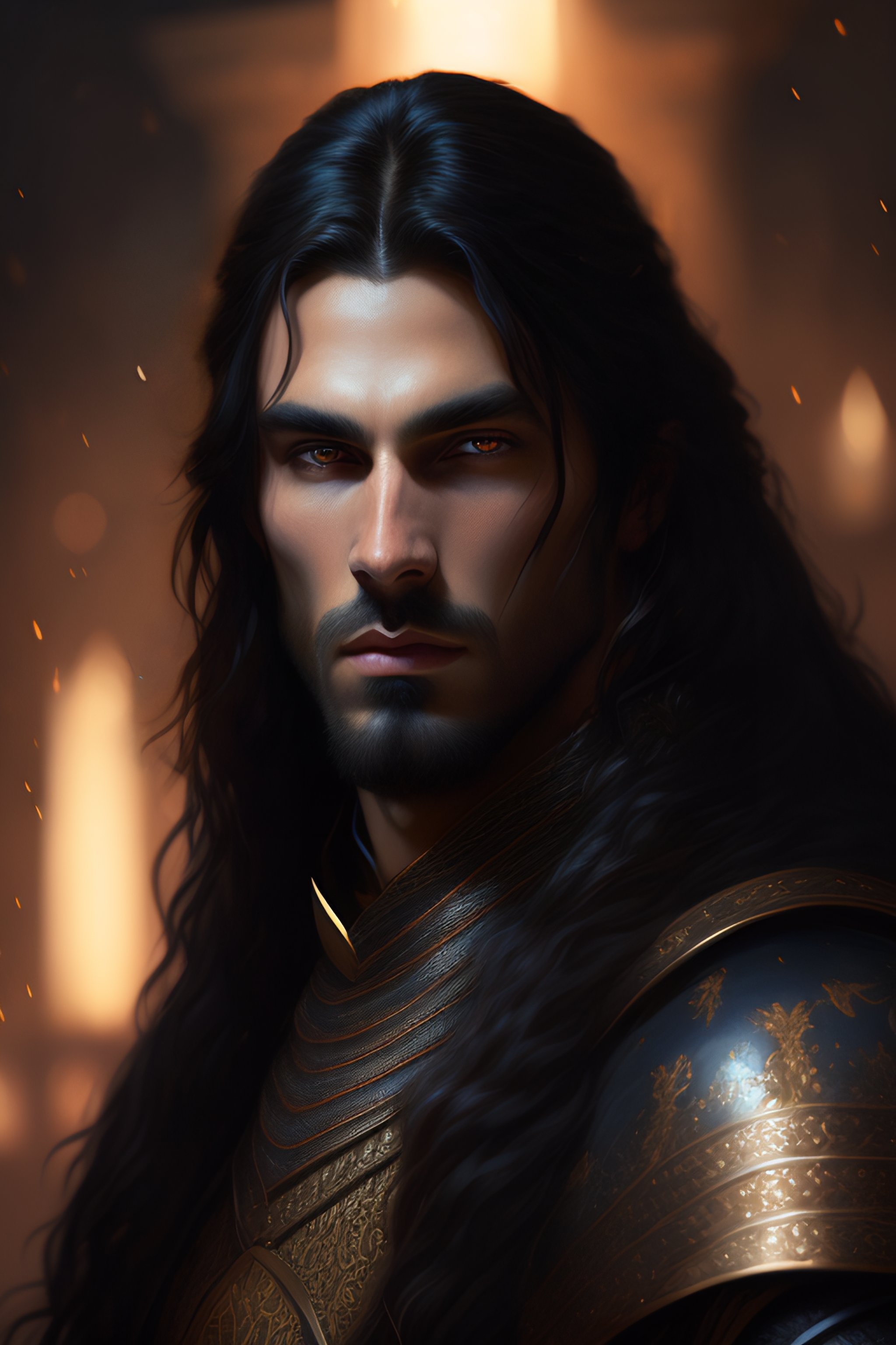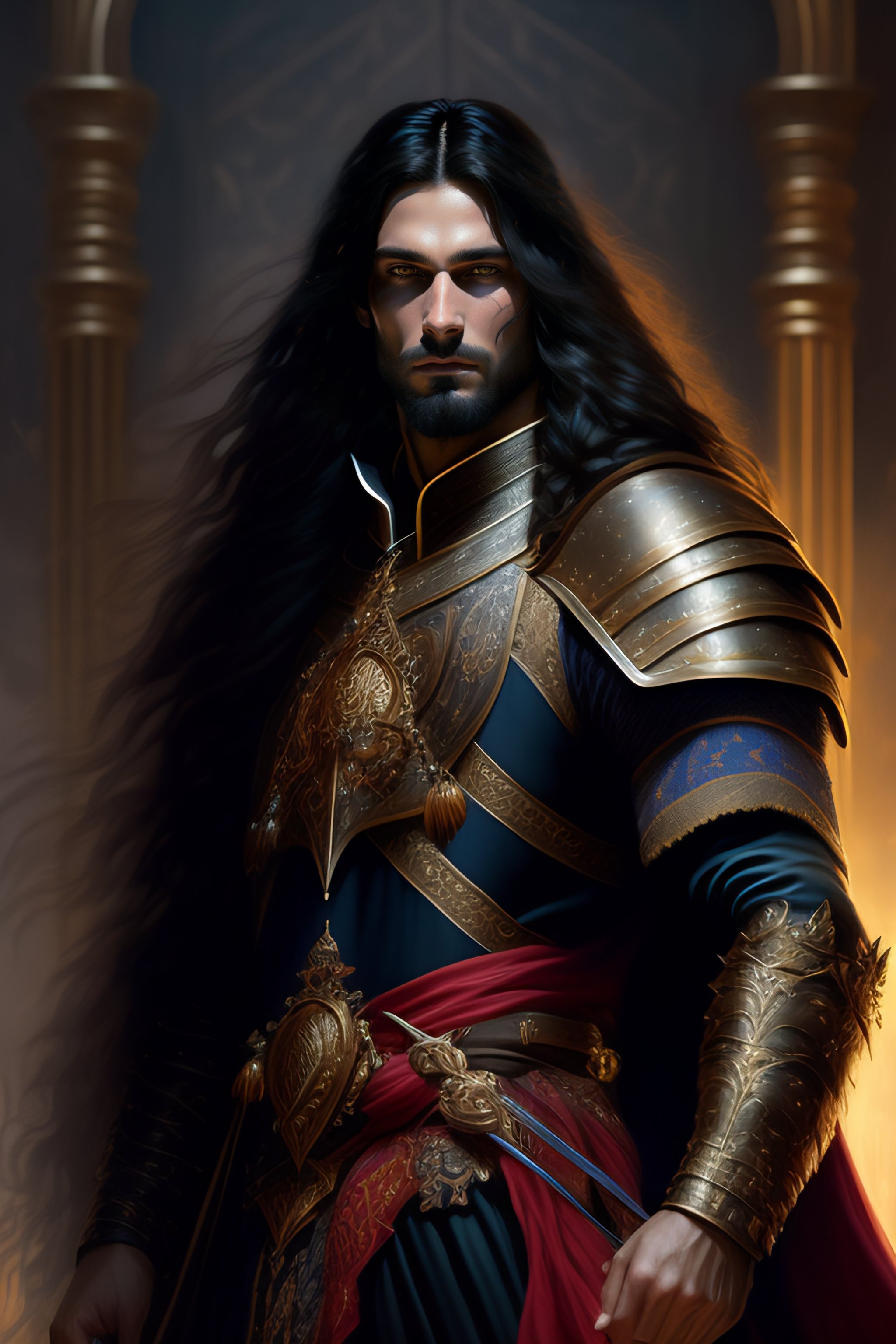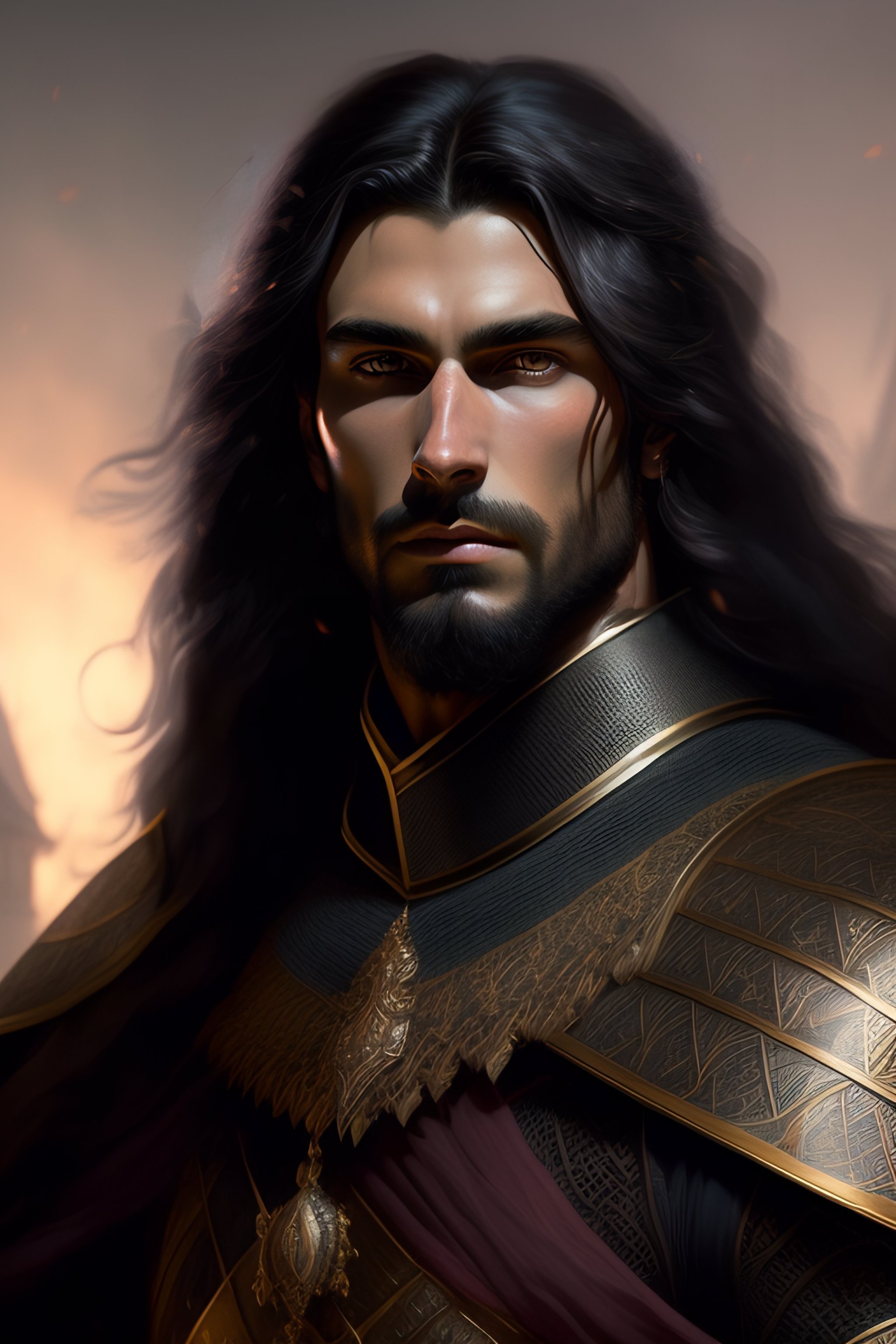 Medieval portrait of a lord man in intricate dark armor with long dark hair sharp features, grim, cold stare, dark colors, volumetric lighting, baroque oil painting in the middle of a battleground by greg rutkowski, artgerm, wlop, alphonse mucha dynamic lighting hyperdetailed intricately detailed