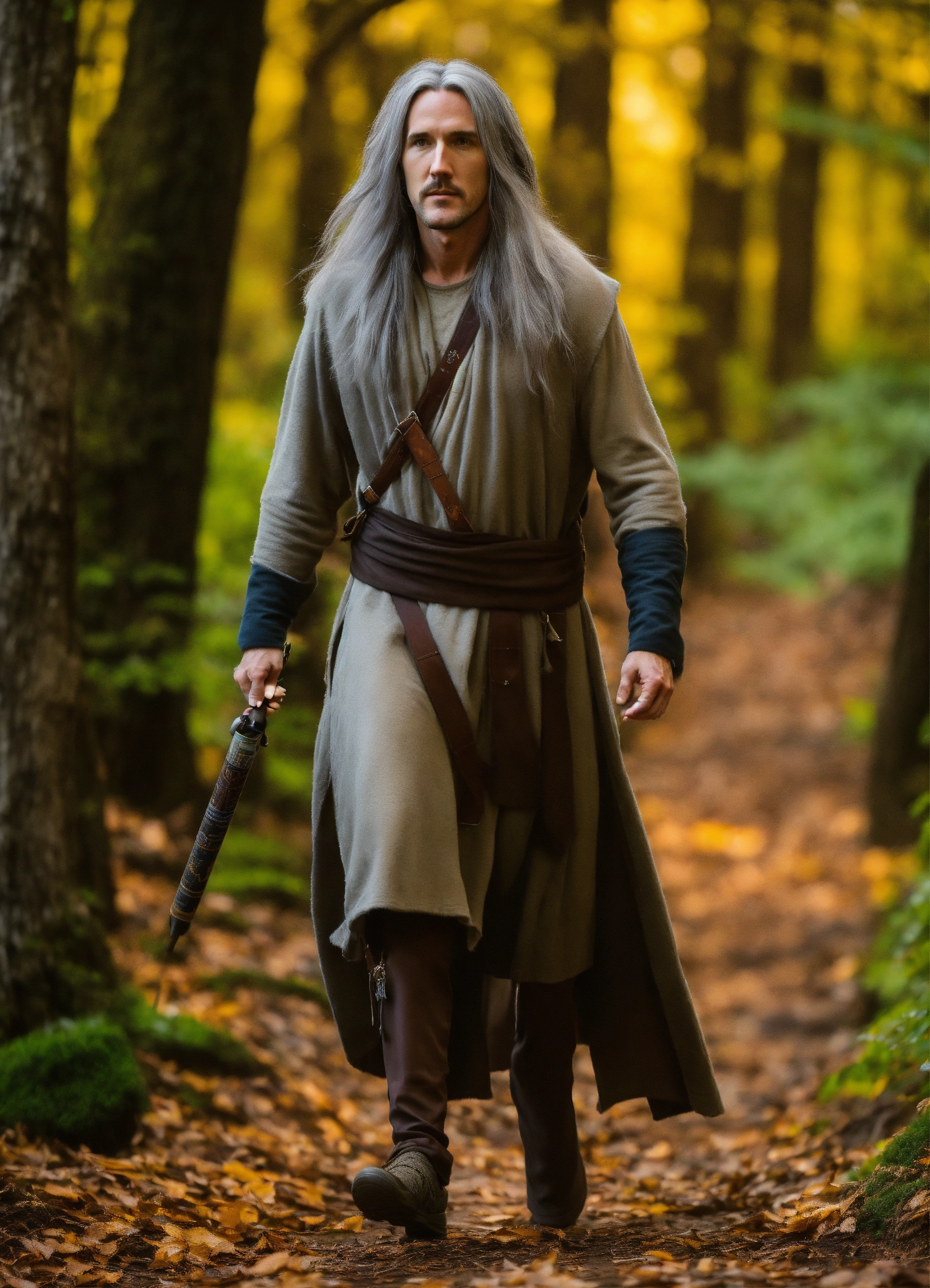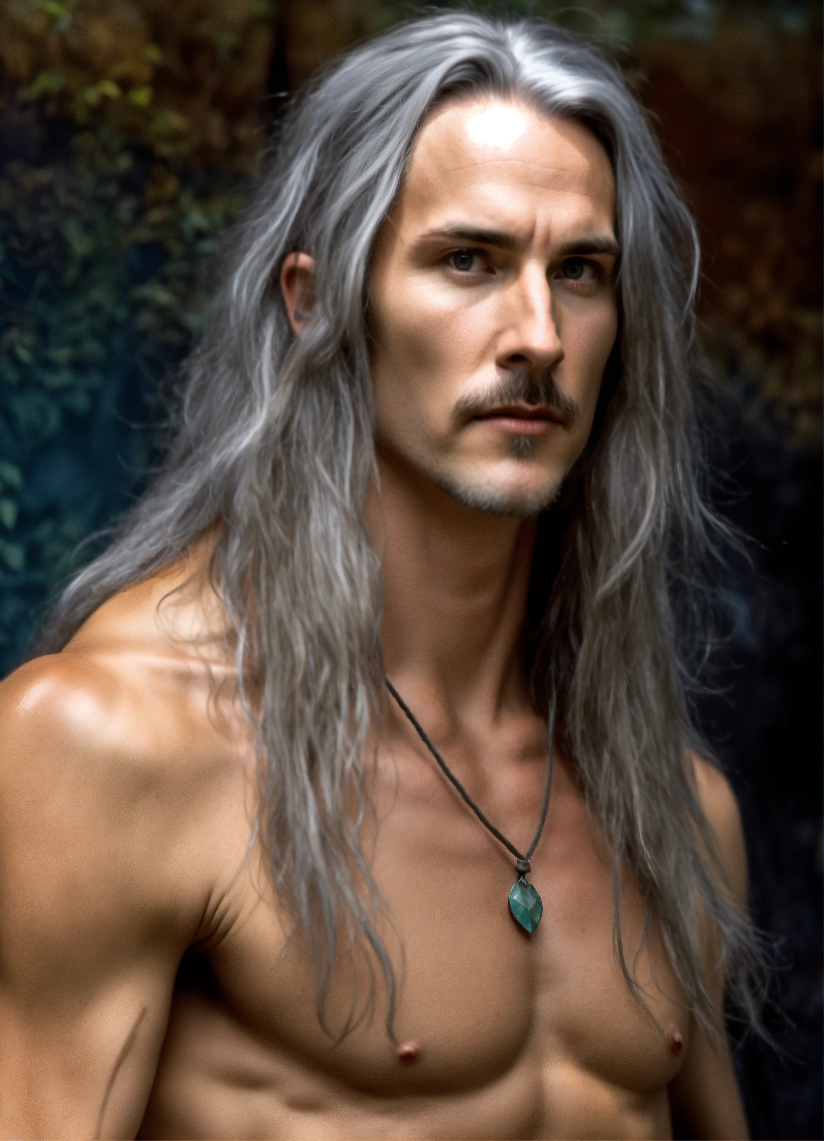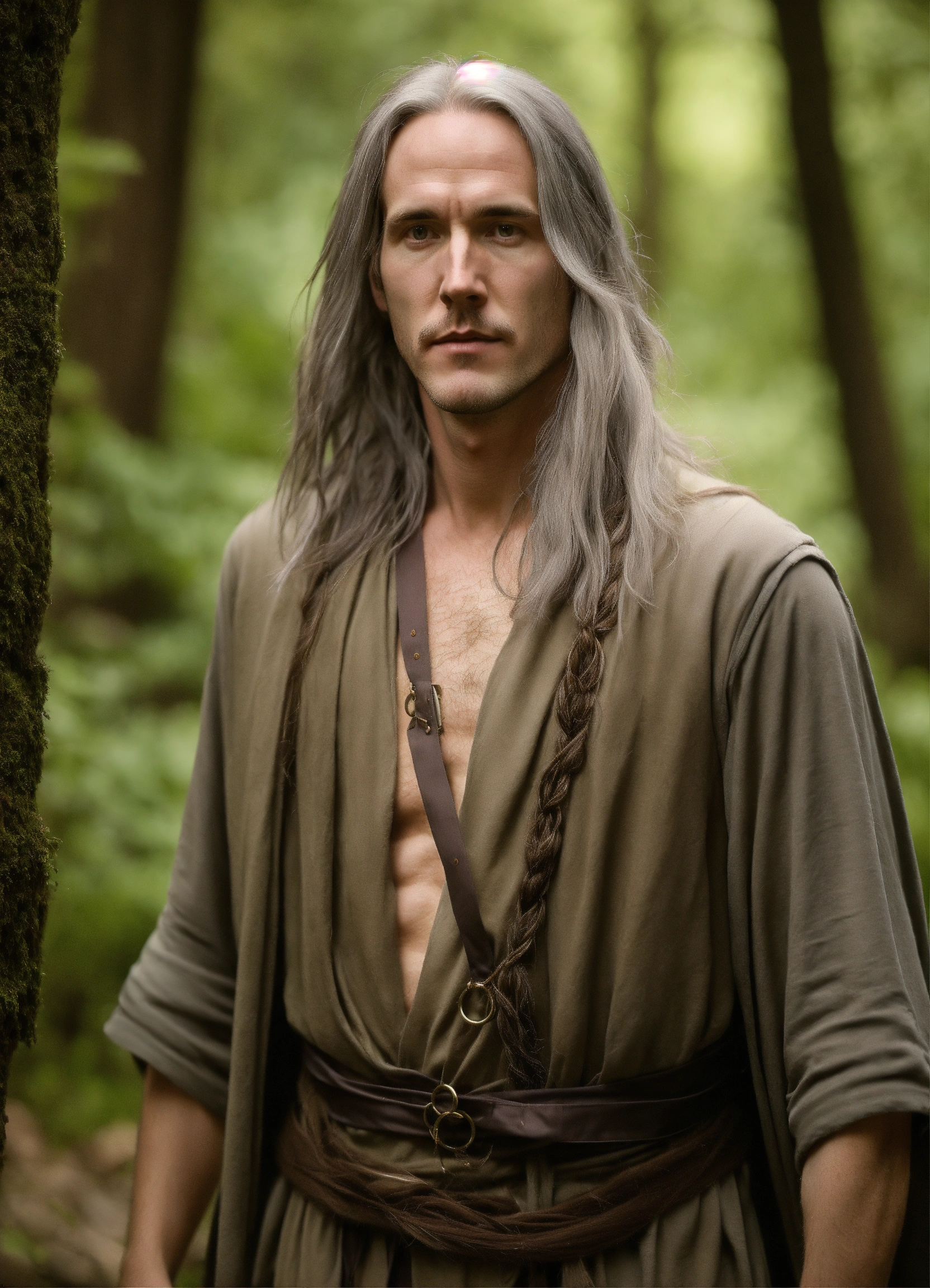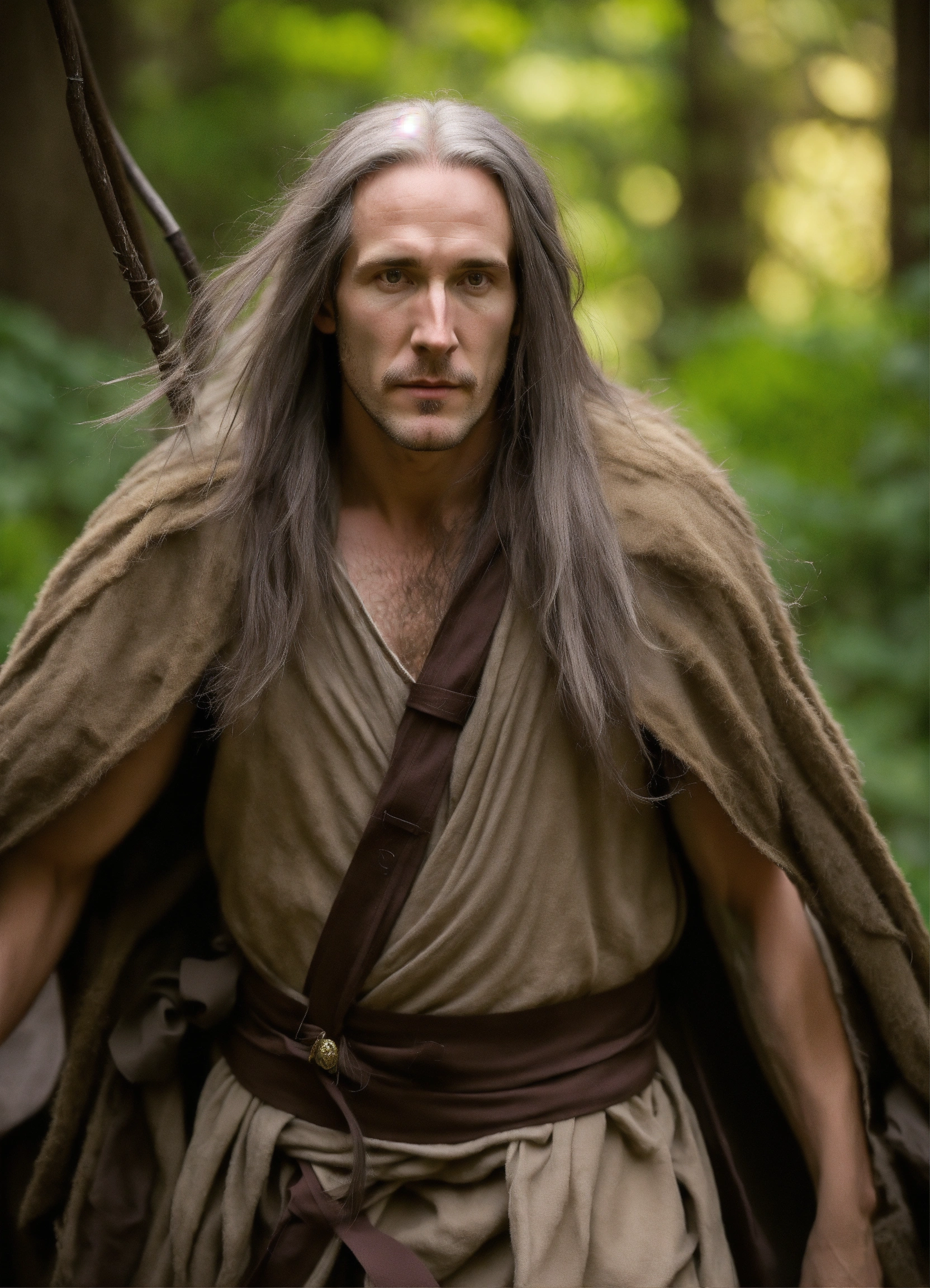 Photo matt mercer as a tall long distance runner with long straight gray hair as a hermit druid, matt mercer is older now but still lithe elegant gaunt features, thin wiry arms, bare hairy chest, matt mercer is 50 years old with graying hair