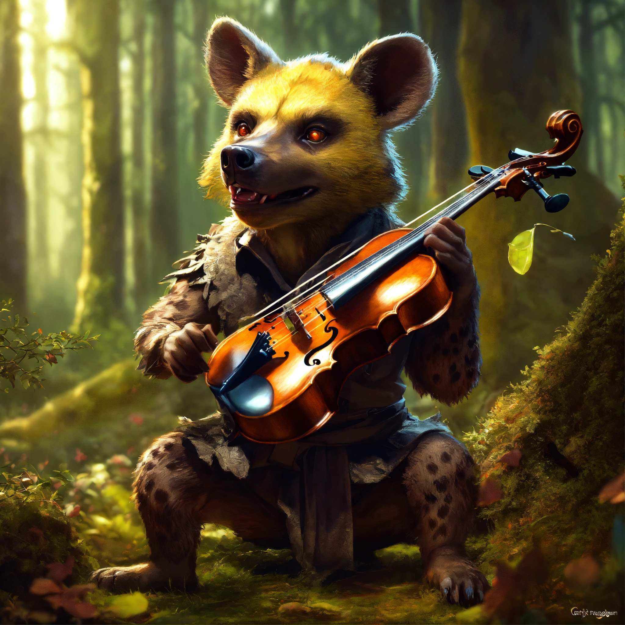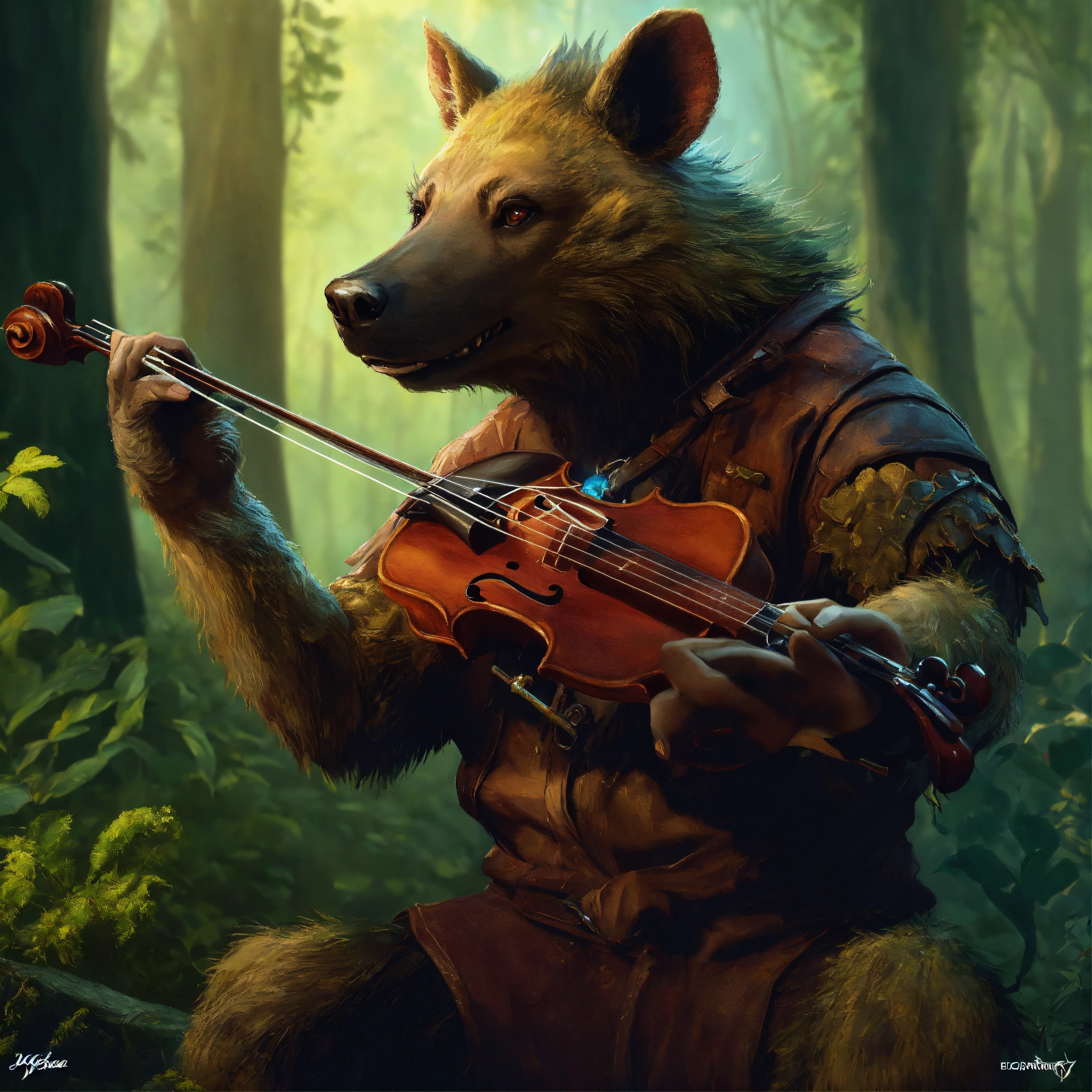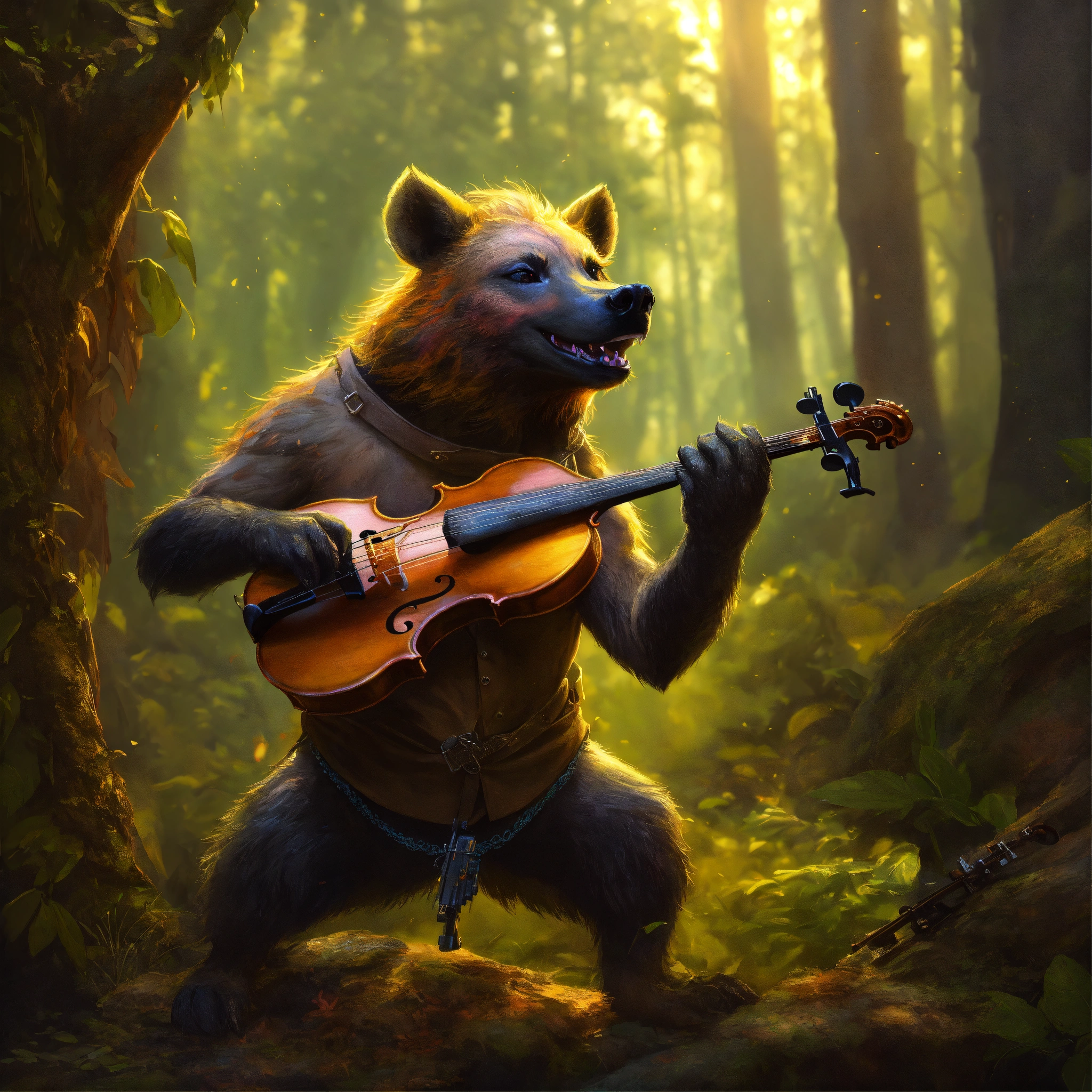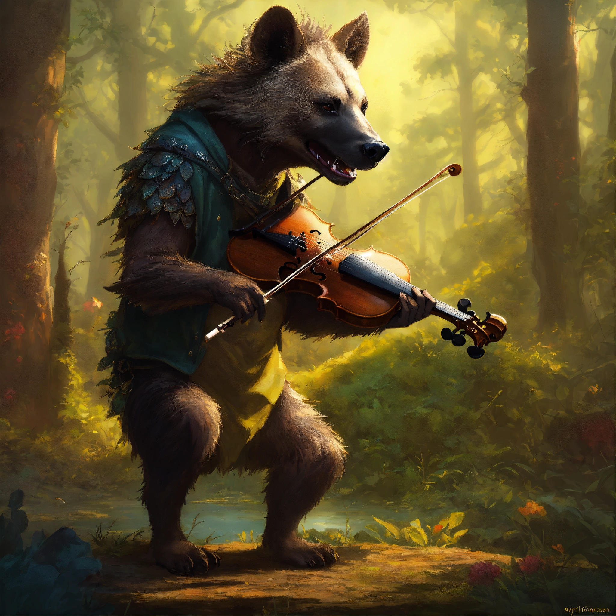 Epic professional digital art of orc hyena bear, playing violin, radiant forest ambient, painted, heroic, mythic, detailed, intricate, leesha hannigan, wayne haag, reyna rochin, ignacio fernandez rios, mark ryden, van herpen, best on artstation, cgsociety, epic, stunning, gorgeous, realistic, much wow, cinematic