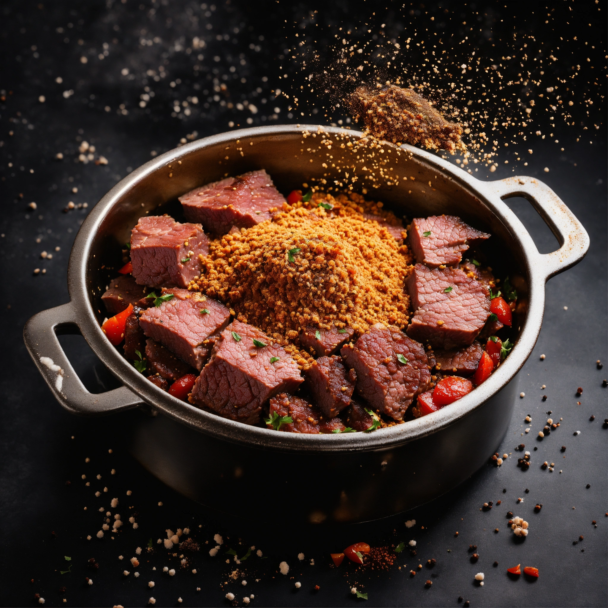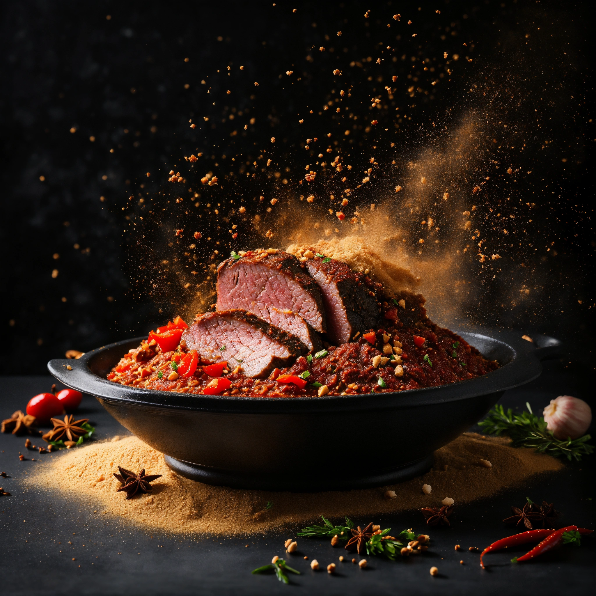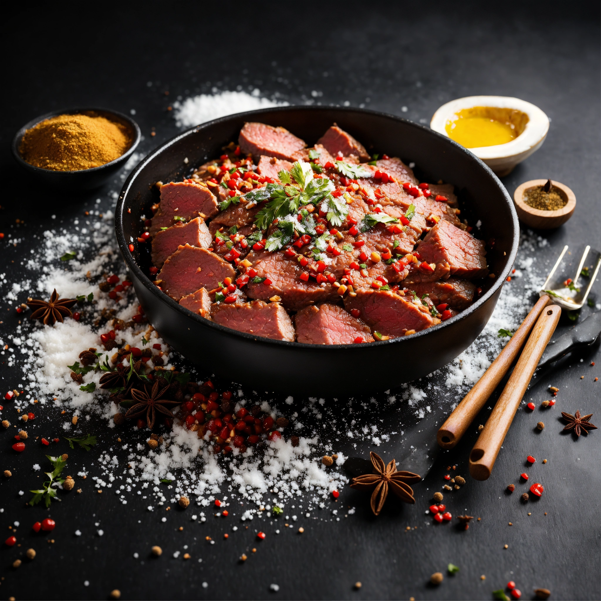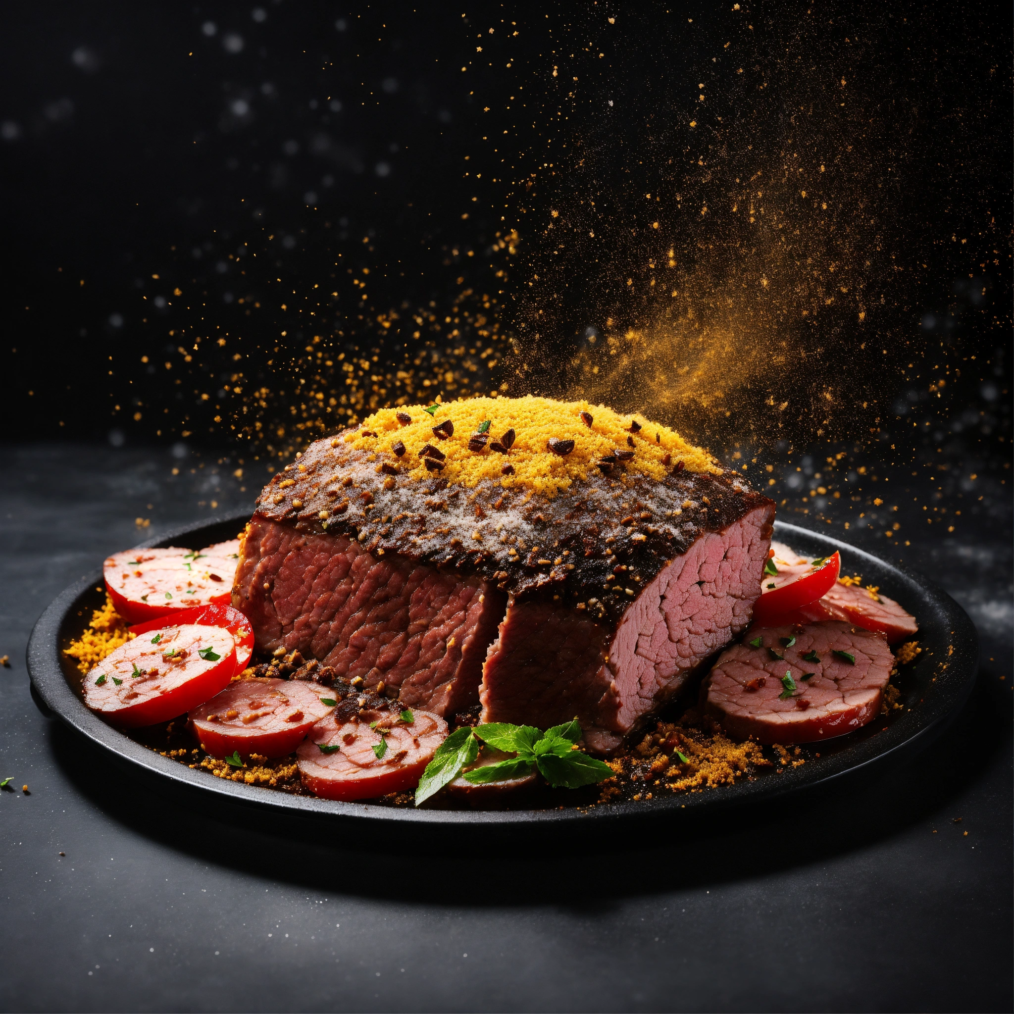 A delicious meat dish that is sprinkled with a little spices and they fall on top of it like snow, black background, a lot of empty space around