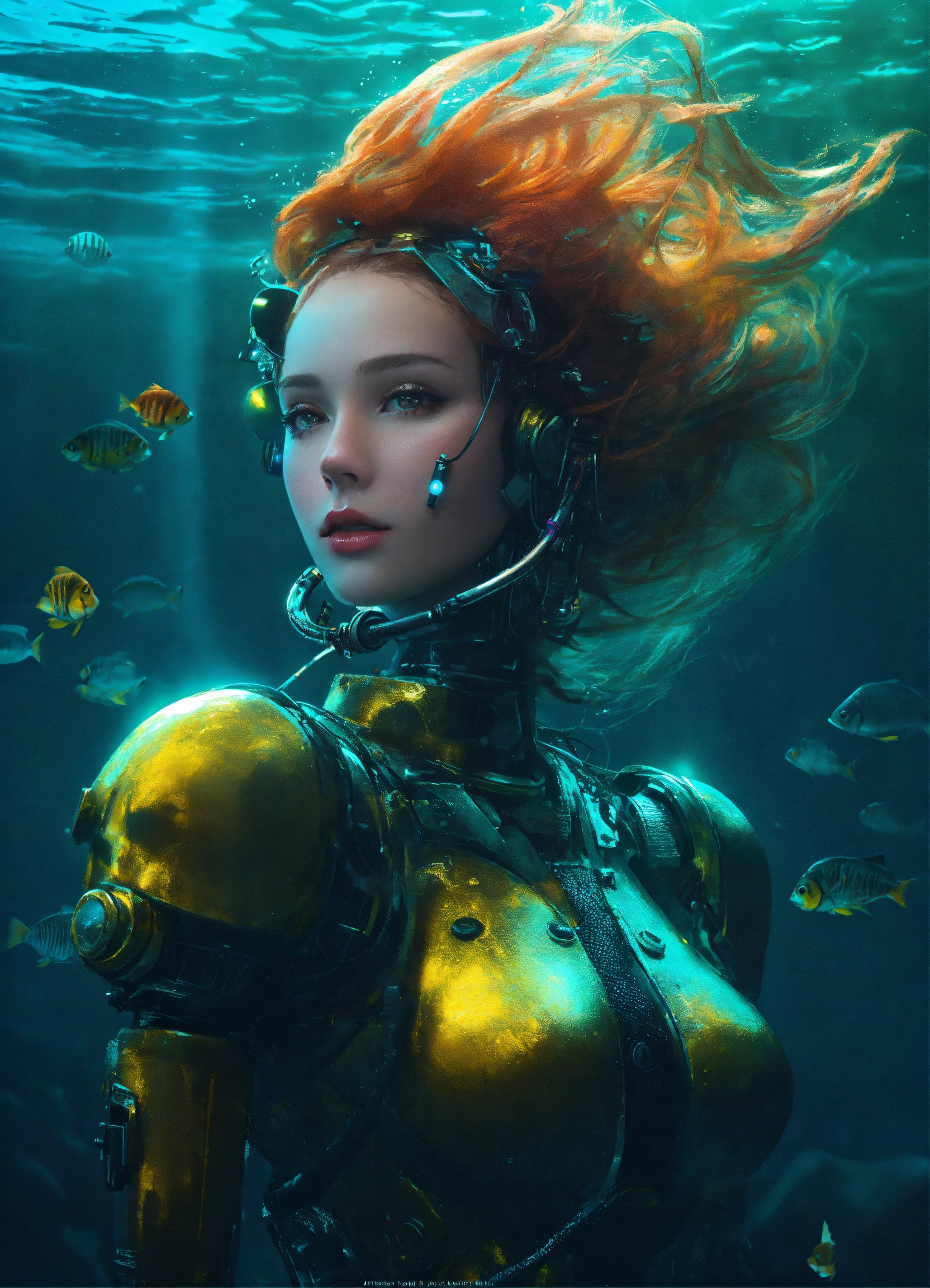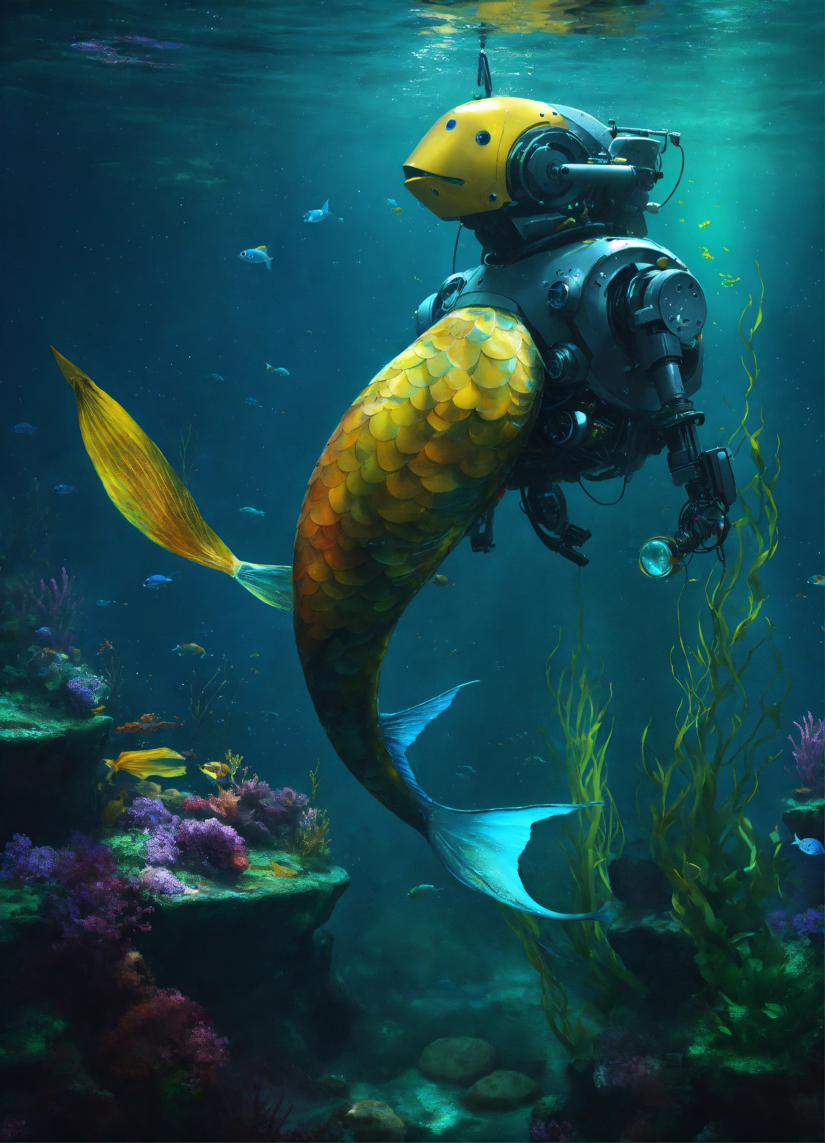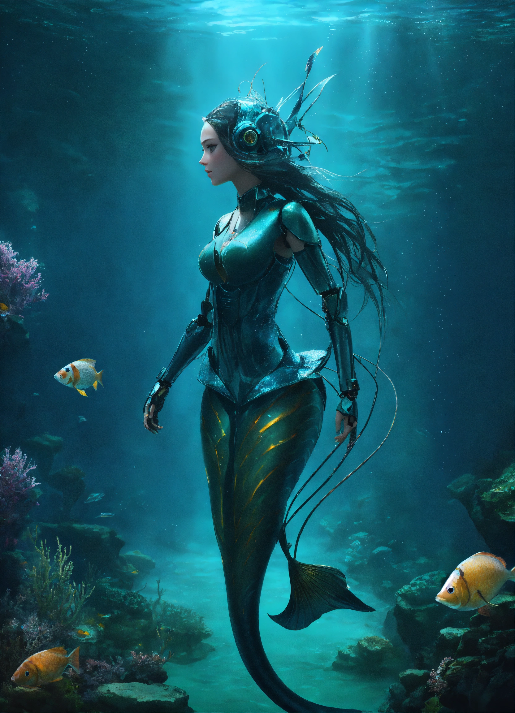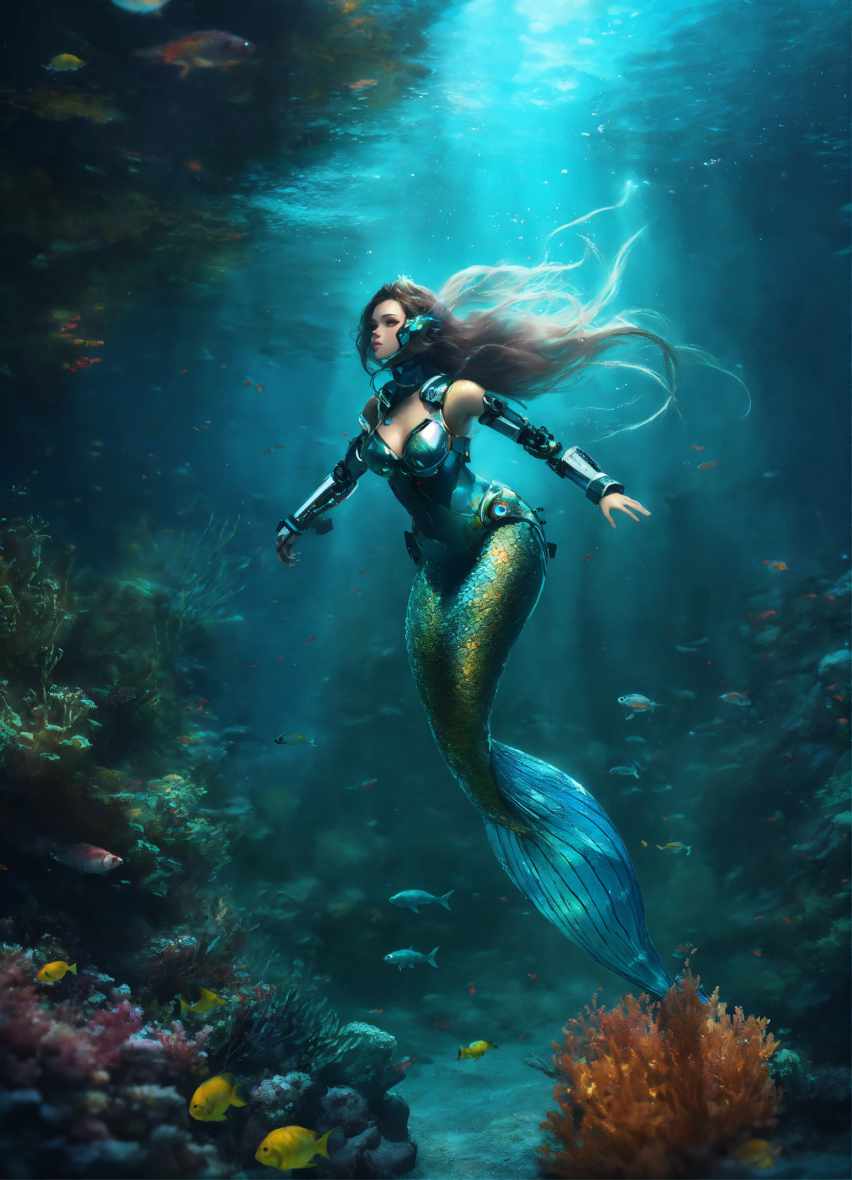 A robot mermaid, in the bottom of the sea, dark light, whit a robotic fishtail, trending in artstation, digital paint hyperrealist photo--s 750