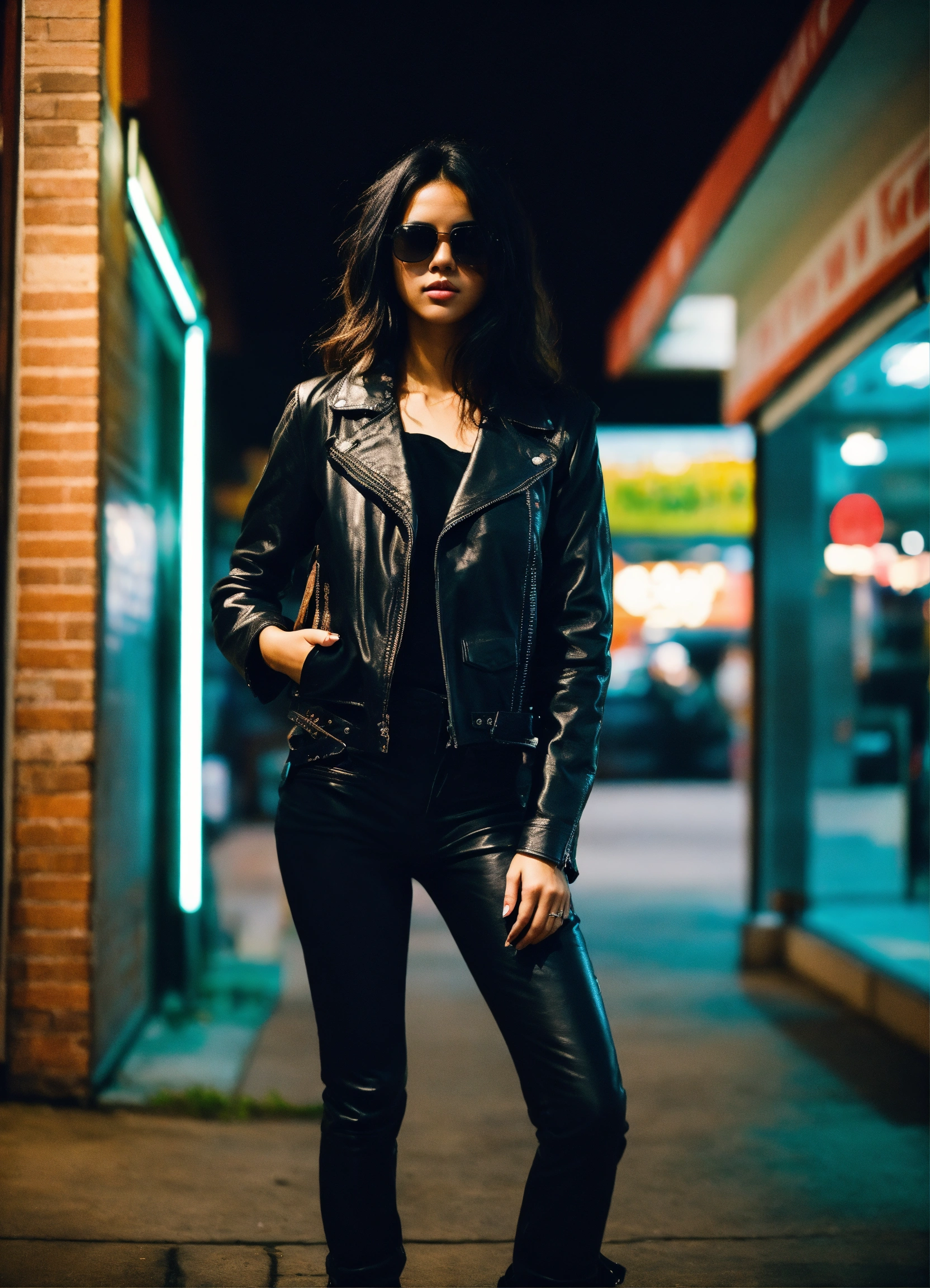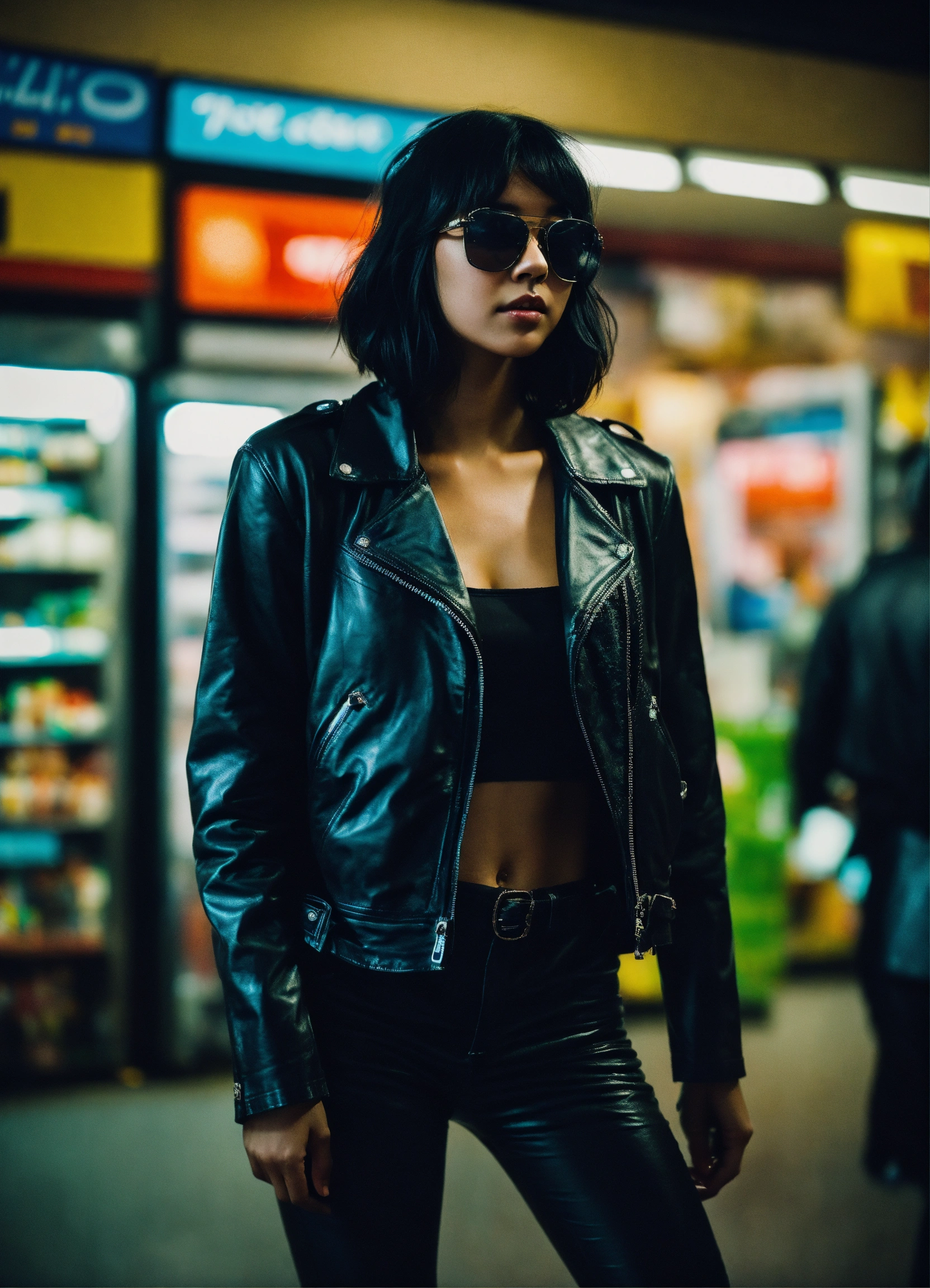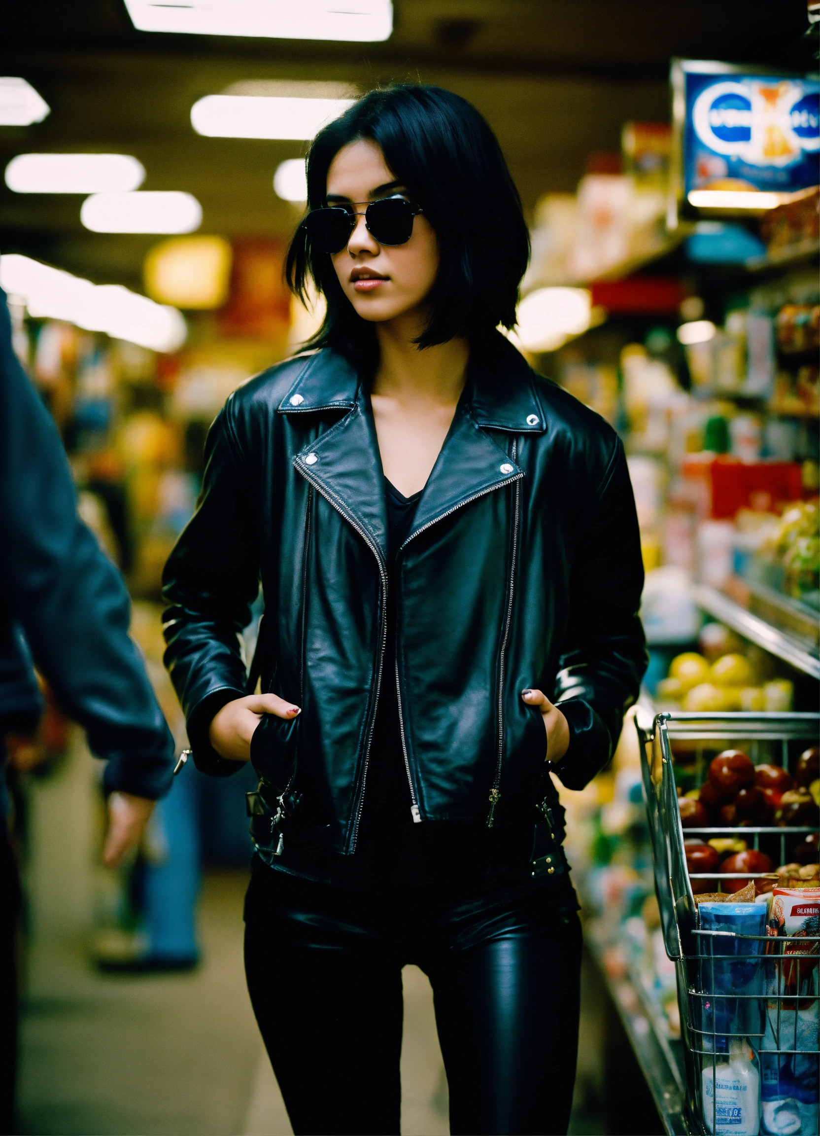 Candid photo of a young black-haired woman, wearing a black leather jacket and pants, taken at a convenience store during the night, low quality image, exhibiting a grainy texture, jpg artifacts, film grain, gritty, raw aesthetic sunglasses