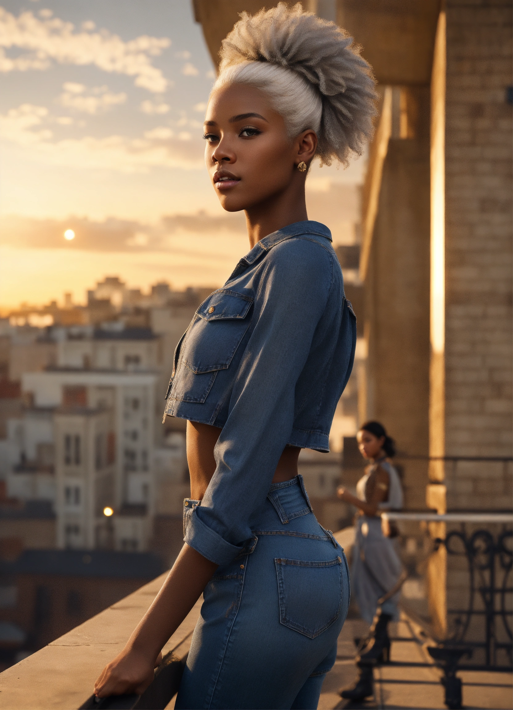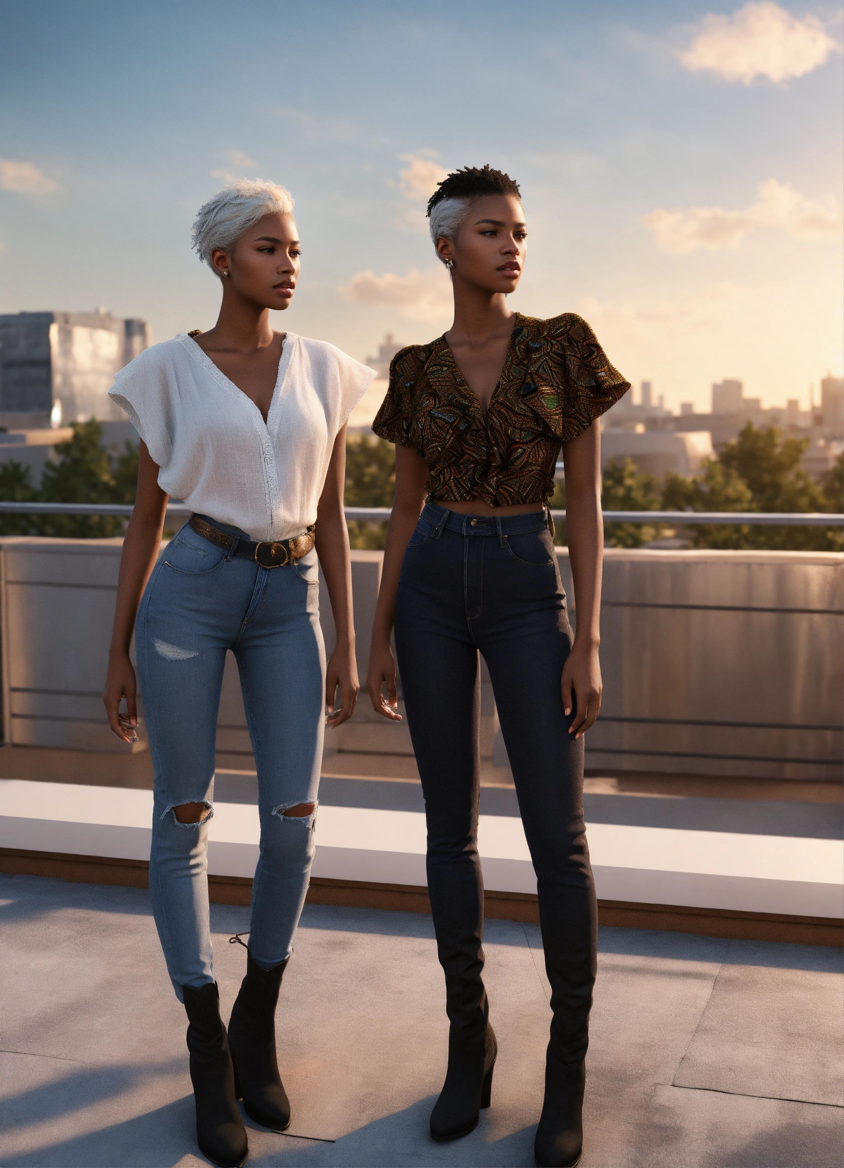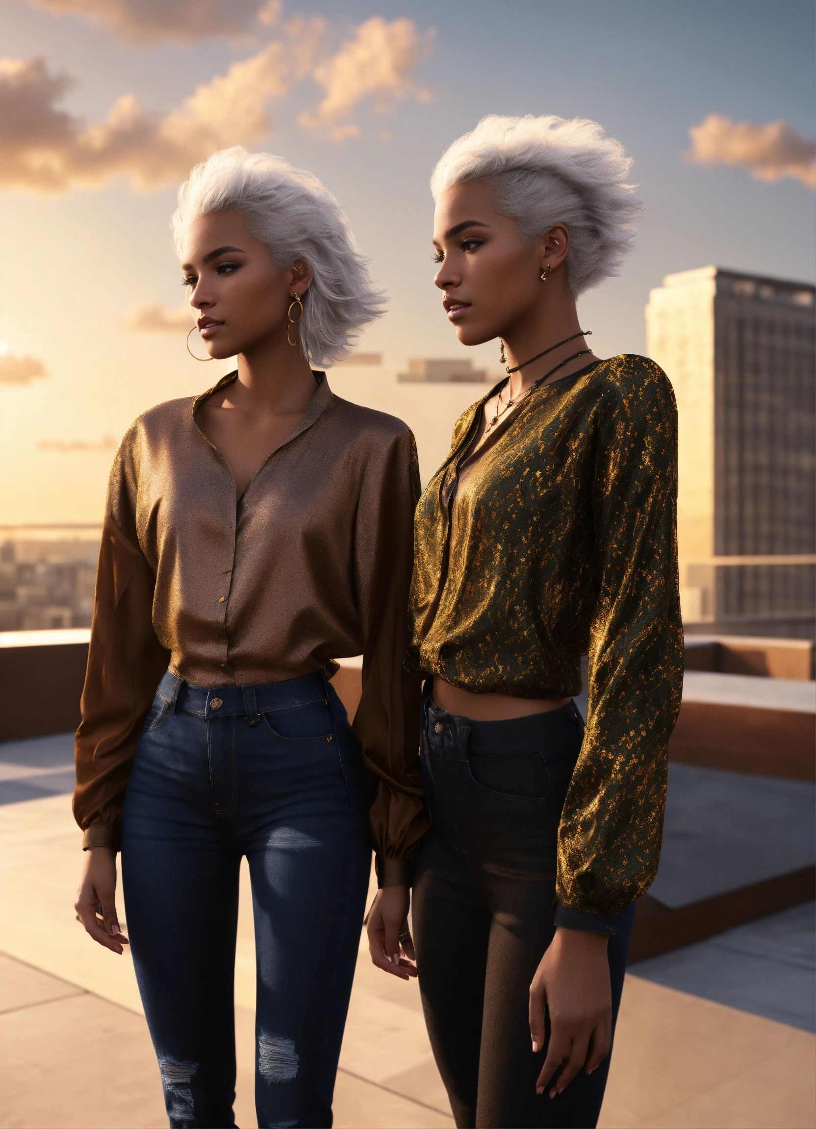 Pretty fraternal twins, twin 15-year-old, one twin white hair. african features, one twin brown-skin, black hair, in haute couture blouse, jeans, and boots. standing on rooftop terrace, regal persona. early morning, cinematic style, high detail, realistic physics, photorealistic, unreal engine, hdr, 8k