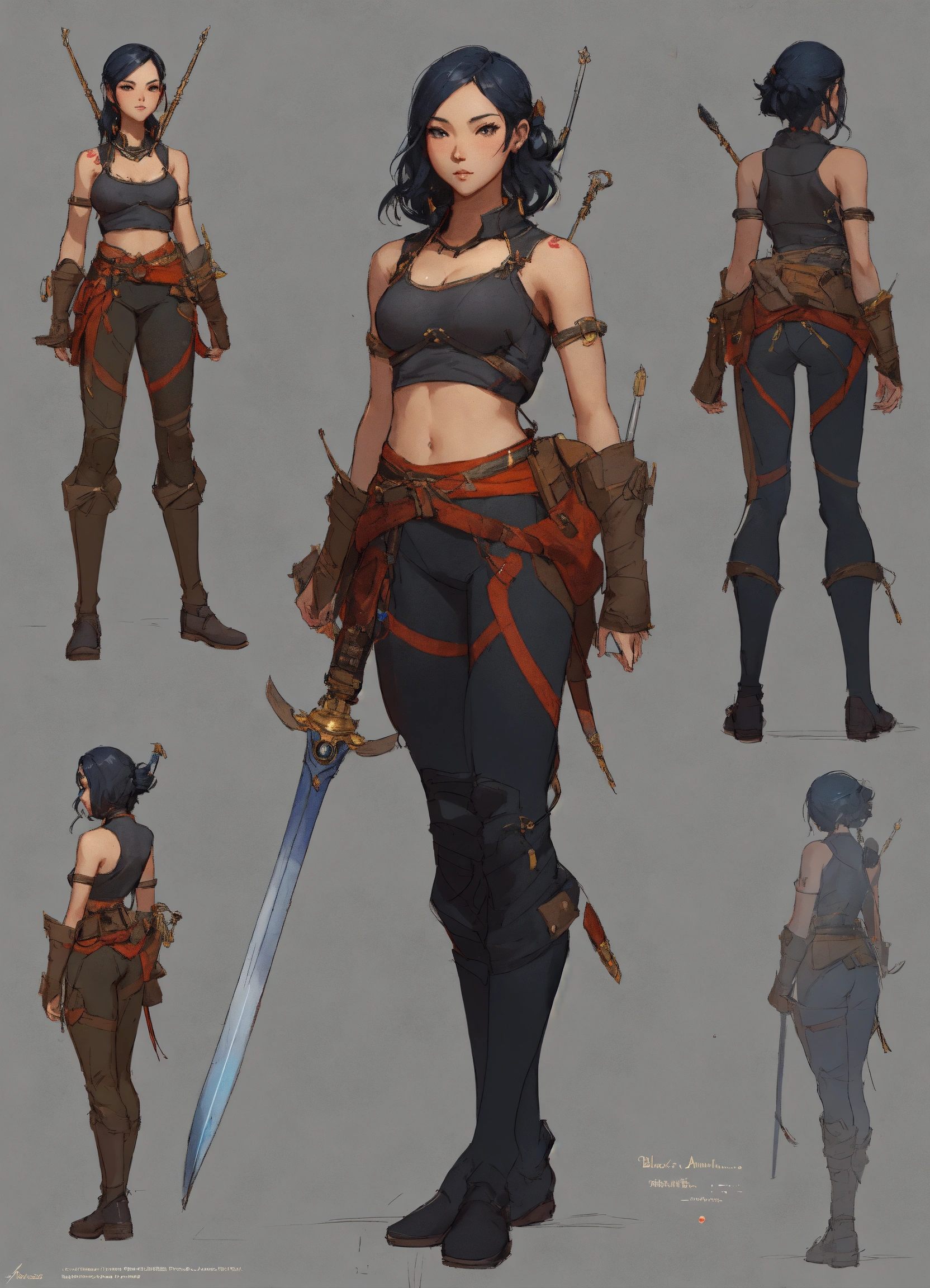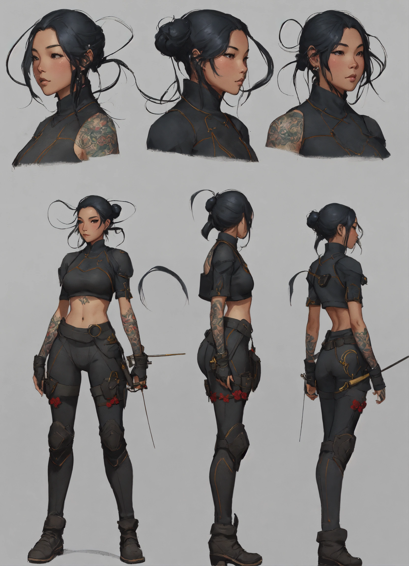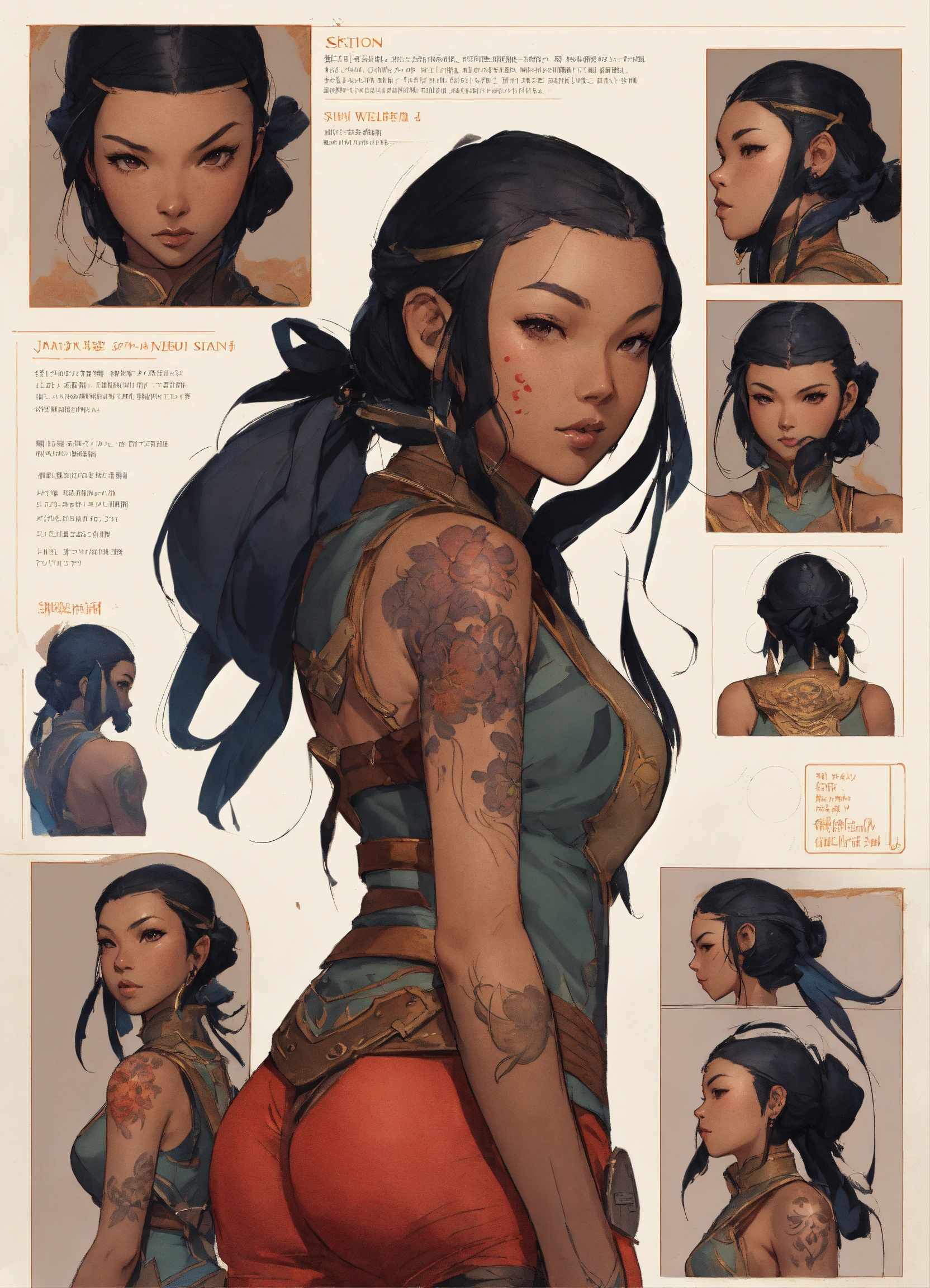 Black back tattoed woman warrior, character sheet, character design, chart, reference sheet, multiple views, high detail, fine details, concept art, rossdraws, james jean, sakimichan, moebius, stanley artgerm lau, jayison devadas, phuoc quan, studio ghibli