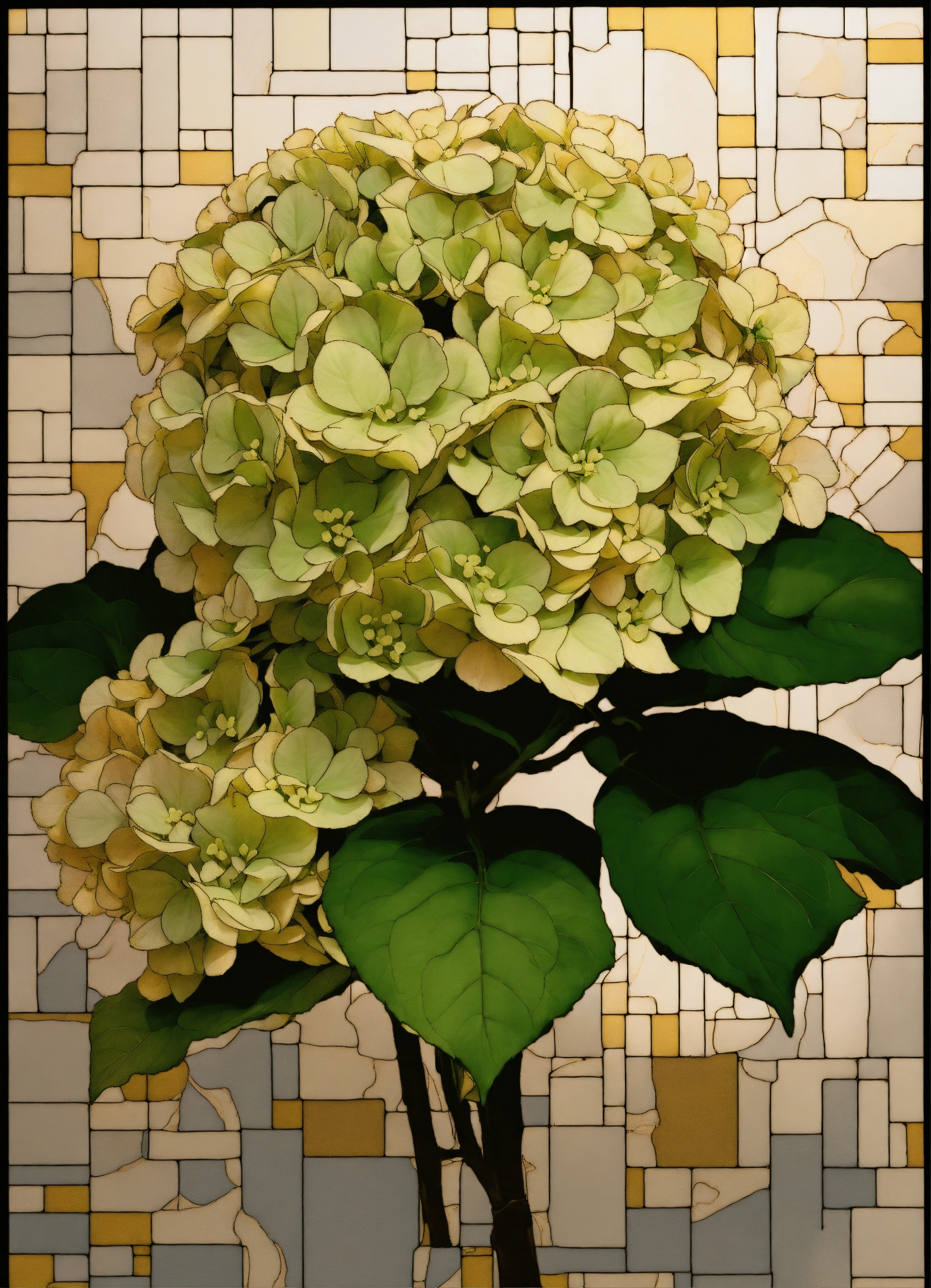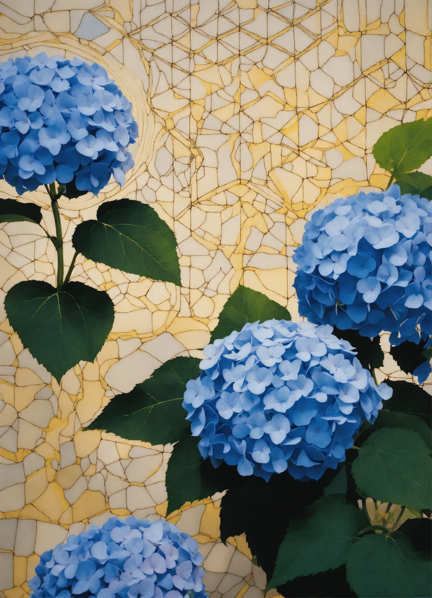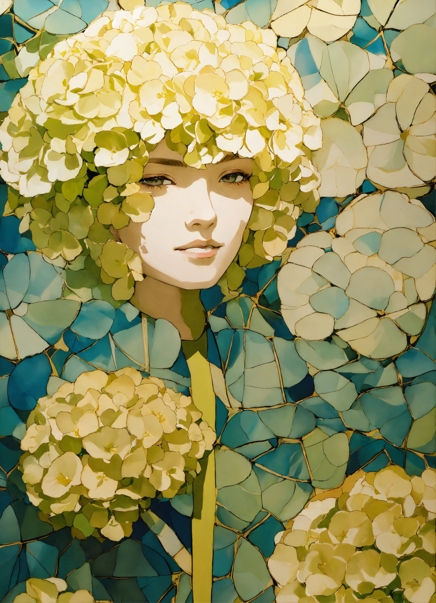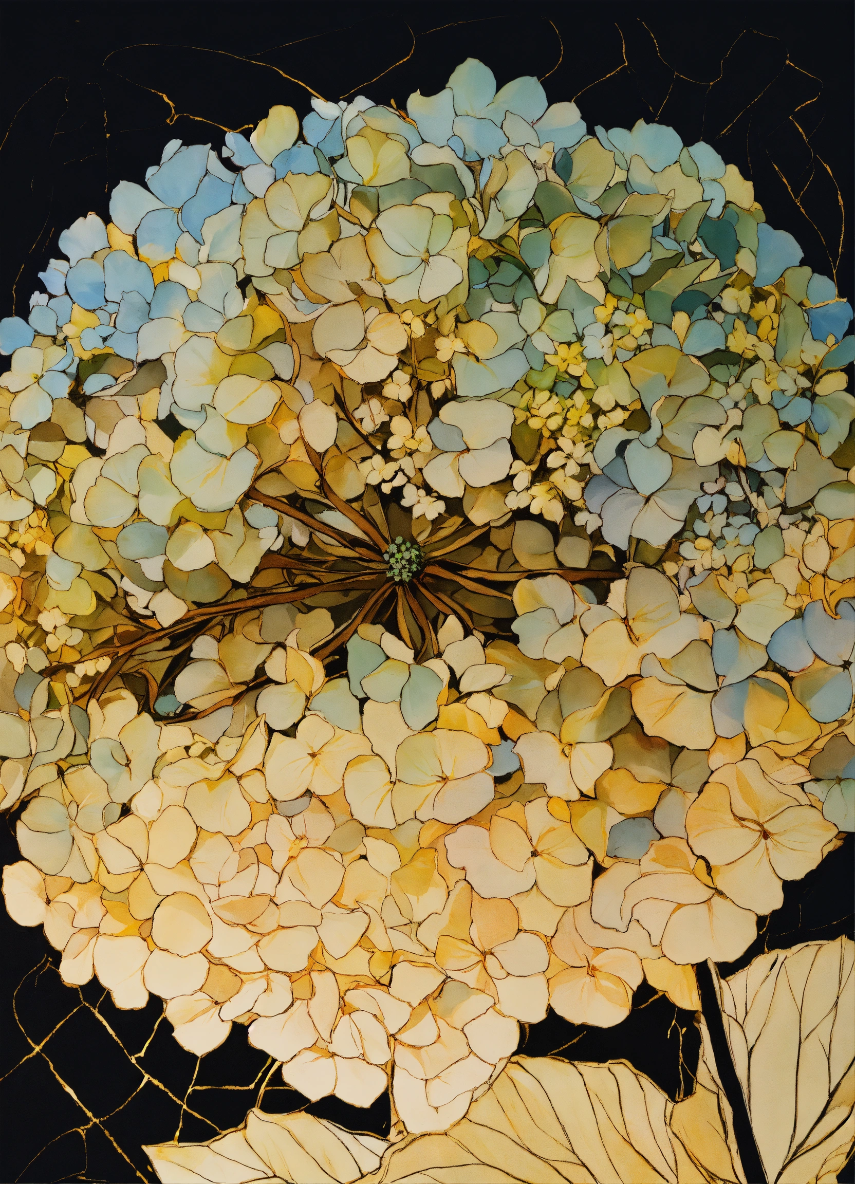 A portrait. a hydrangea with flowers swirling into the landscape. illuminated from behind. tessellation, fibonacci sequence, yoji shinkawa, kintsugi, comic book, heavy outline