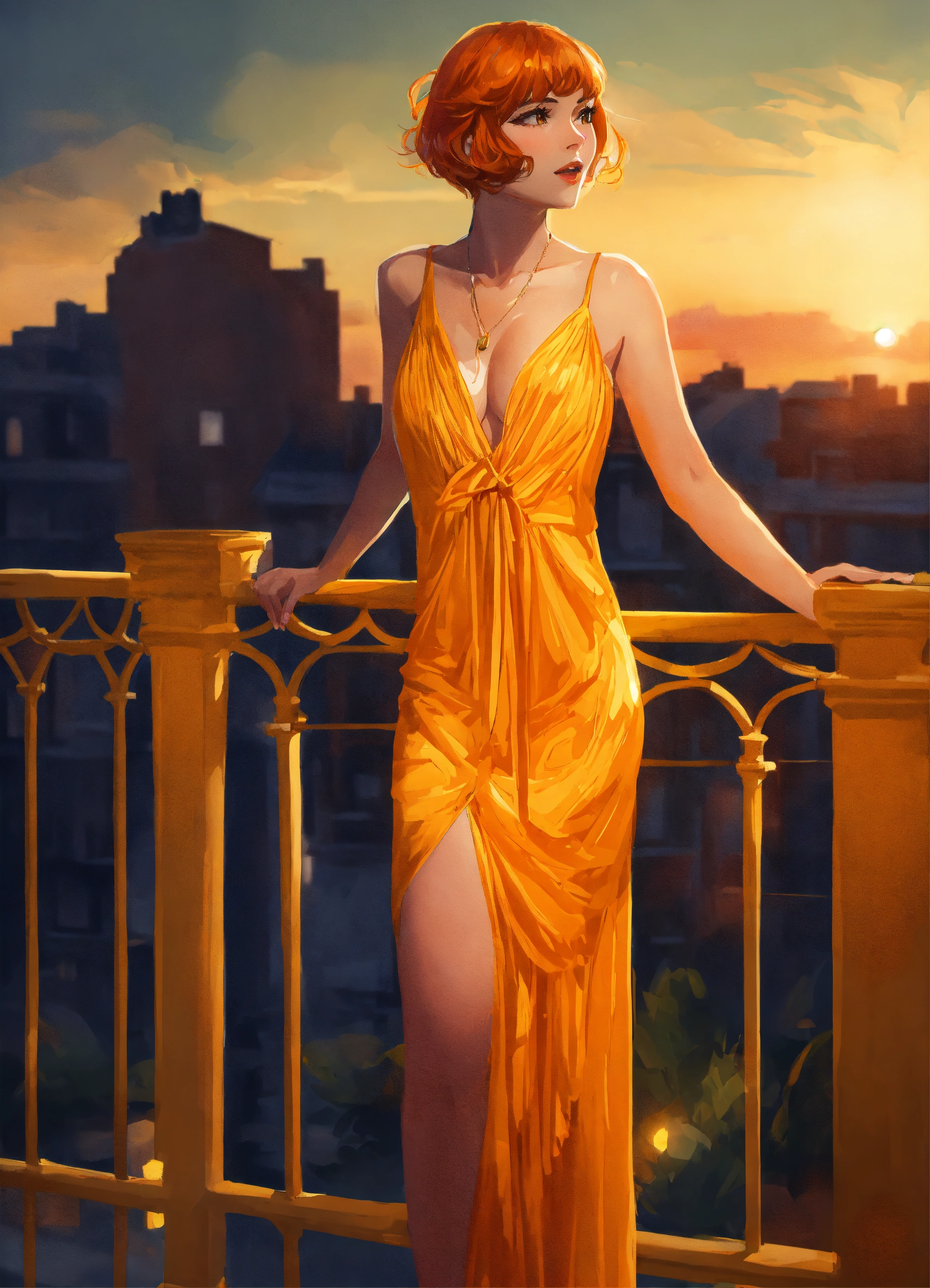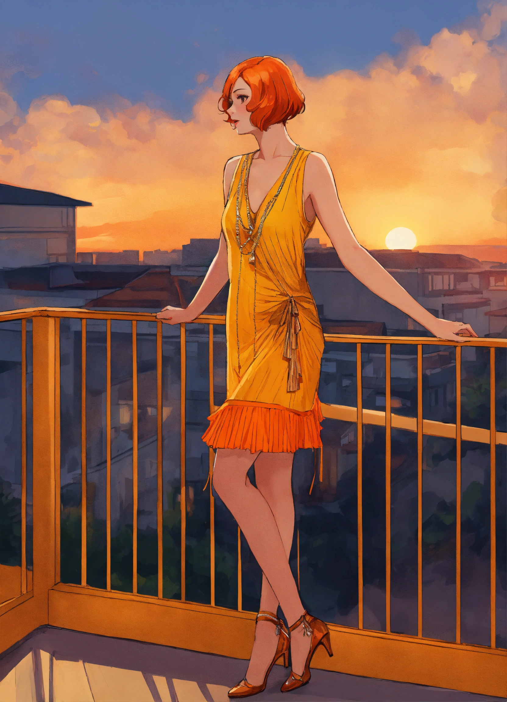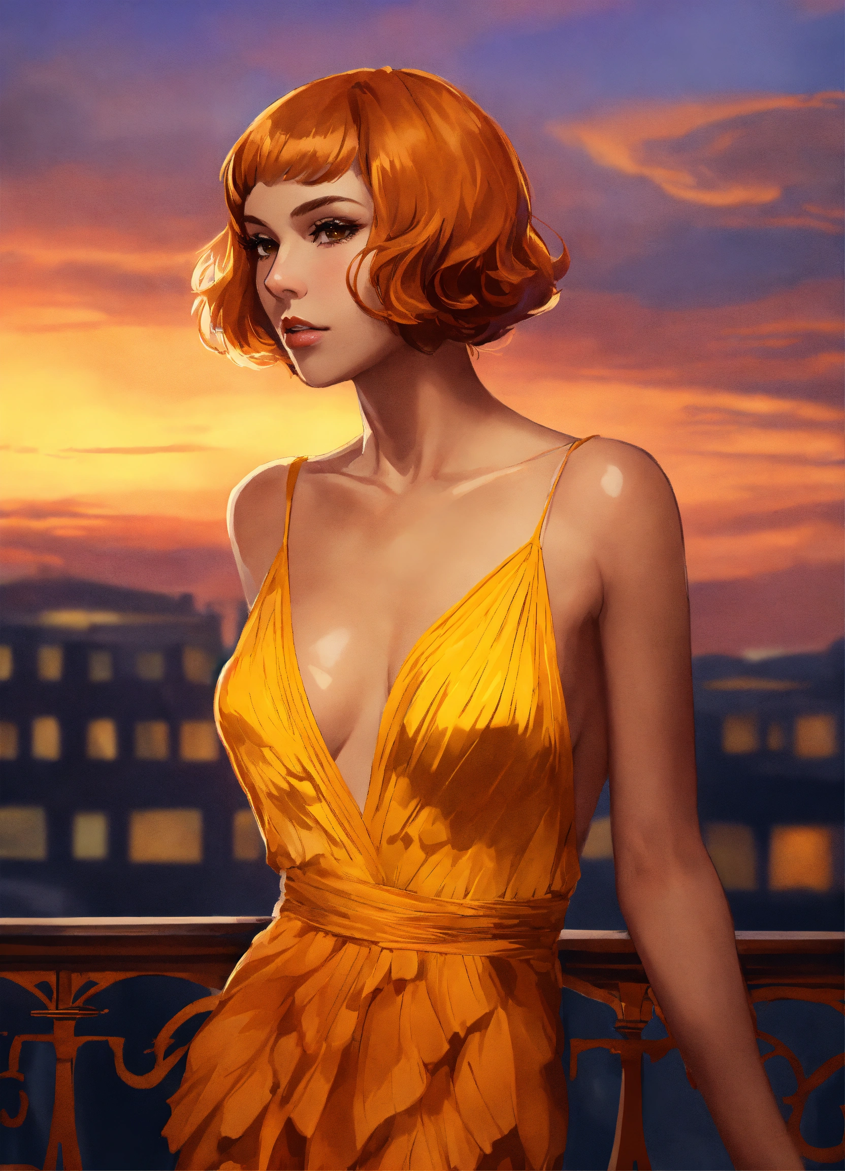 Digital art portrait of a woman in a yellow-orange flapper dress with a deep, plunging neckline and short ginger hair, standing on a balcony at sunset.