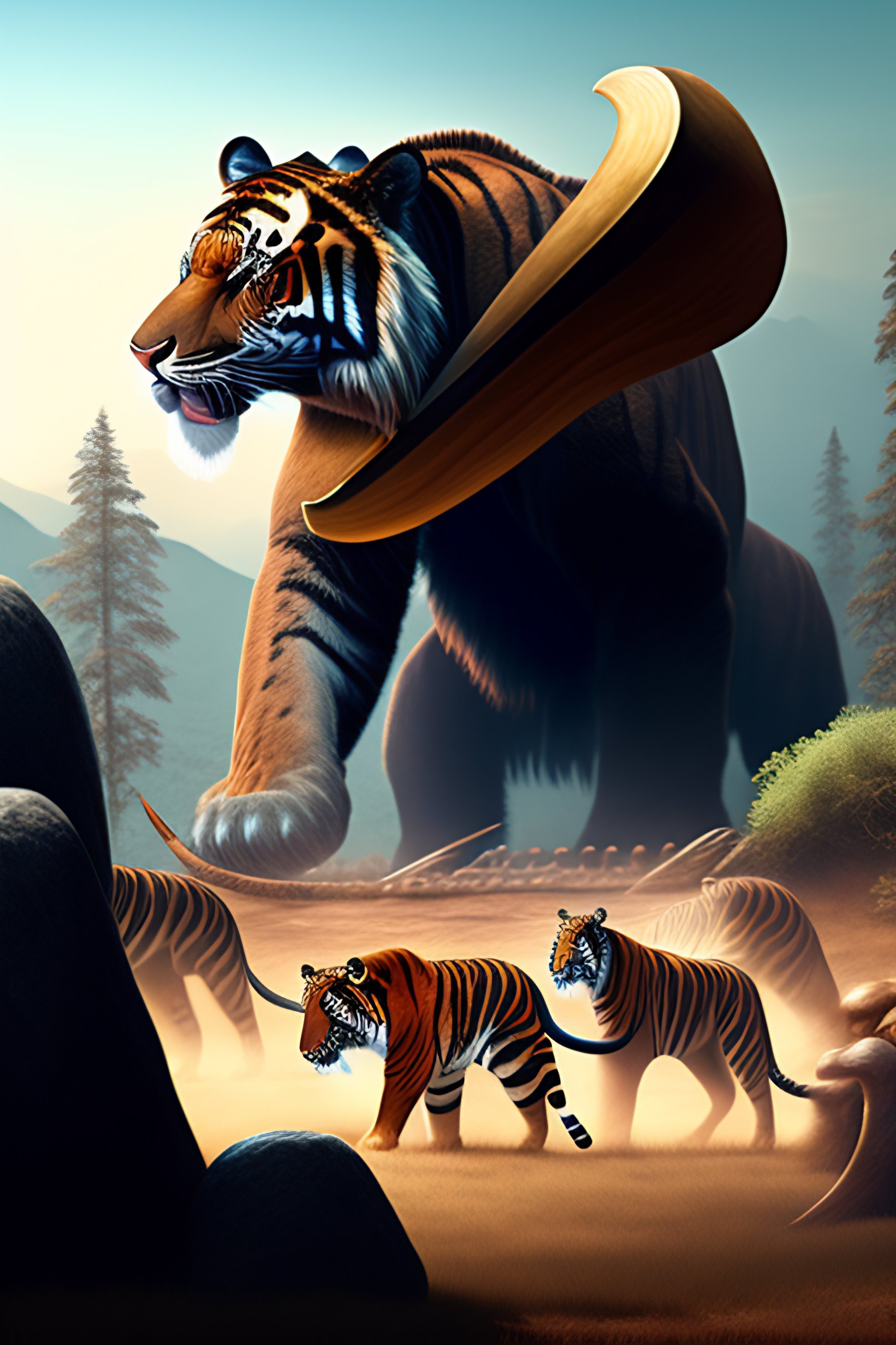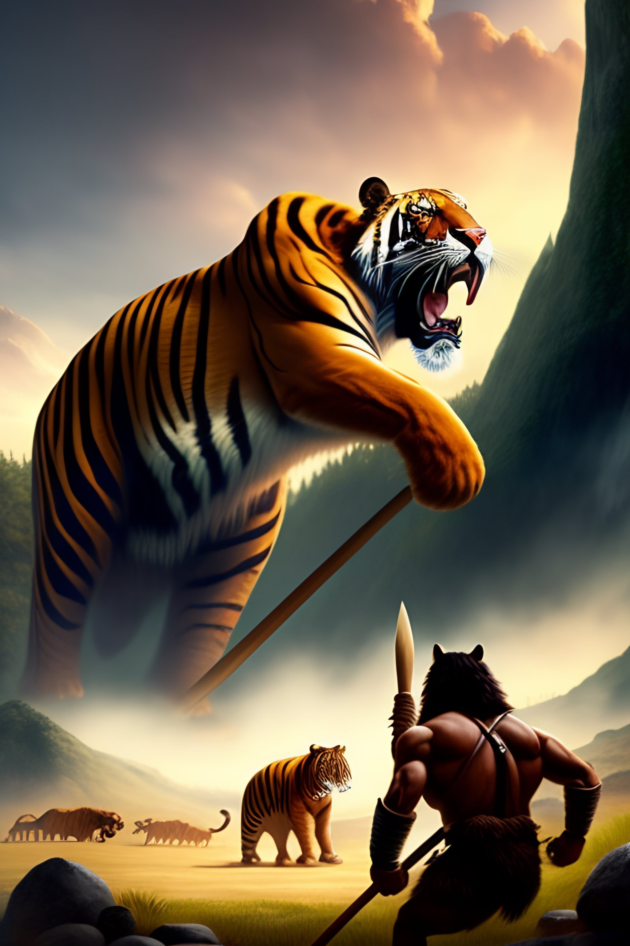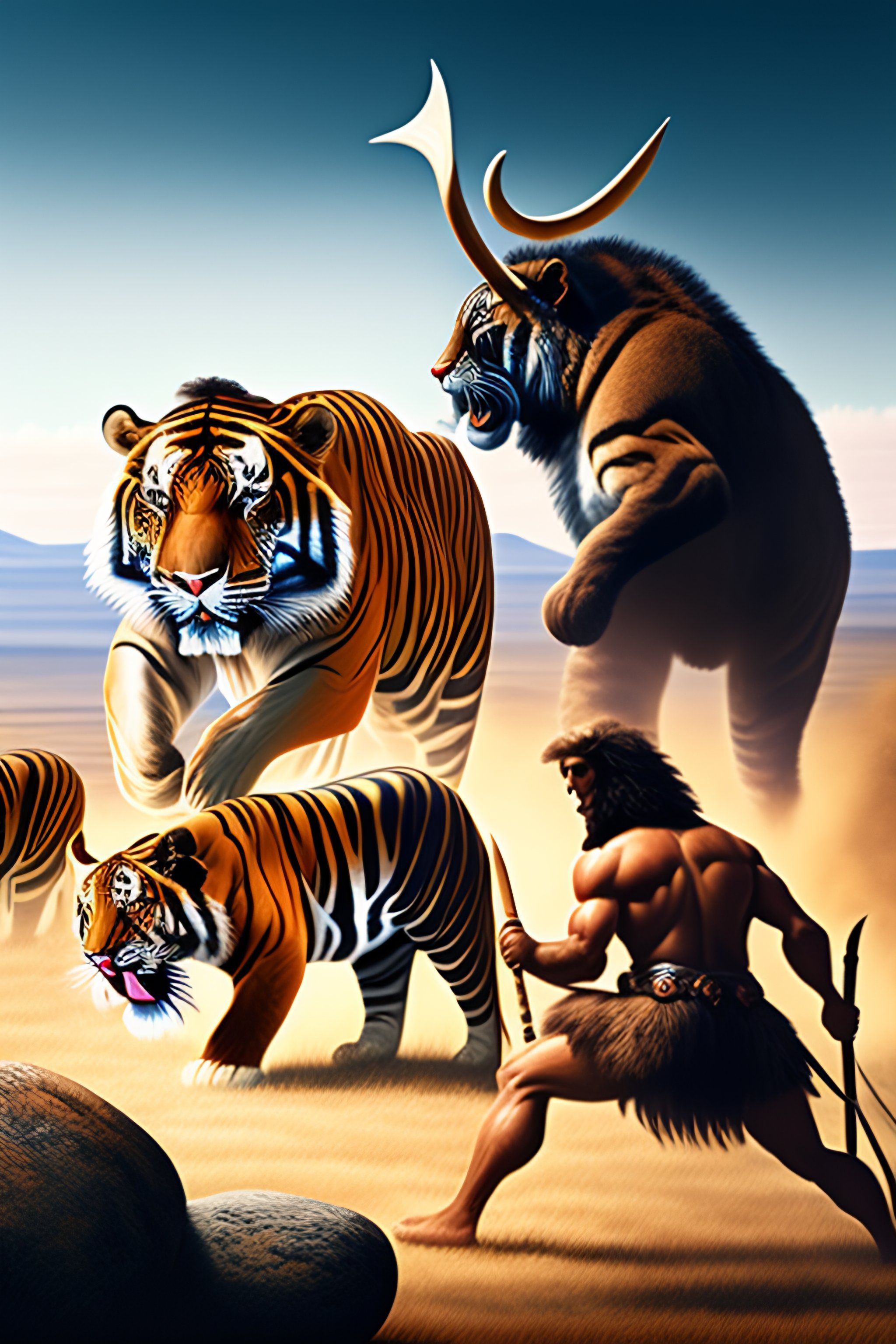 Mammoth fighting a saber tooth tiger in ancient landscape while cavemen watch from a distance with spears in hand