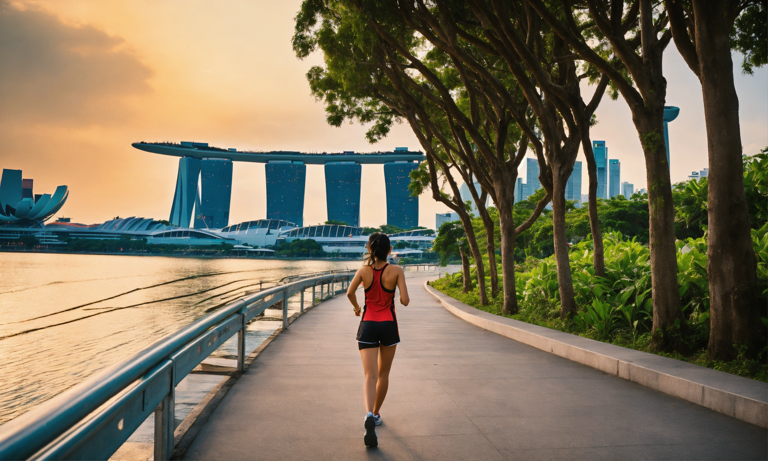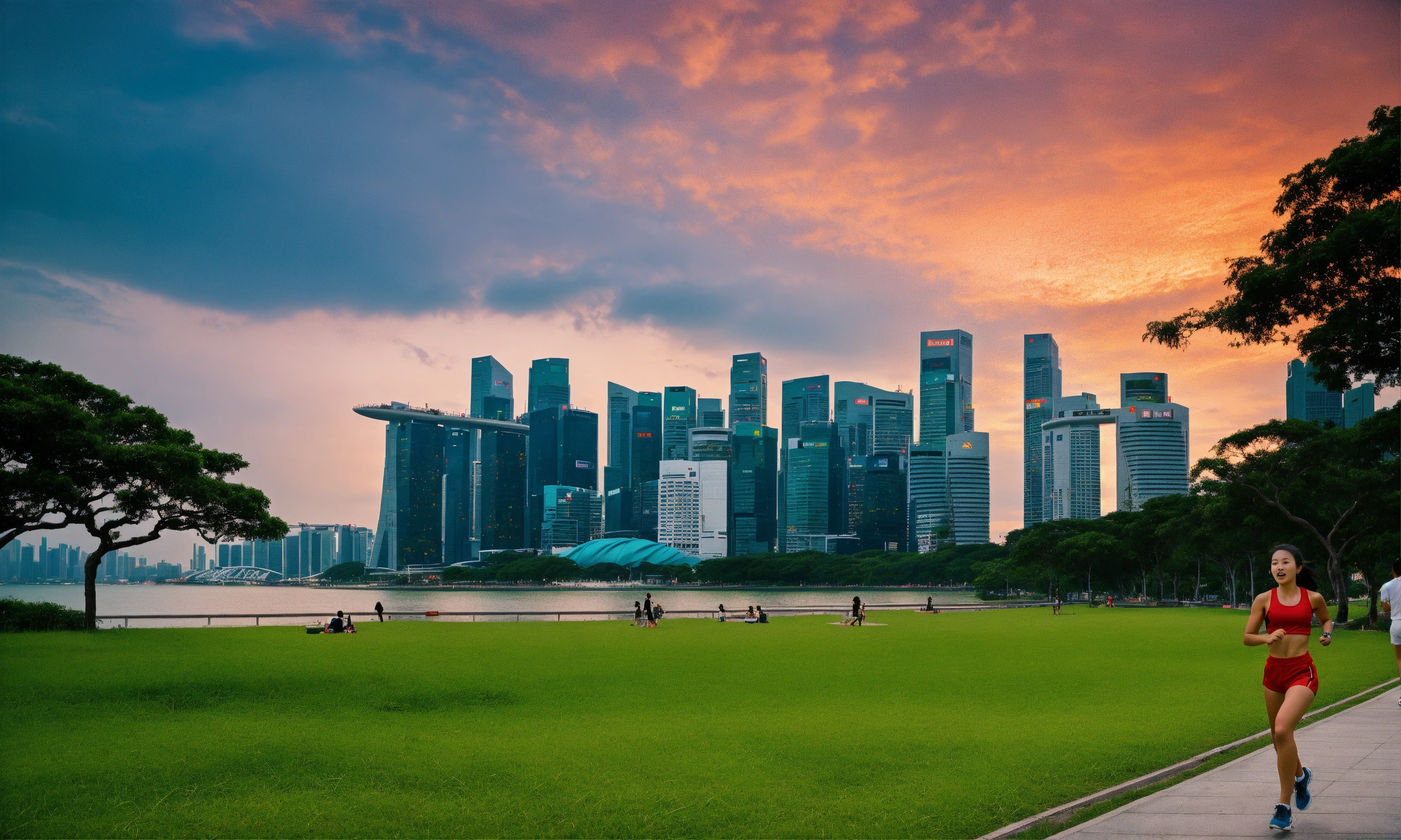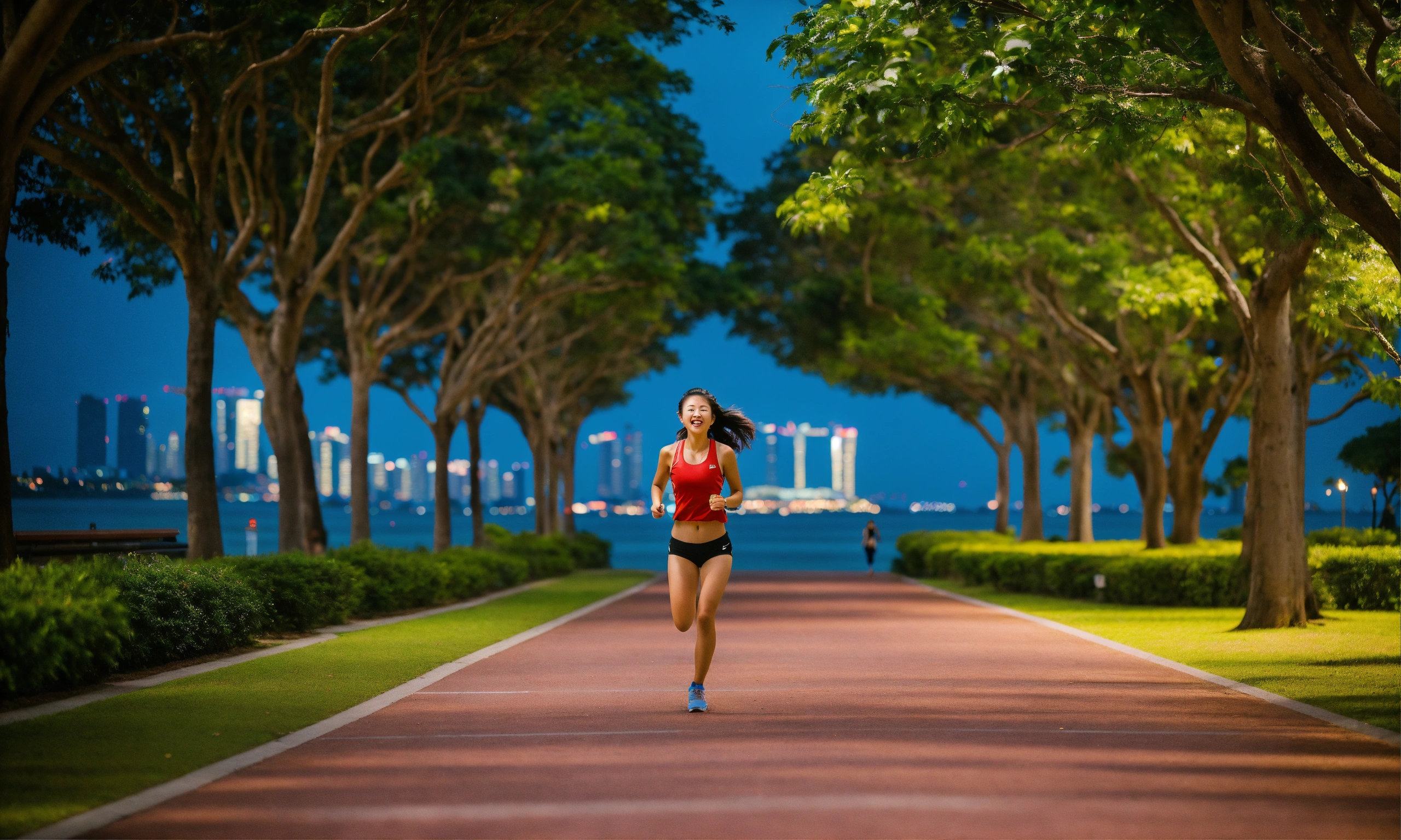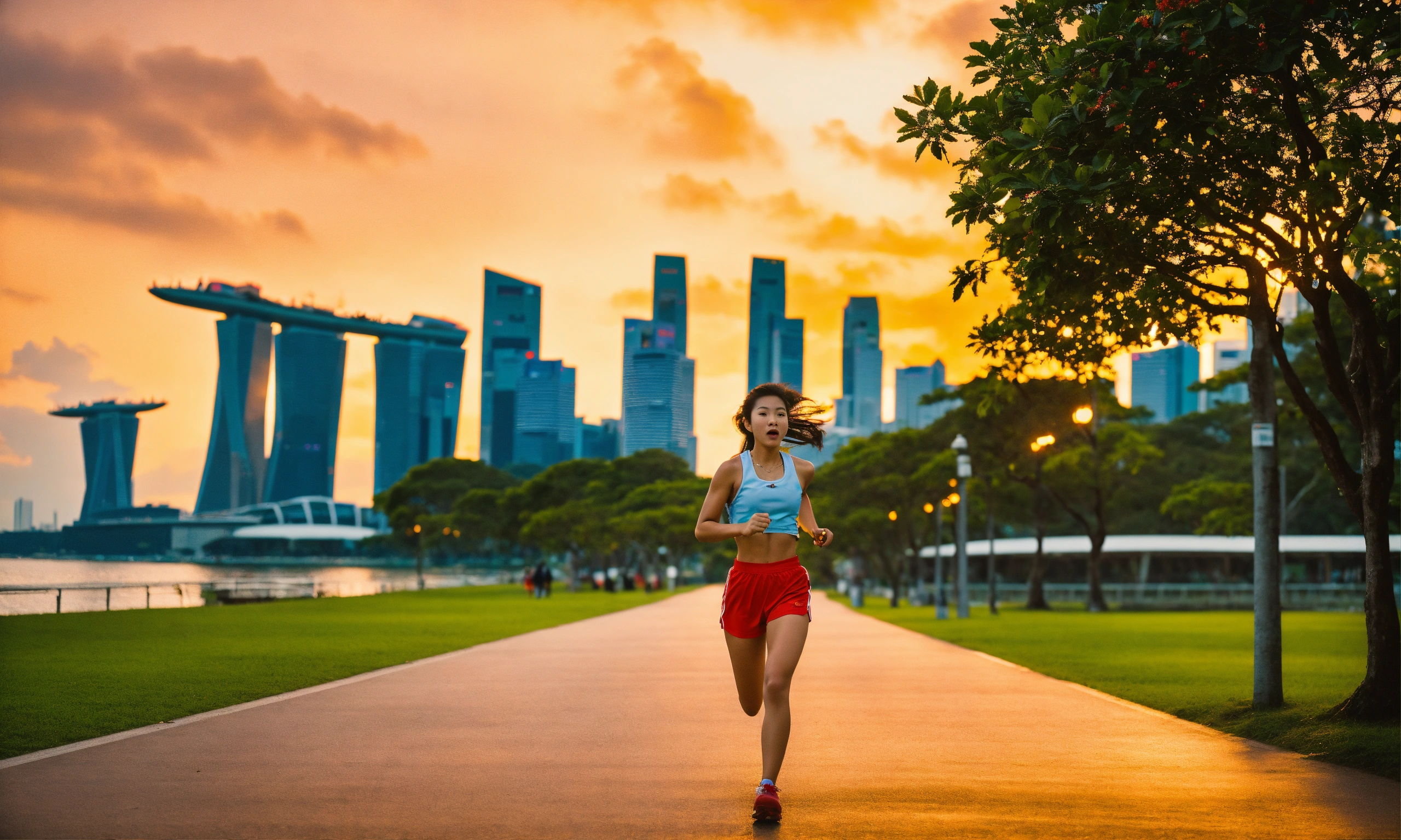 Full establishing shot of singapore's east coast park, towering trees, backdrop is the iconic singapore cityscape rises with modern skyscrapers and marina barrage, an athletic 18-year-old asian girl running in the centre of the screen, a sleeveless plain red singlet, determined expression and vibrant attire symbolize the energy of this unique urban park, a leica summicron 35mm f2.0 lens to enhance the colors, shooting with kodak portra 400 film to add cinematic richness.