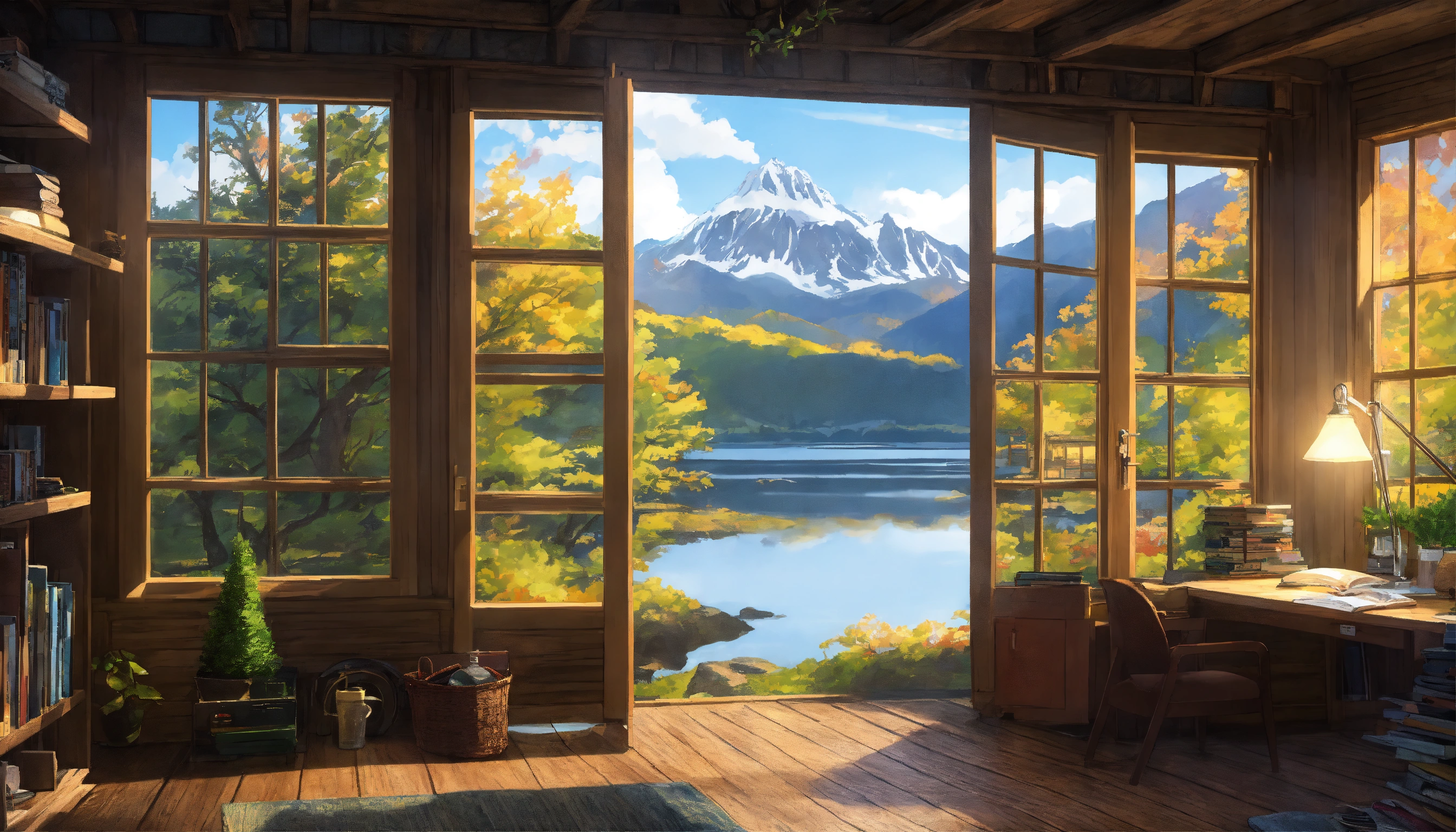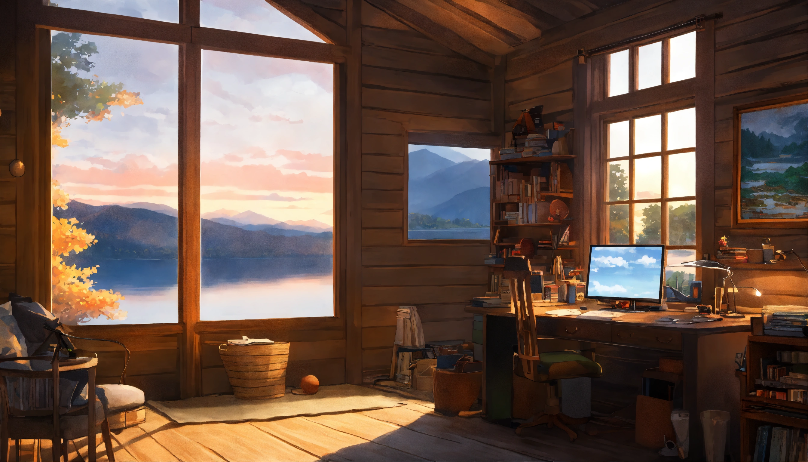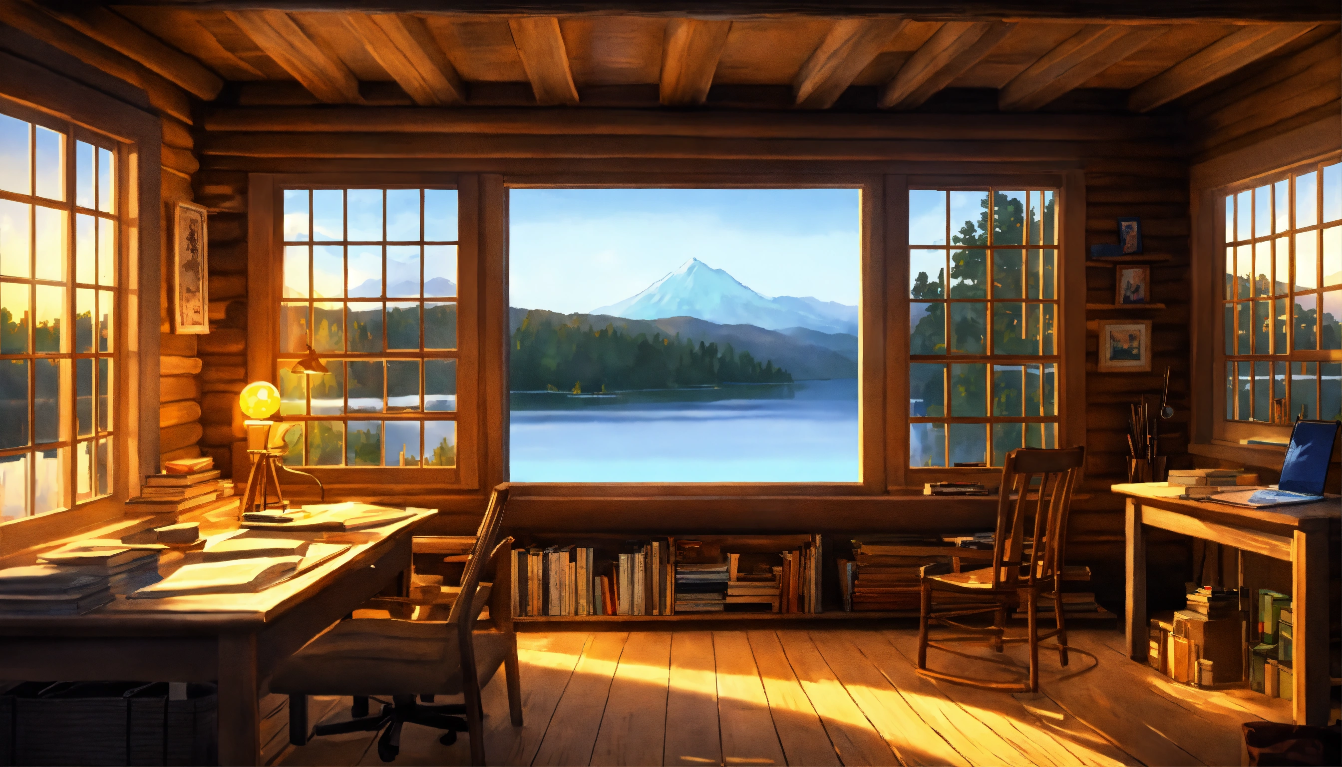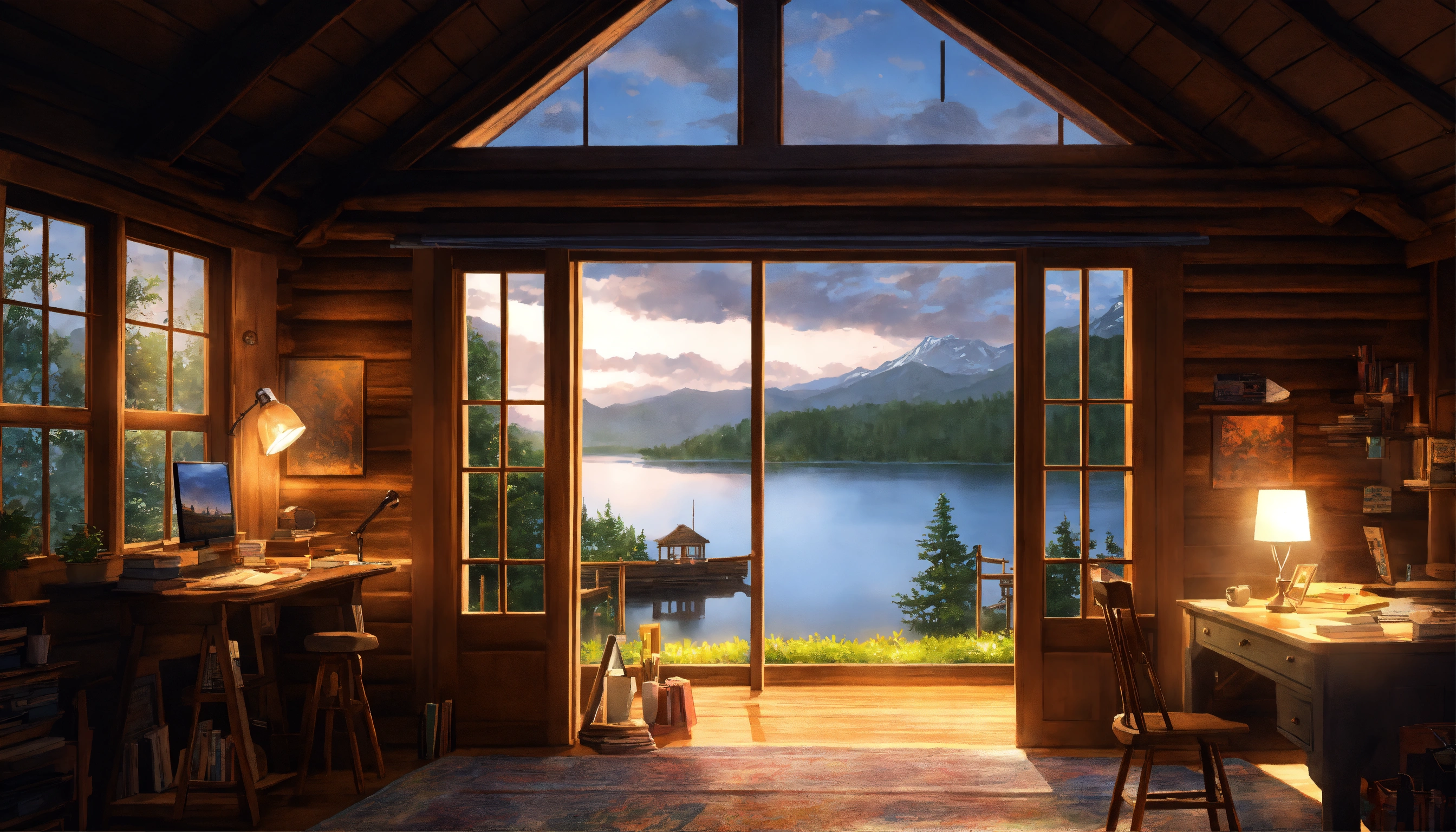 Study room in log cabin, big window, anime studio ghibli, grey acrylic washed image, view of lake, night