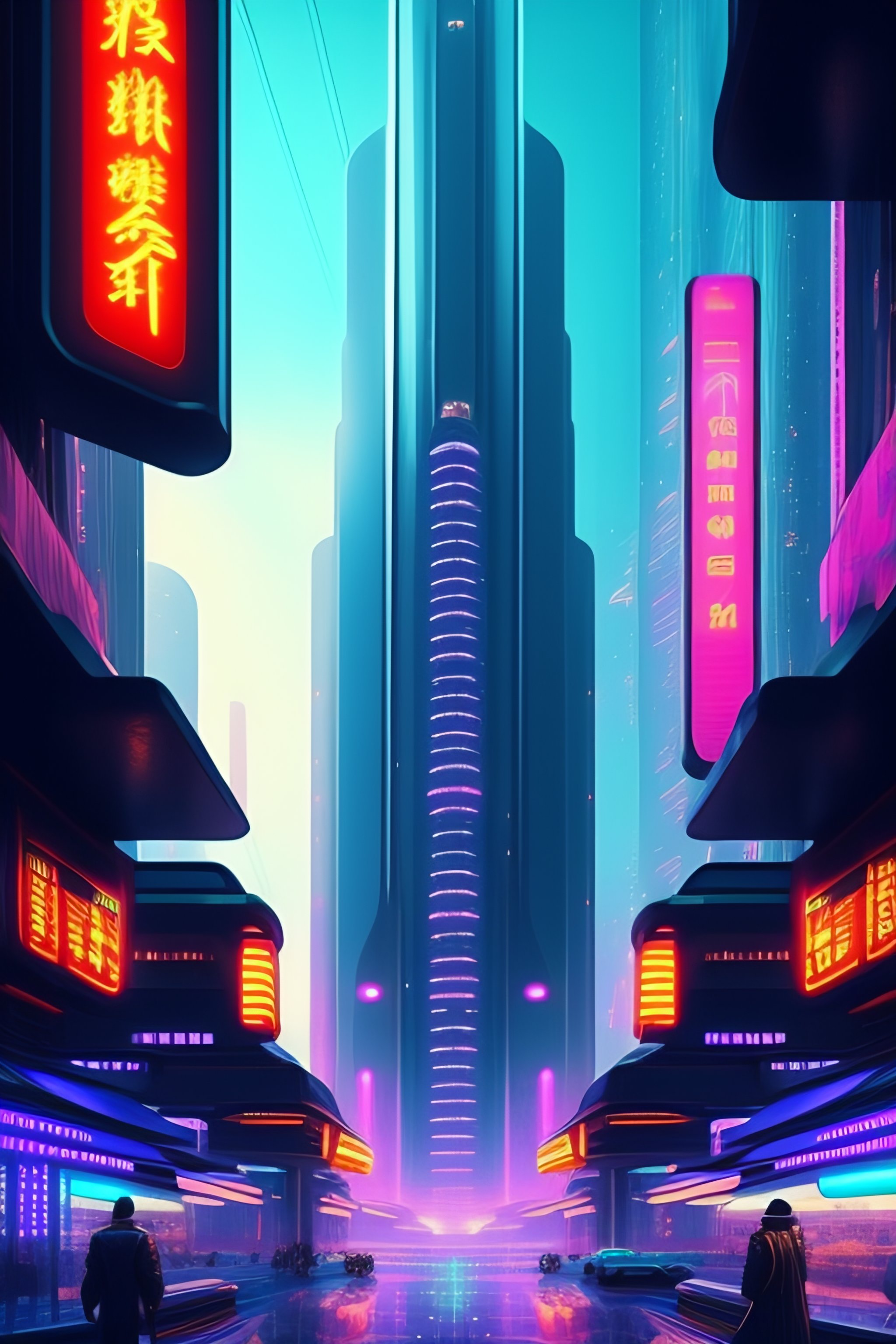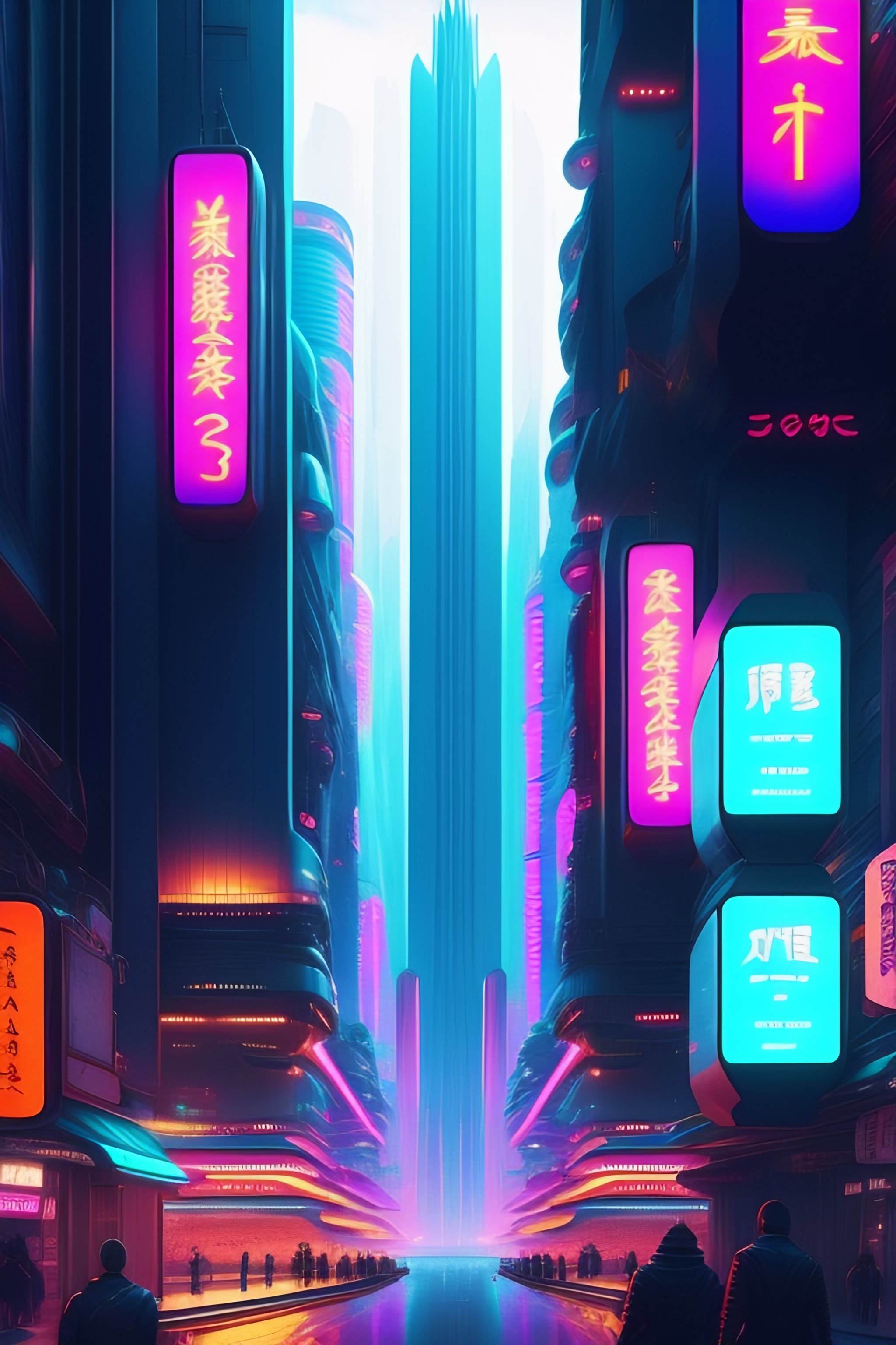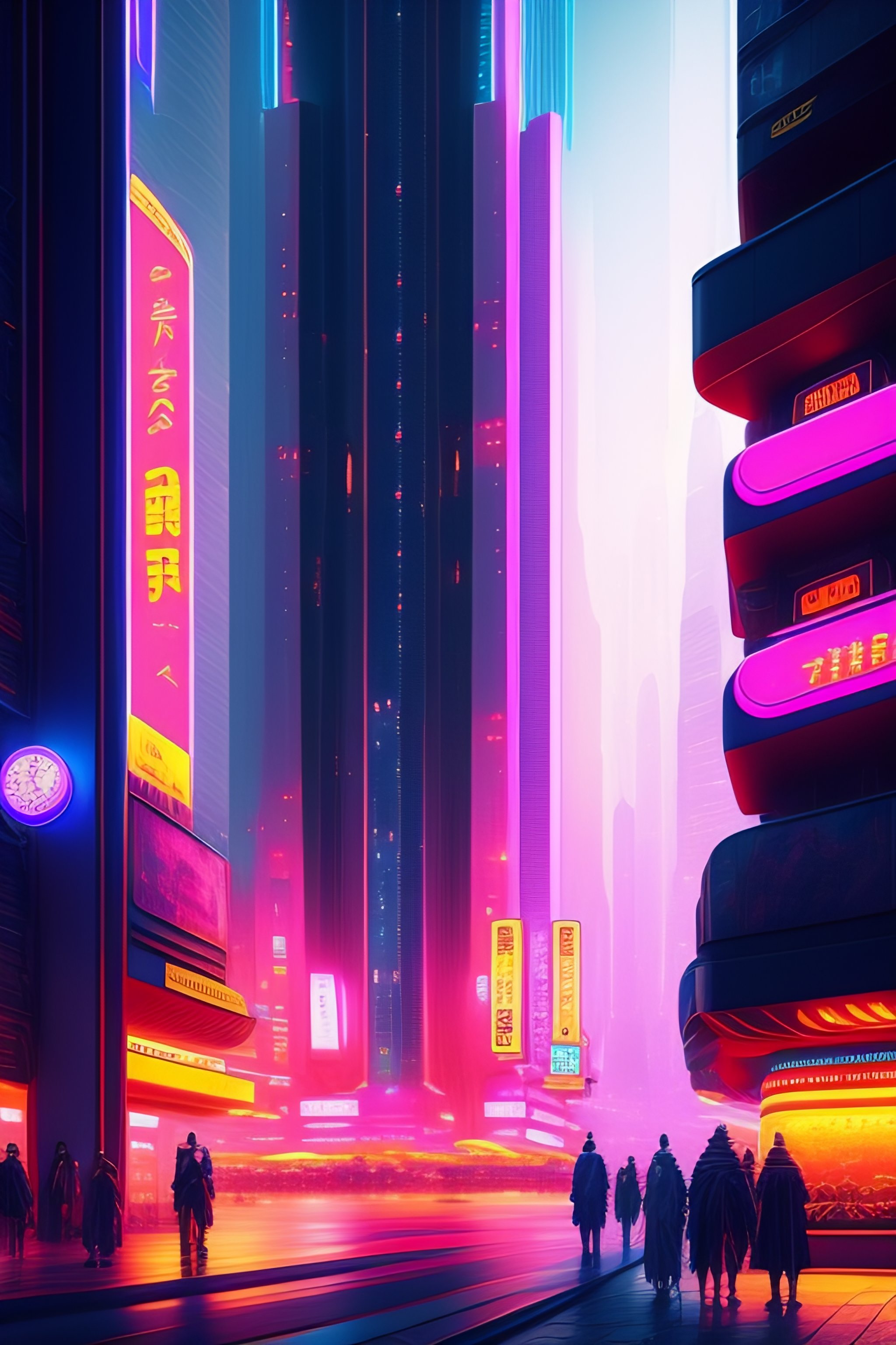 Imagine a futuristic city where advanced technology and neon lights mix with traditional japanese architecture and culture. the streets are bustling with people, robots, and flying cars, and towering skyscrapers and holographic advertisements dominate the skyline. take a photo of this bustling metropolis, focusing on the unique blend of anime and cyberpunk elements that make it so distinct."