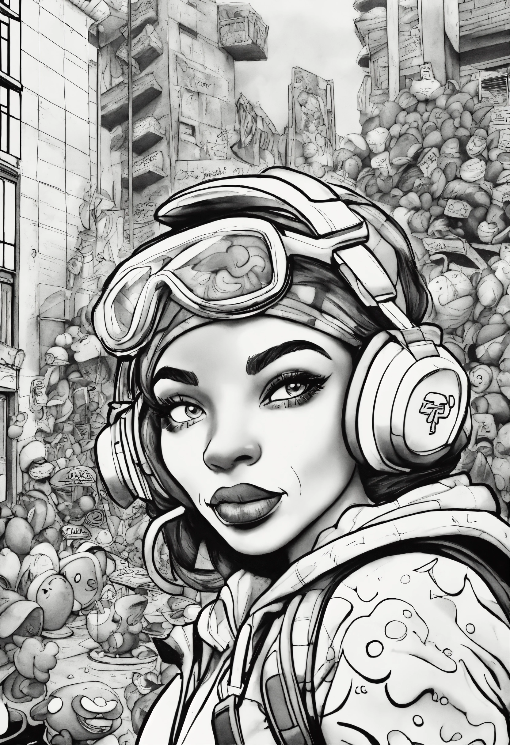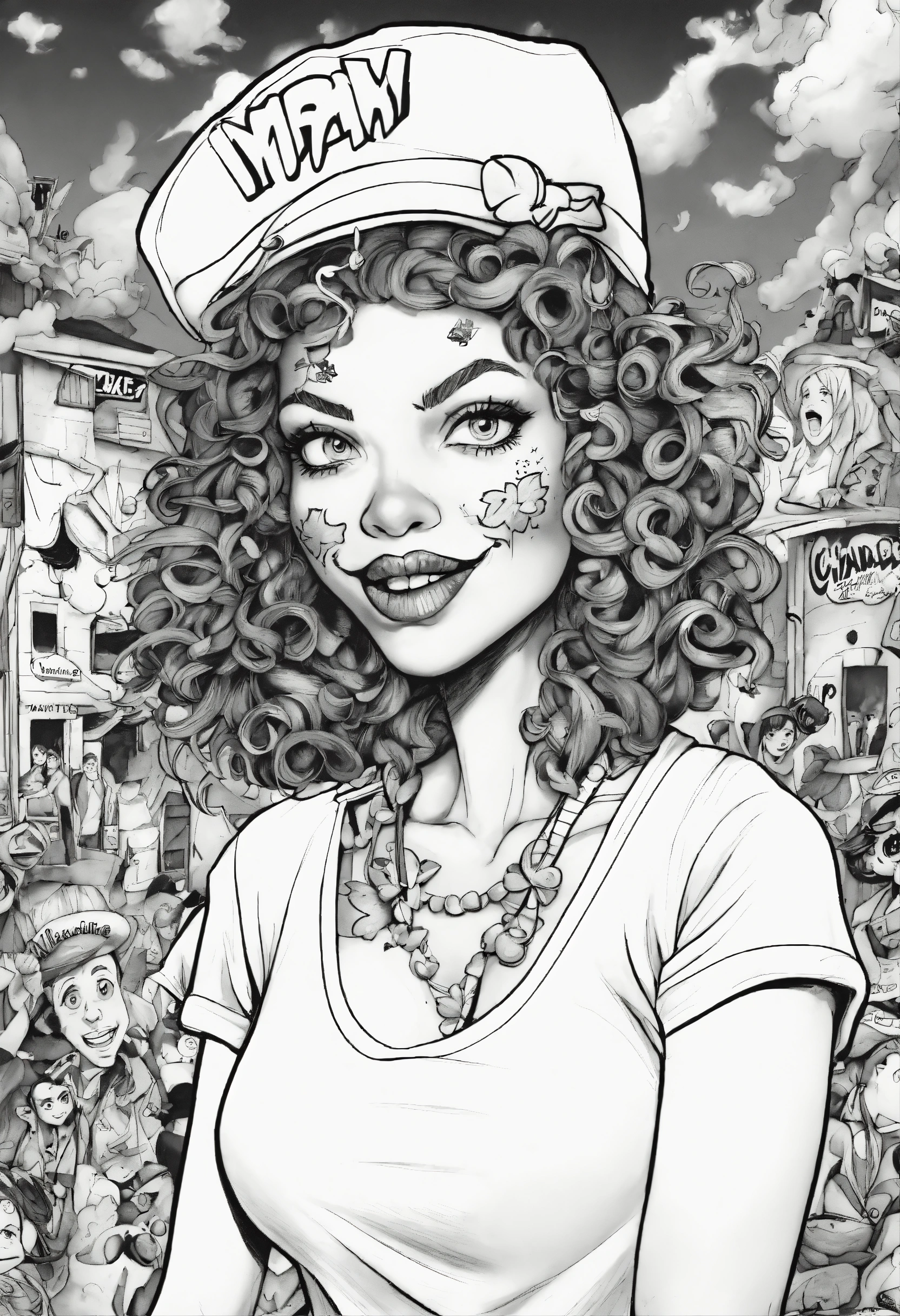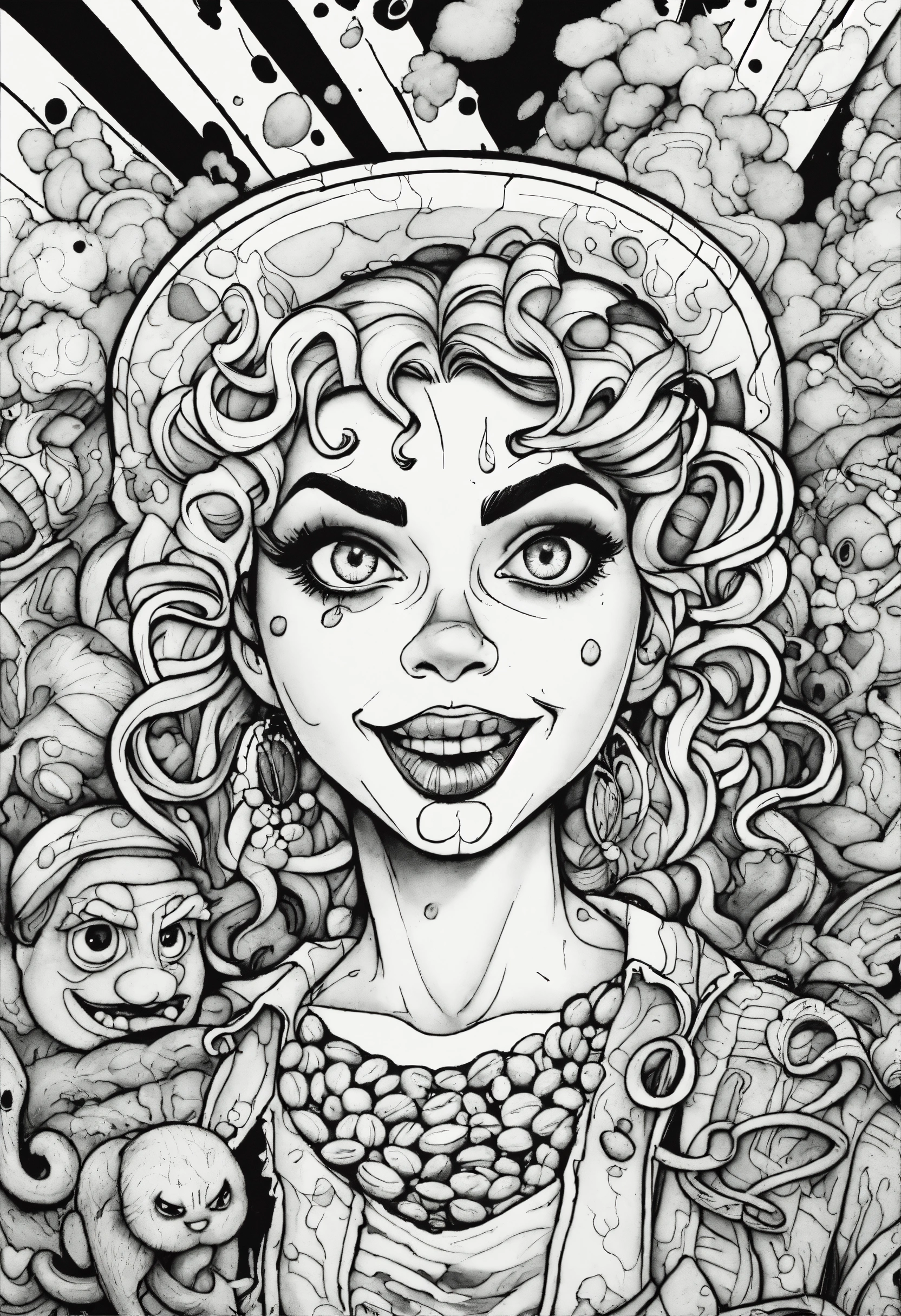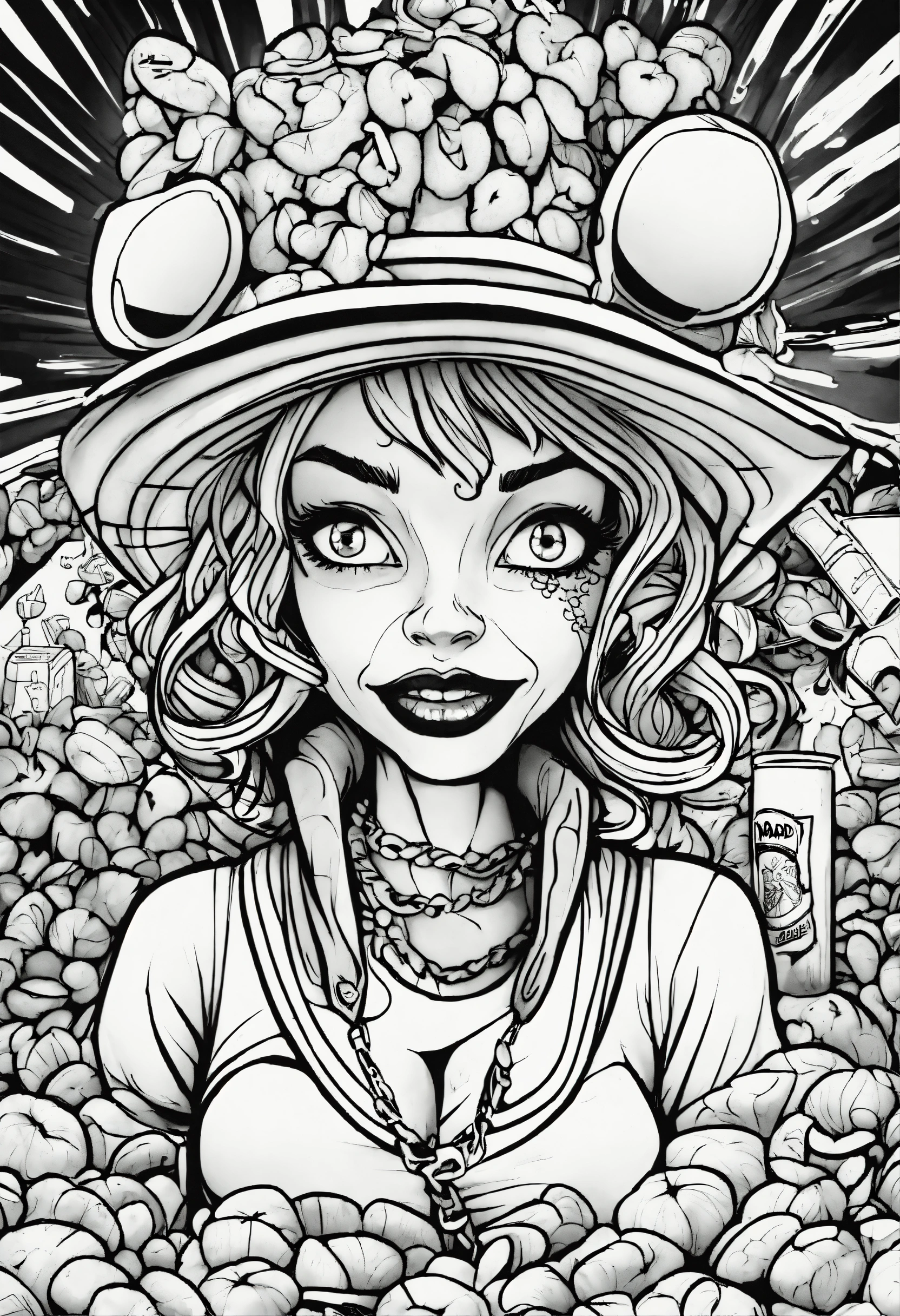 Coloring page for adults, graffiti art, mad magazine character crazy nuts, woman, black and white, caricature, white background