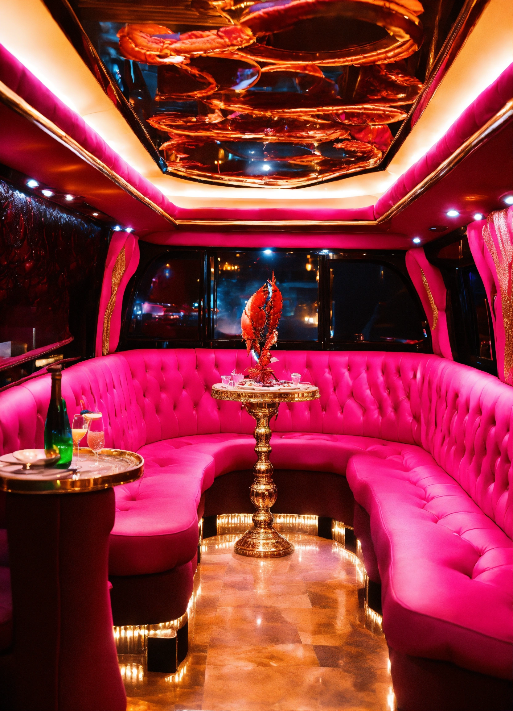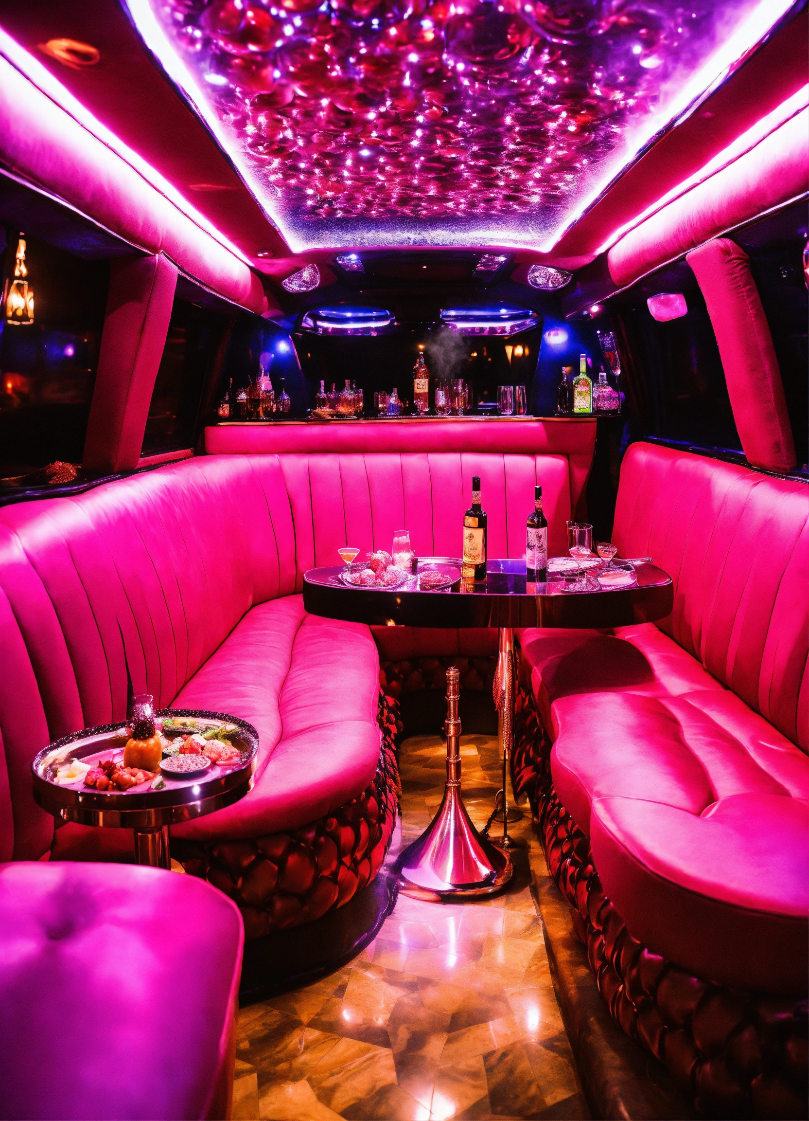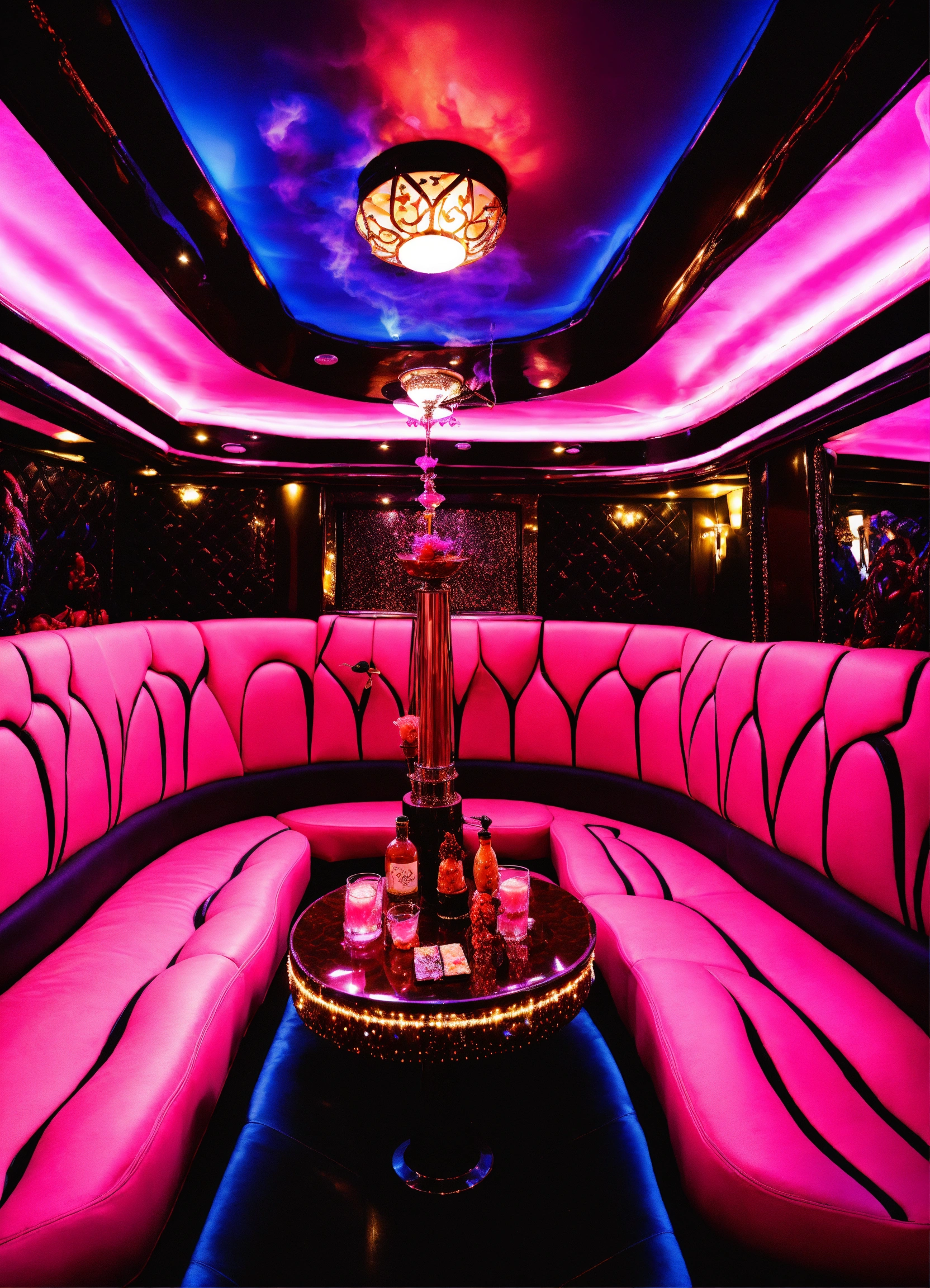 Limousine van, hookah lounge, luxurious hookahs, affluent, rich, decadent, debauchery, shisha restaurant, mood lighting, pink hookah, food platter, luxury food presentation, lobster & caviar, smoking room, floor mist, pretty cocktails