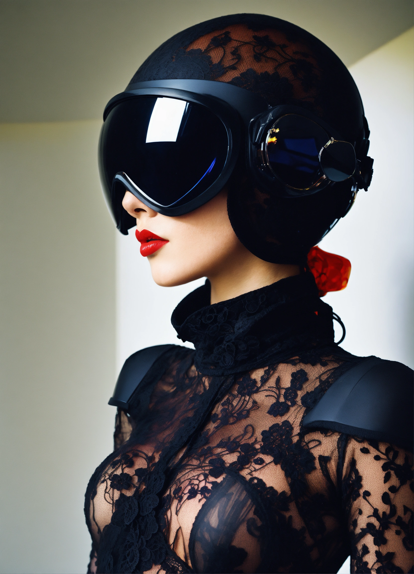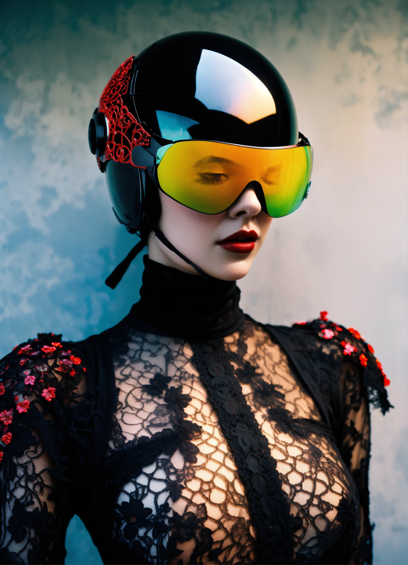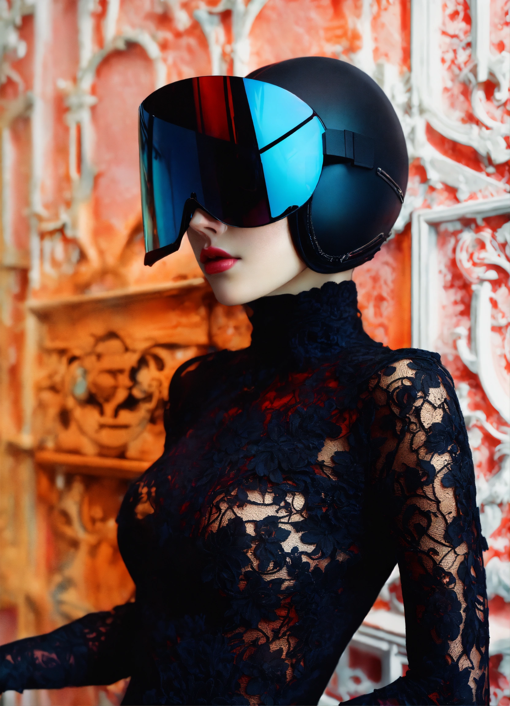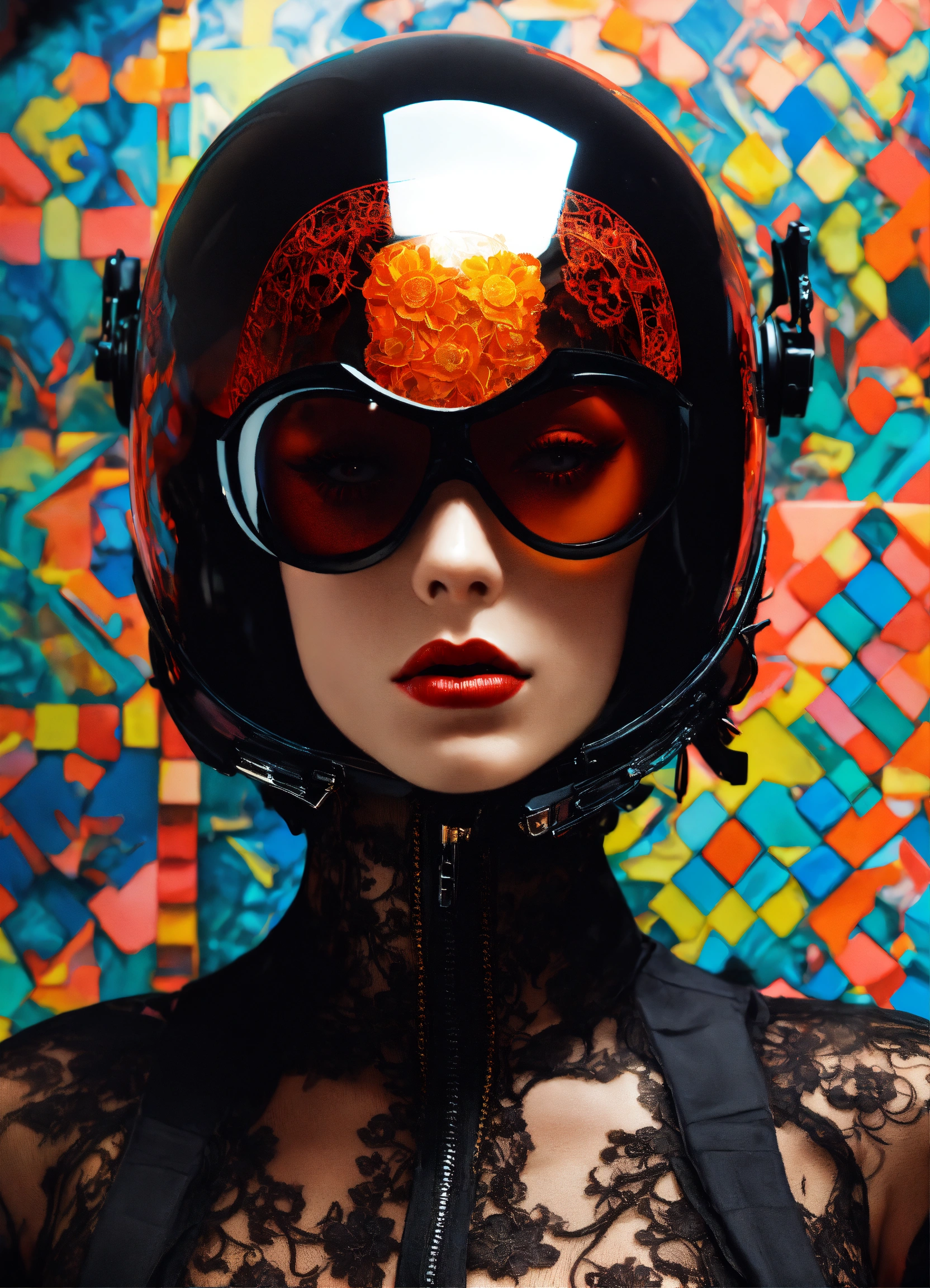 Deflagration of vibrant hues half body shot photography, a hi tech sci-fi well shaped body woman, in a black tight-fitting lace, with her transparent plexiglass helmet and sunglasses, in front of a white wall, 80 degree view, art by sergio lopez, natalie shau, james jean and salvador dali