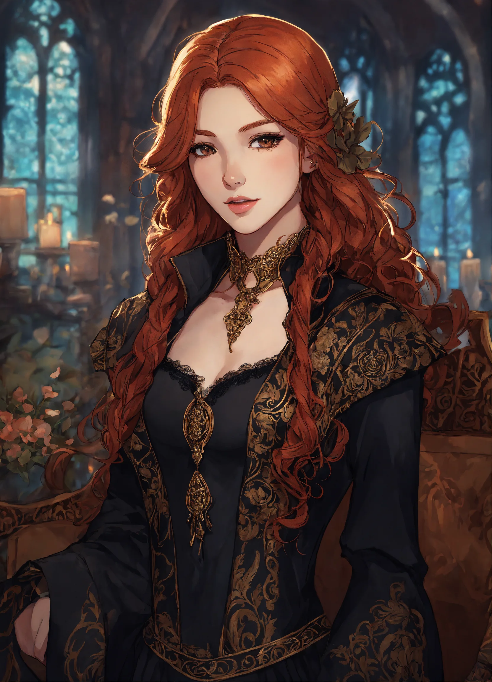 Beautiful redhead woman in the style of anime castlevania, castlevania, anime, brown eyes, manga, detailed, black clothes, dress, style of lenore from castlevania, portrait, detailed, pretty, gorgeous, attractive face