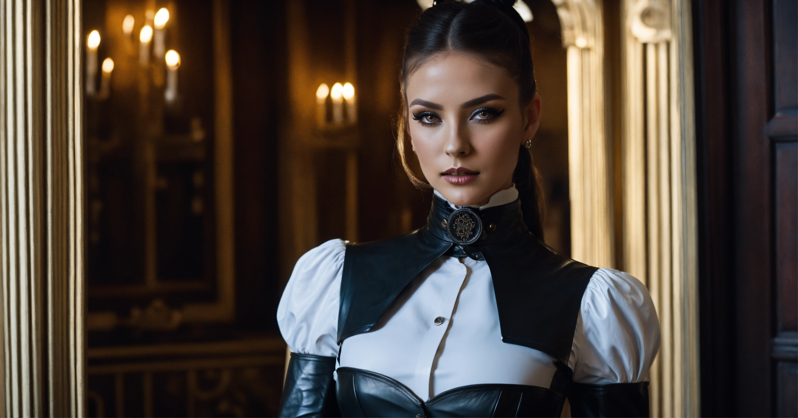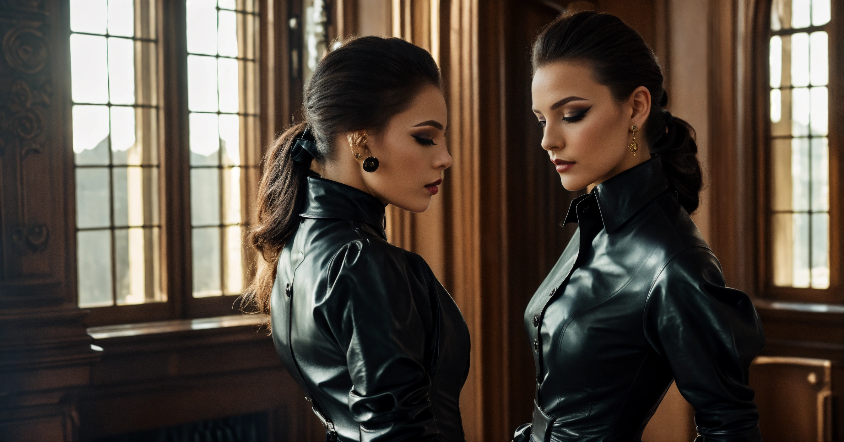 Two stunning french seductress women fashion model, brunette straight high ponytail, black leather corset, long strict victorian governess wide black long leather shirt dress with long big puff sleeves and big buttons, mansion room with sunny daylight, white office shirt collar, leather gloves, eyeliner makeup, black leather boots